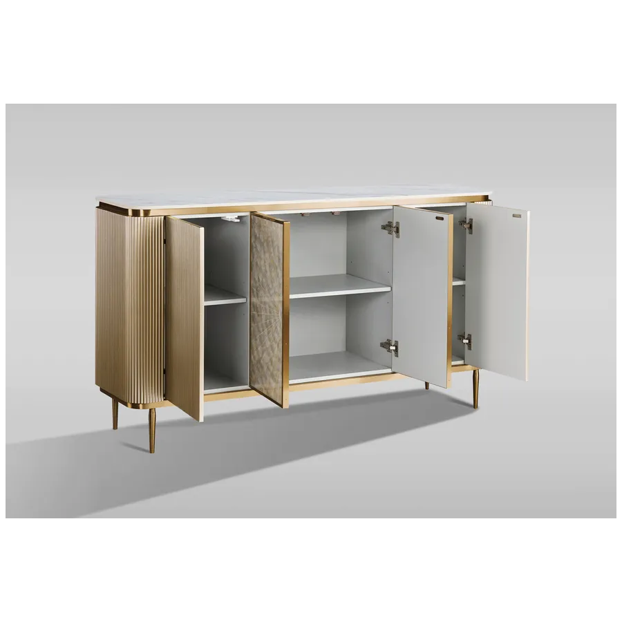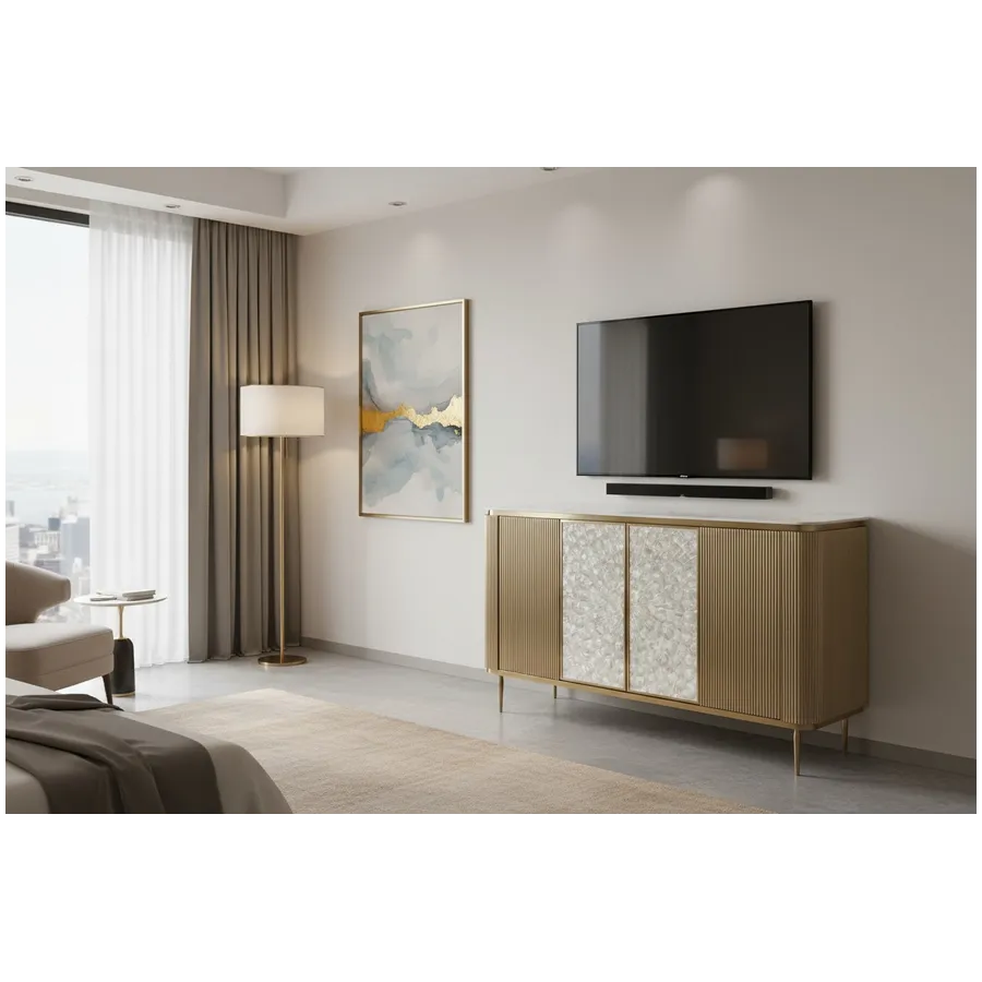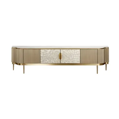 Korpus mebla został wykończony w odcieniu szampańskiego złota, z dekoracyjnymi ryflowanymi panelami drewnianymi, które nadają całości elegancji i nowoczesnego rytmu. Góra komody zwieńczona jest blatem o wykończeniu marmurowym, co dodatkowo podkreśla prestiżowy wygląd mebla i zwiększa jego funkcjonalność.