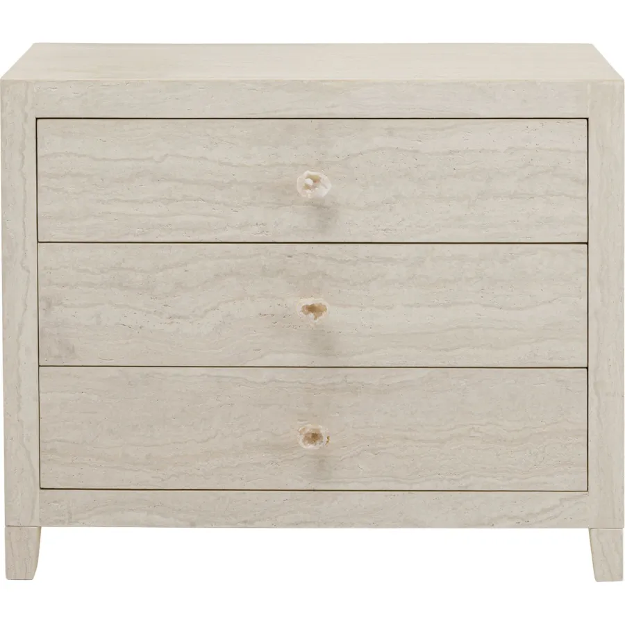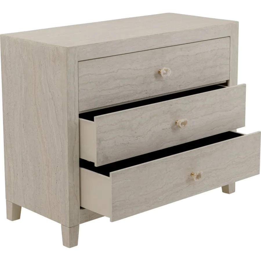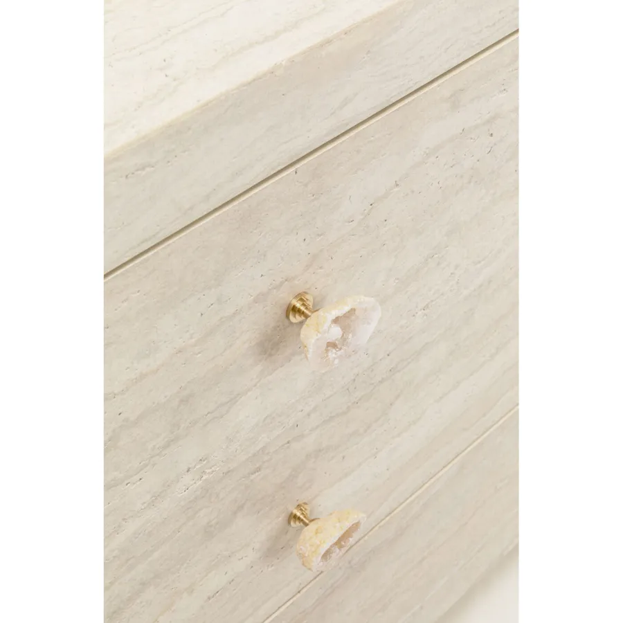 Meble z naszej serii Travertino łączą minimalistyczny design z naturalnym urokiem eleganckiego, kamiennego wykończenia. Powierzchnia o otwartych porach zachwyca delikatną, żywą strukturą, która nie tylko wizualnie, ale i dotykowo przypomina prawdziwy trawertyn, nadając wnętrzu głębi. Każdy kąt odsłania nowe niuanse i unikalne usłojenie w delikatnych beżowych tonach – spokojnych, ciepłych i harmonijnych. Dzięki specjalnej powłoce powierzchnia pozostaje trwała i łatwa w czyszczeniu. Uchwyty z lśniących geod z kryształu górskiego dodają luksusowego akcentu i symbolizują przejrzystość i równowagę. Komoda z trzema szufladami i wygodną funkcją cichego domykania oferuje dużą przestrzeń do przechowywania i stylowo pasuje do sypialni, salonów lub przedpokoju.