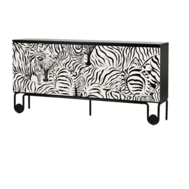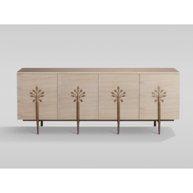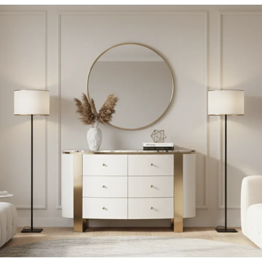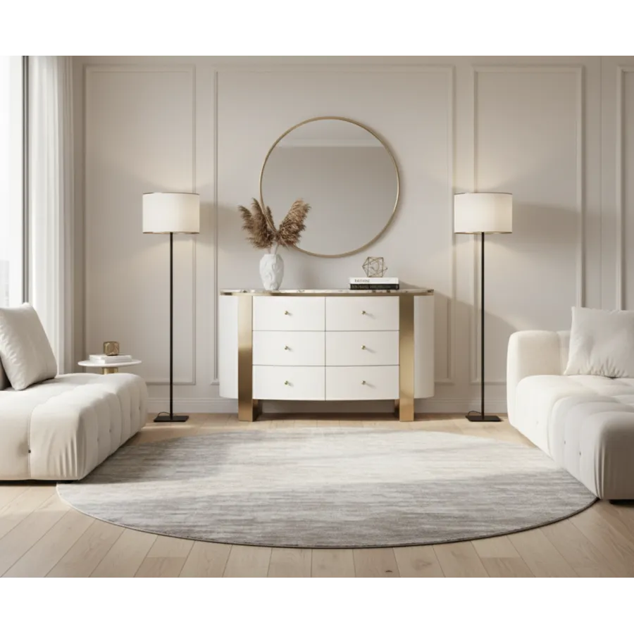 W prezentowanym wnętrzu komoda staje się centralnym punktem aranżacji. Towarzyszą jej symetrycznie ustawione lampy podłogowe o minimalistycznej formie oraz okrągłe lustro w złotej ramie, podkreślające elegancję i spójność kompozycji. Dekoracje na blacie, takie jak ceramiczny wazon i geometryczna rzeźba, dopełniają estetyki nowoczesnego, jasnego salonu.