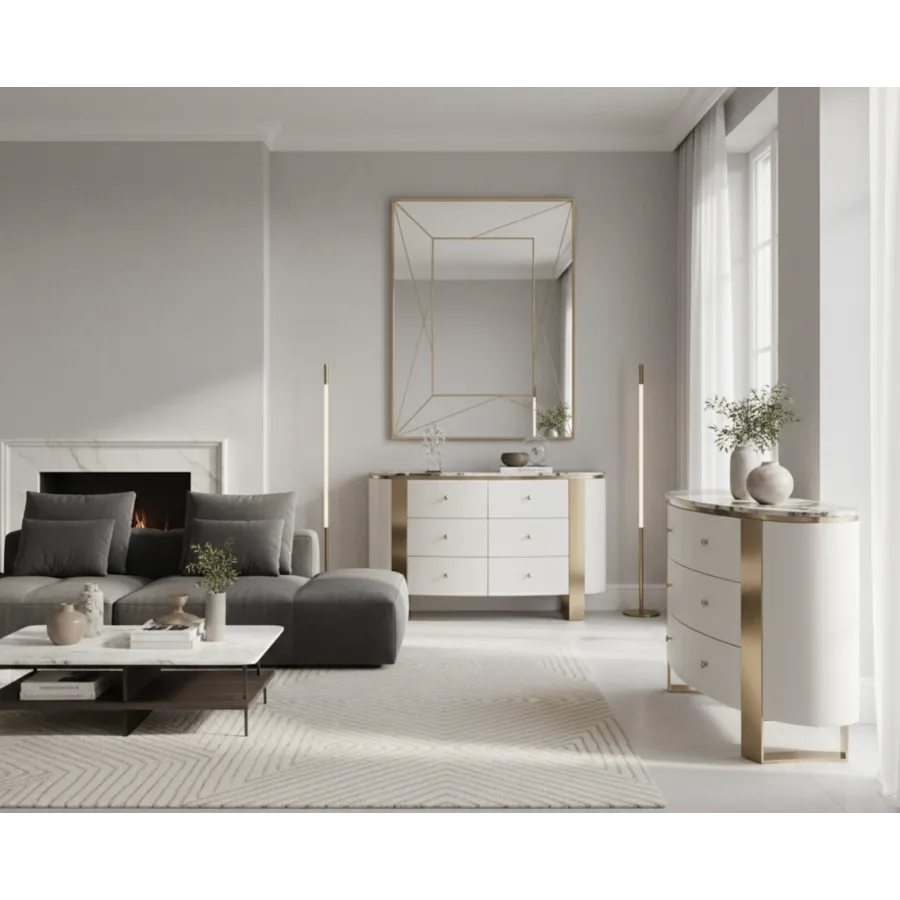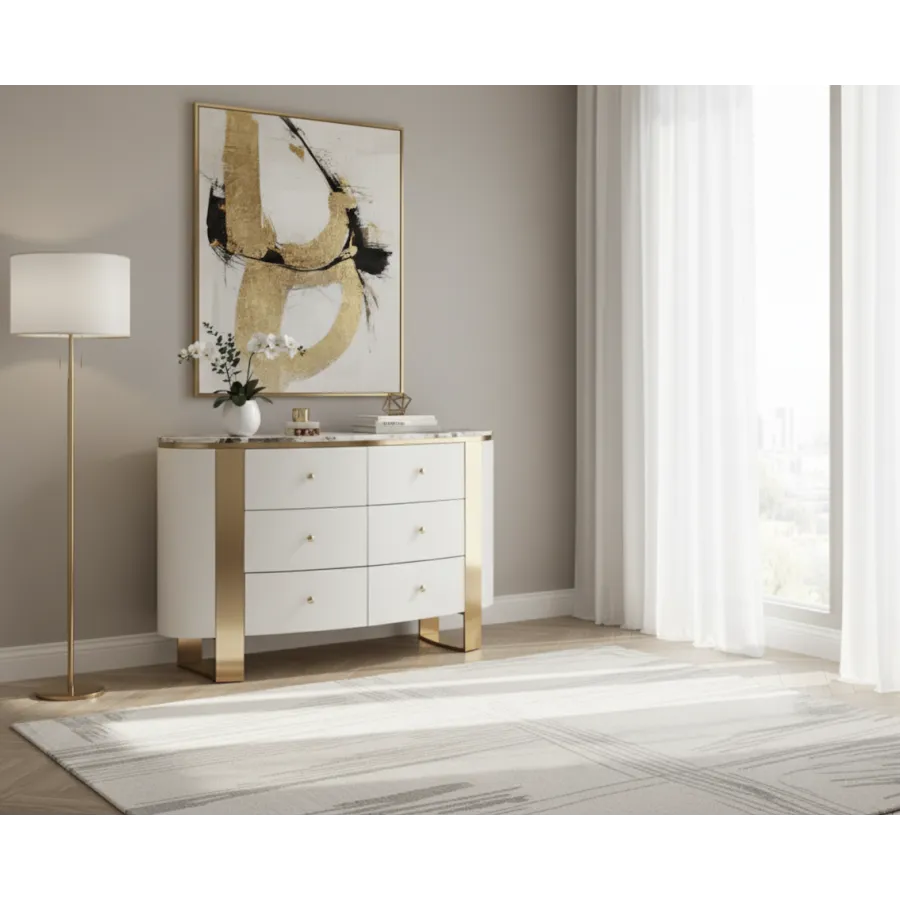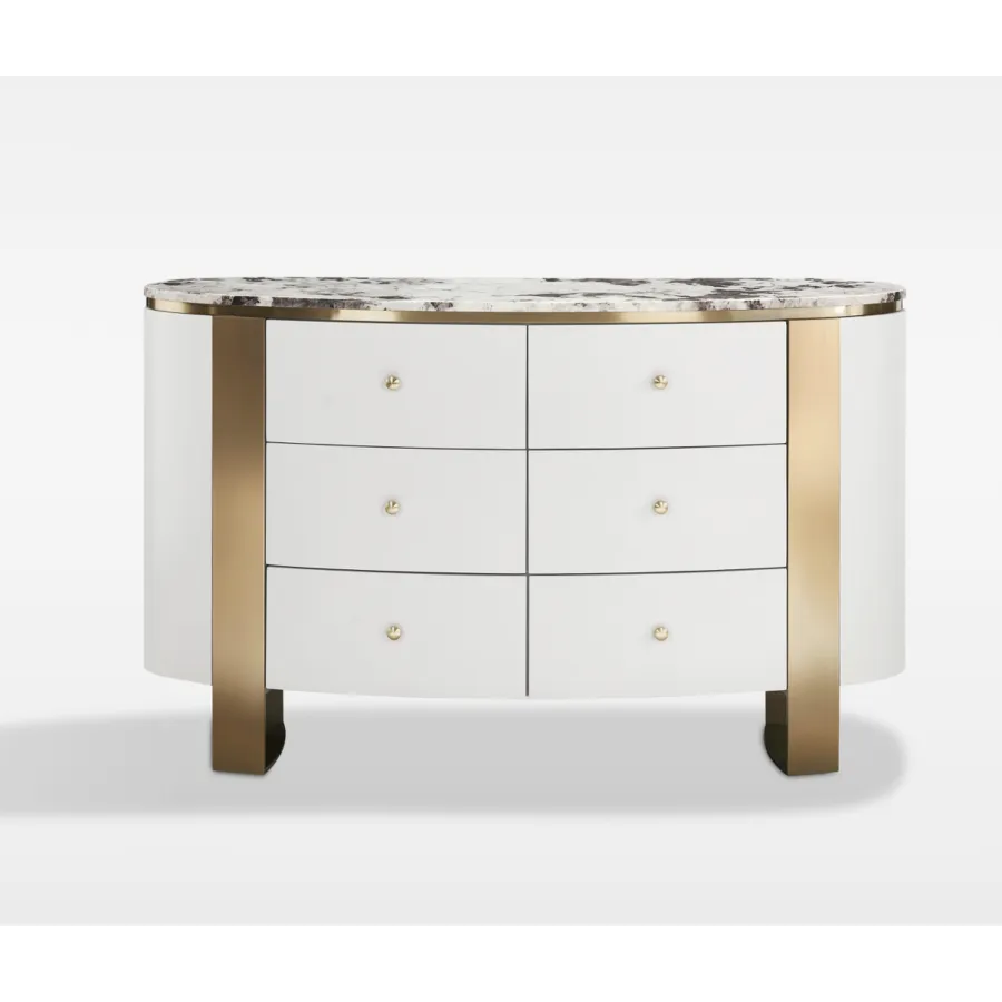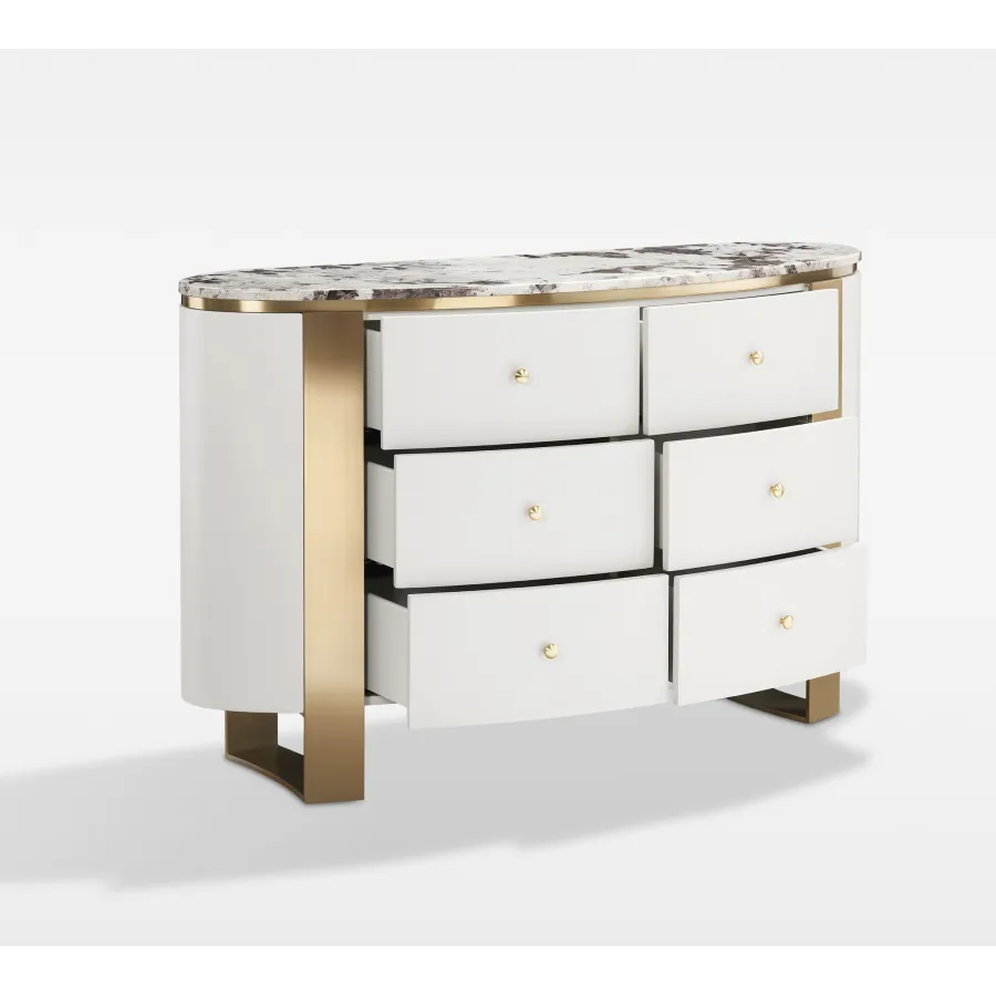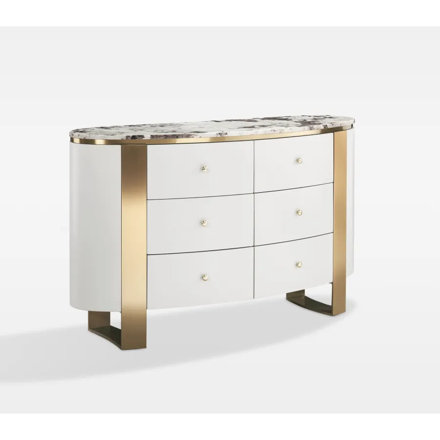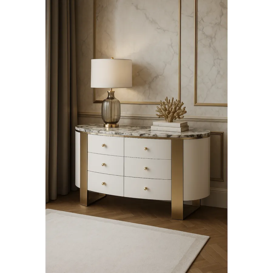 Ta owalna komoda w odcieniu złamanej bieli zachwyca subtelną elegancją i ponadczasowym designem. Jej charakterystycznym elementem są pionowe panele oraz nogi w kolorze szczotkowanego złota, które płynnie łączą się z zaoblonymi bokami mebla, tworząc harmonijną i nowoczesną sylwetkę. Front komody zdobi sześć smukłych szuflad z drobnymi, złotymi uchwytami o biżuteryjnym charakterze. Marmurowy blat — w ciepłej tonacji beżu, szarości i delikatnych żyłowań — dodaje całości luksusowego wykończenia.