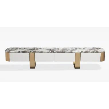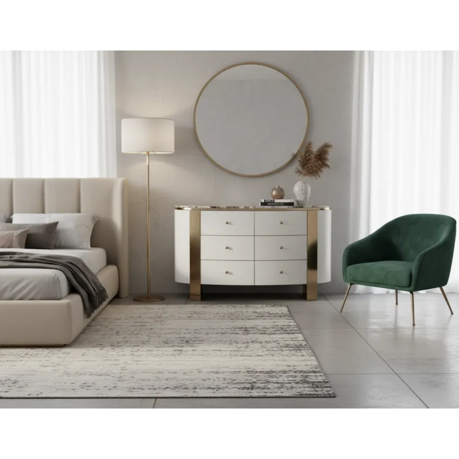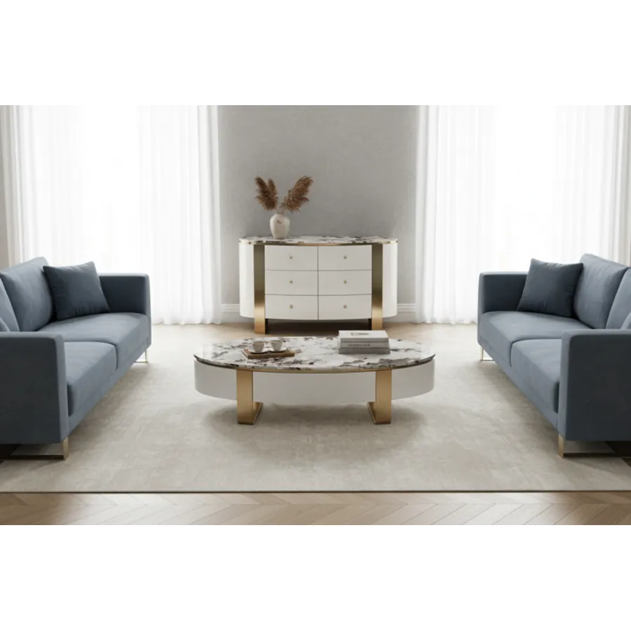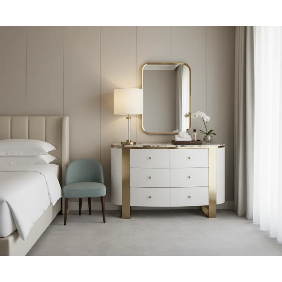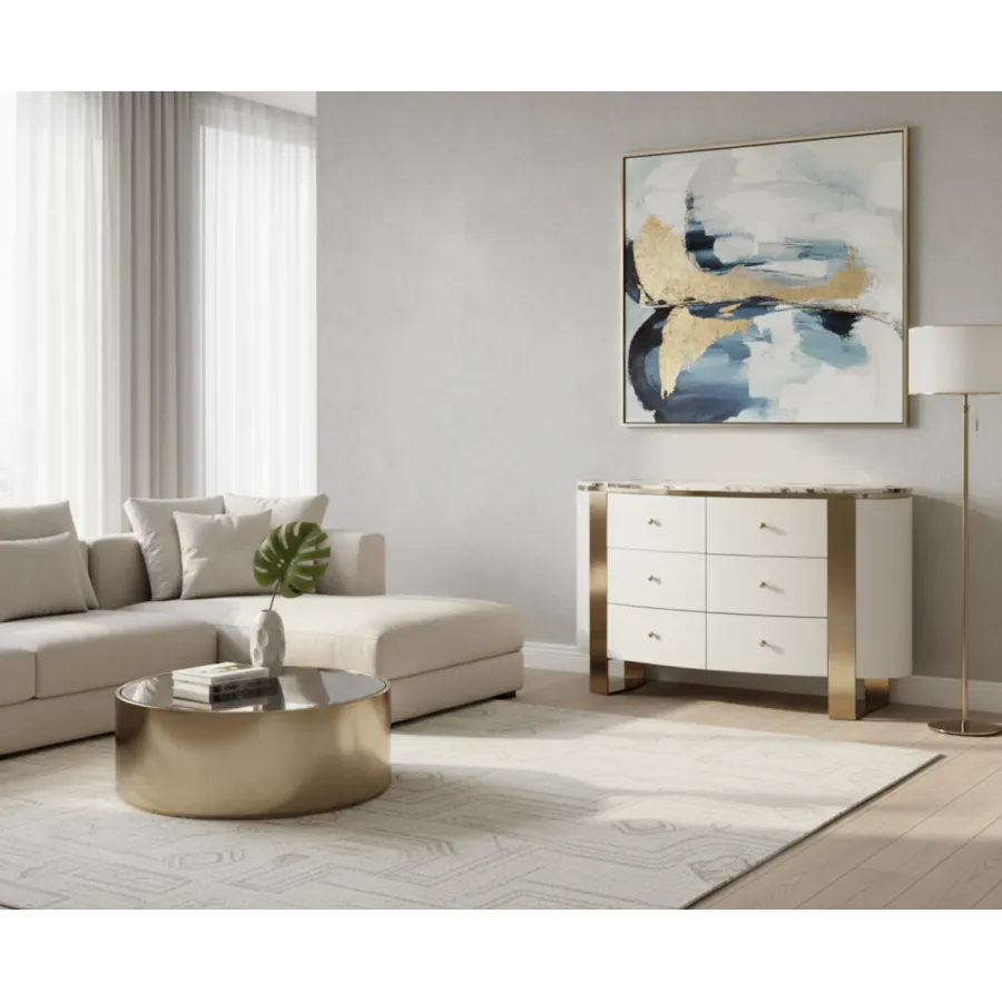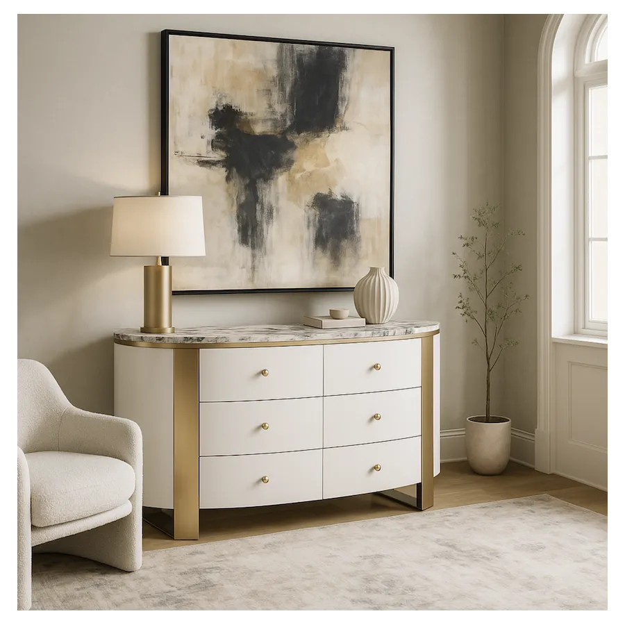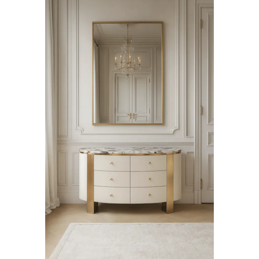 Ta owalna komoda w odcieniu złamanej bieli zachwyca subtelną elegancją i ponadczasowym designem. Jej charakterystycznym elementem są pionowe panele oraz nogi w kolorze szczotkowanego złota, które płynnie łączą się z zaoblonymi bokami mebla, tworząc harmonijną i nowoczesną sylwetkę. Front komody zdobi sześć smukłych szuflad z drobnymi, złotymi uchwytami o biżuteryjnym charakterze. Marmurowy blat — w ciepłej tonacji beżu, szarości i delikatnych żyłowań — dodaje całości luksusowego wykończenia.