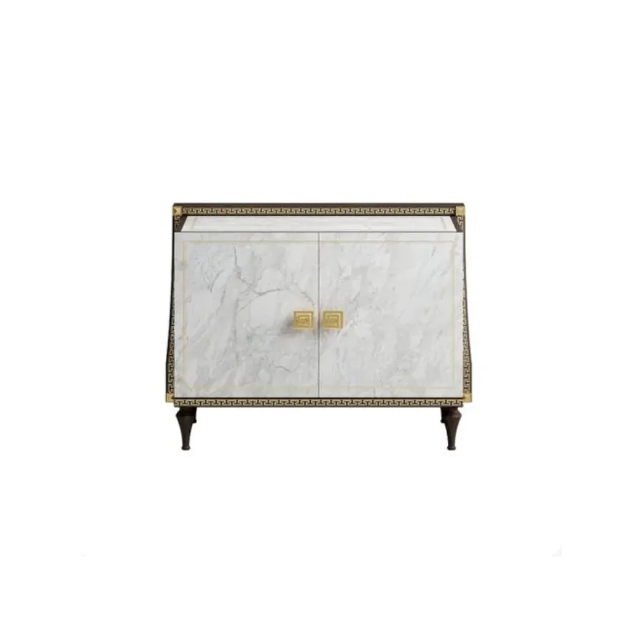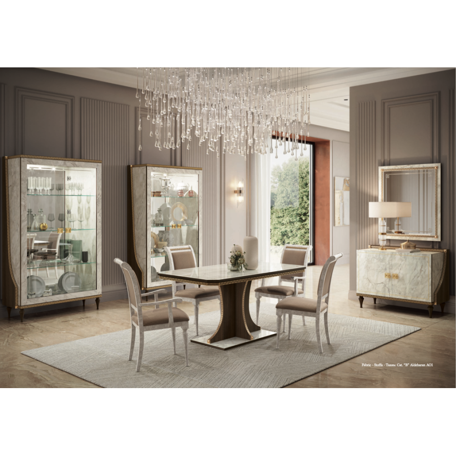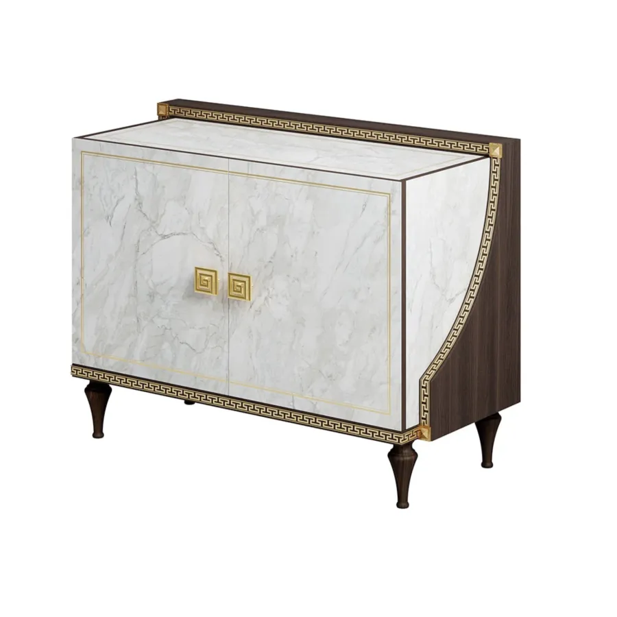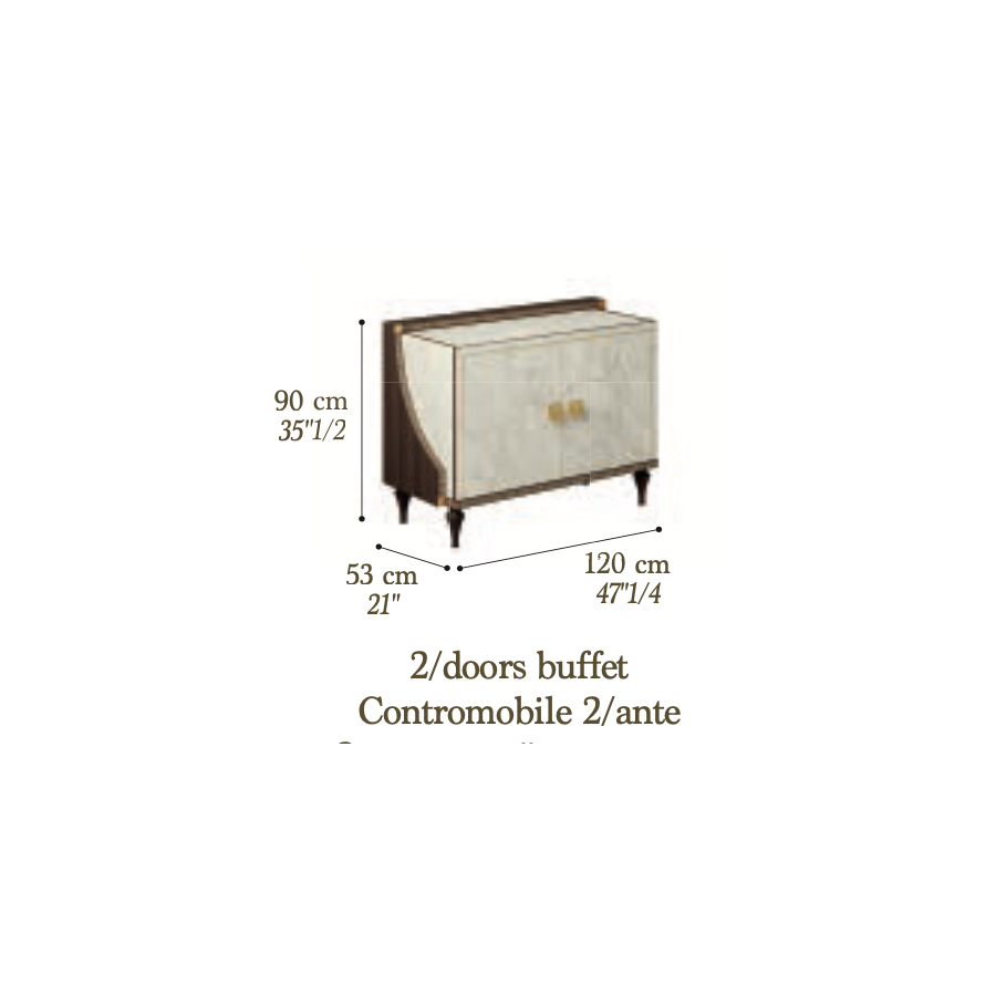 Strona wykończona drewnem orzechowym obejmuje wewnętrzną strukturę wykończoną błyszczącym marmurem z Carrary, ożywiając wyrafinowaną kombinację kolorów, ozdobioną neoklasycznymi greckimi progami ze złotym wykończeniem. Skrupulatna dbałość o detale sprawia, że witryna jest głównym bohaterem salonu. Kryształy, szklane drzwi, lustrzany panel tylny i 24-karatowe platerowane uchwyty tworzą nieoczekiwane odblaski i wyrafinowaną grę światła.