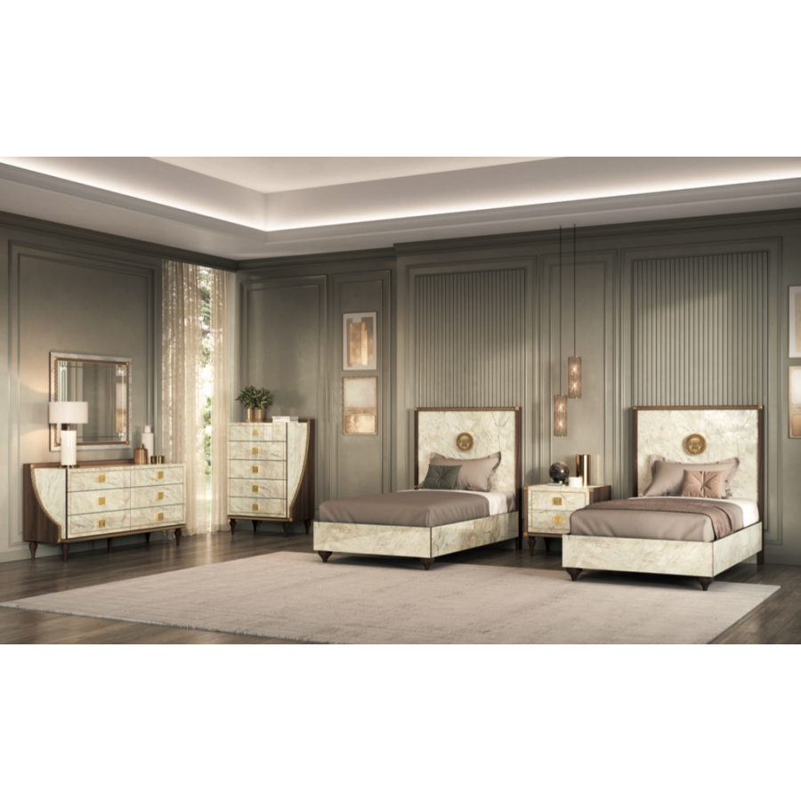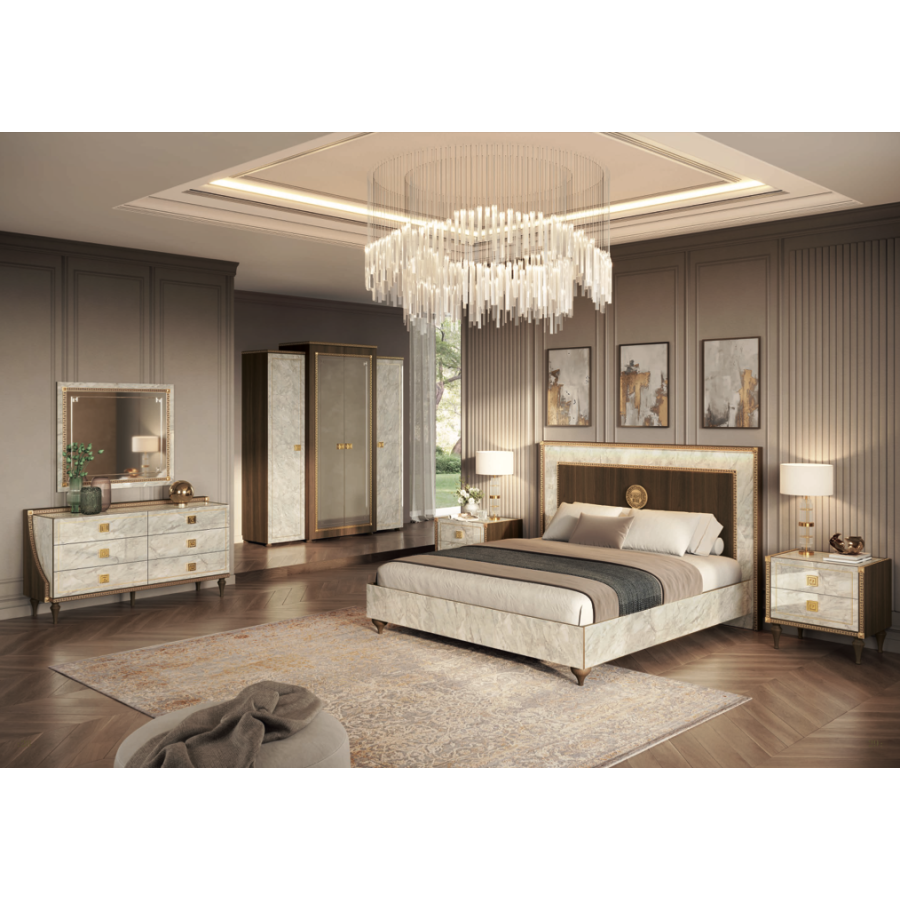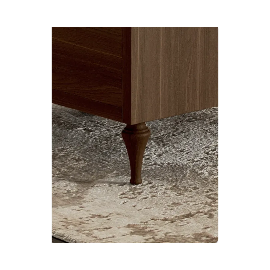 Strona wykończona drewnem orzechowym obejmuje wewnętrzną strukturę wykończoną błyszczącym marmurem z Carrary, ożywiając wyrafinowaną kombinację kolorów, ozdobioną neoklasycznymi greckimi progami ze złotym wykończeniem. Skrupulatna dbałość o detale sprawia, że ​​witryna jest głównym bohaterem salonu. Kryształy, szklane drzwi, lustrzany panel tylny i 24-karatowe platerowane uchwyty tworzą nieoczekiwane odblaski i wyrafinowaną grę światła.