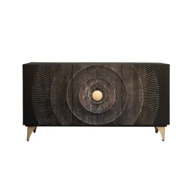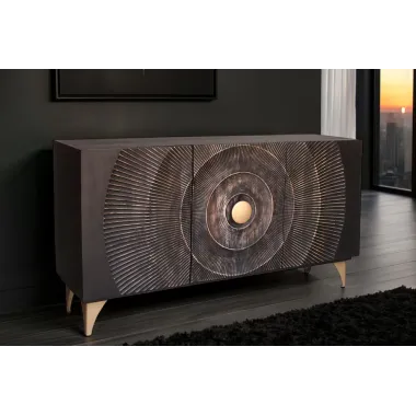 Komoda drewniana w stylu modern vintage, wykonana z wysokiej jakości szczotkowanego drewna akacji egzotycznej, z metalowymi, ergonomicznymi uchwytami, które są częścią designu lameli. Fronty posiadają strukturę 3D z lekkim akcentem lamelowym.