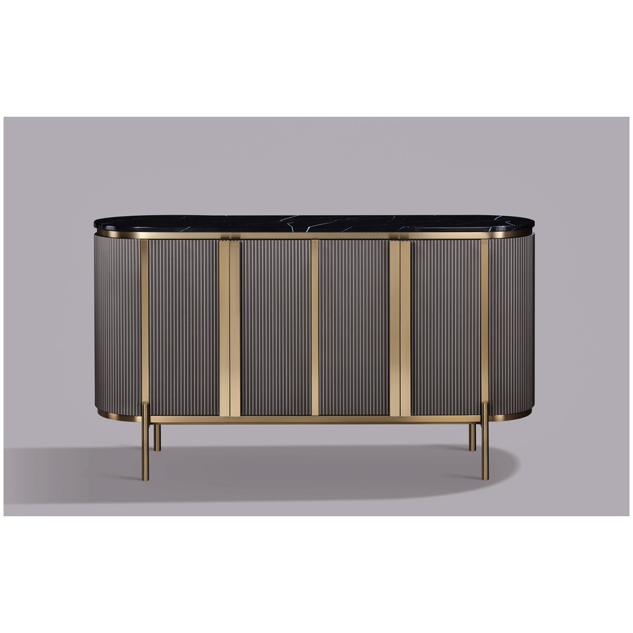 Stylowa komoda w kolorze grafitowym ze złotymi akcentami i nogami. Korpus posiada ryflowane drewno. Blat ma wykończenie marmurowe.