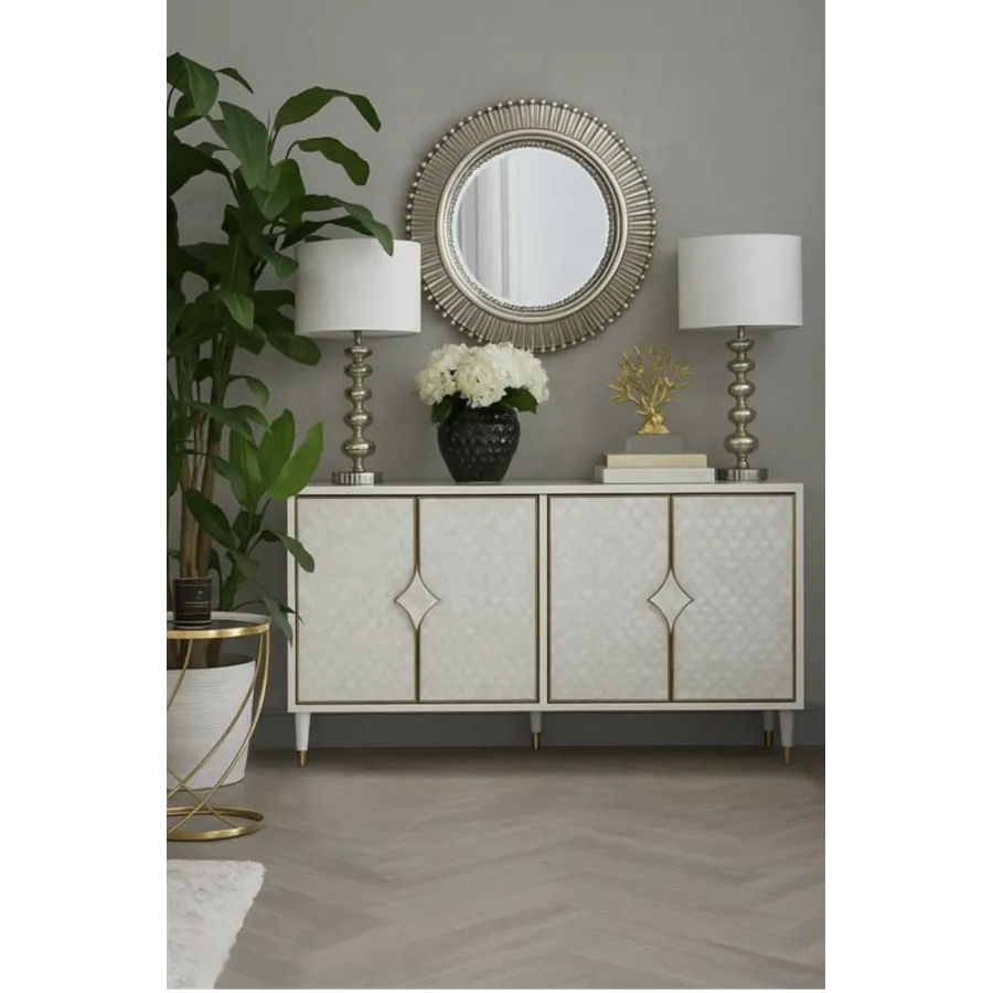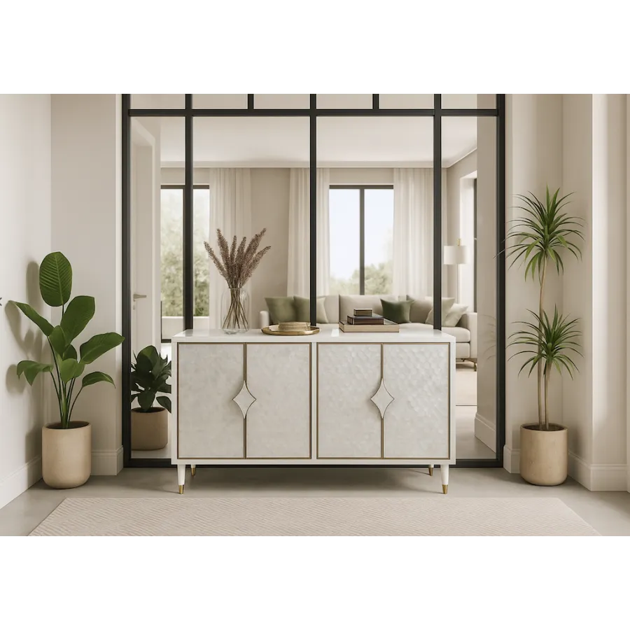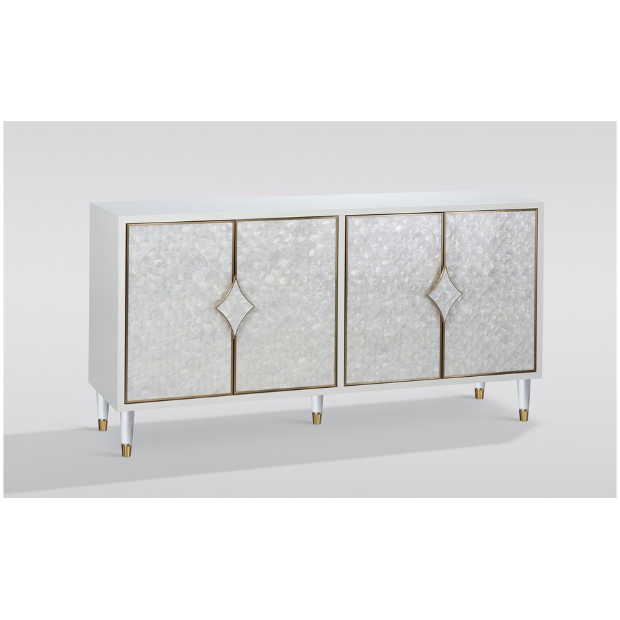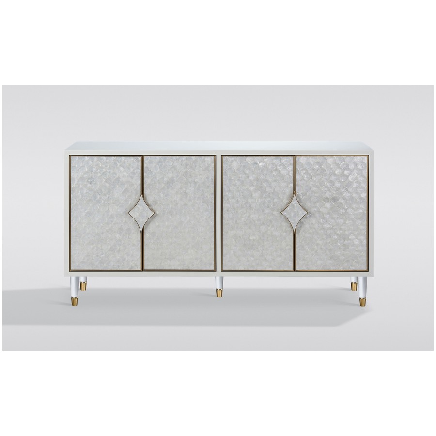 Stylowakomoda w kolorze białym ecru z frontem wykonanym z naturalnej muszli układającej się na wzór rybich łusek. Drzwi okalają złote listwy a całości dopełniają masywne uchwyty w kształcie karo. Białe nóżki zakończone są złotym akcentem.