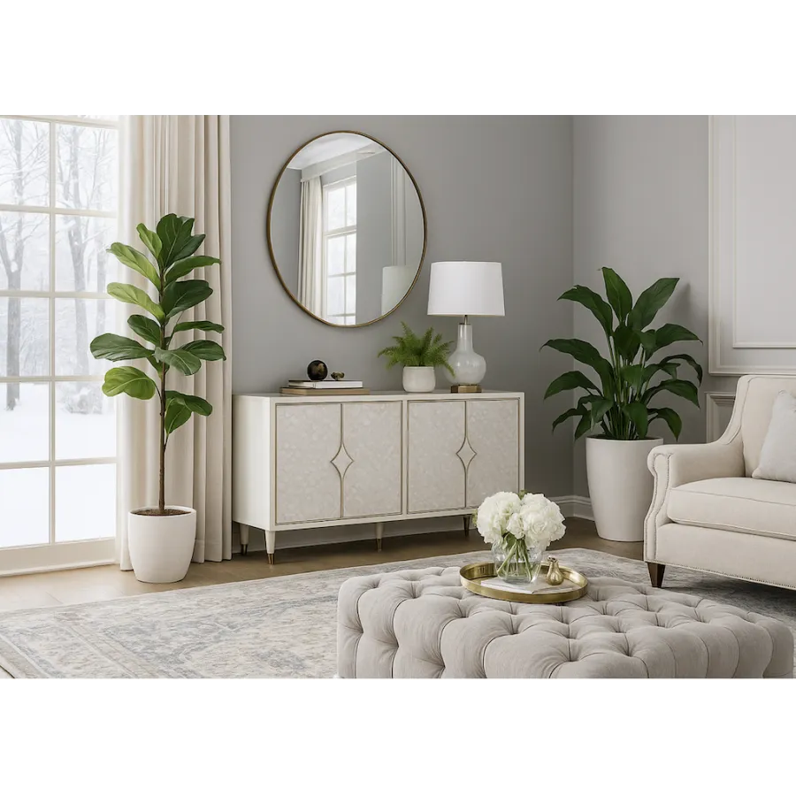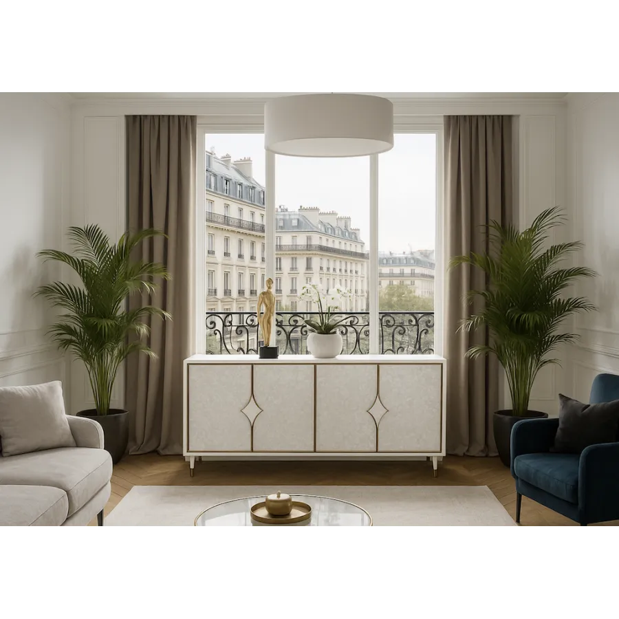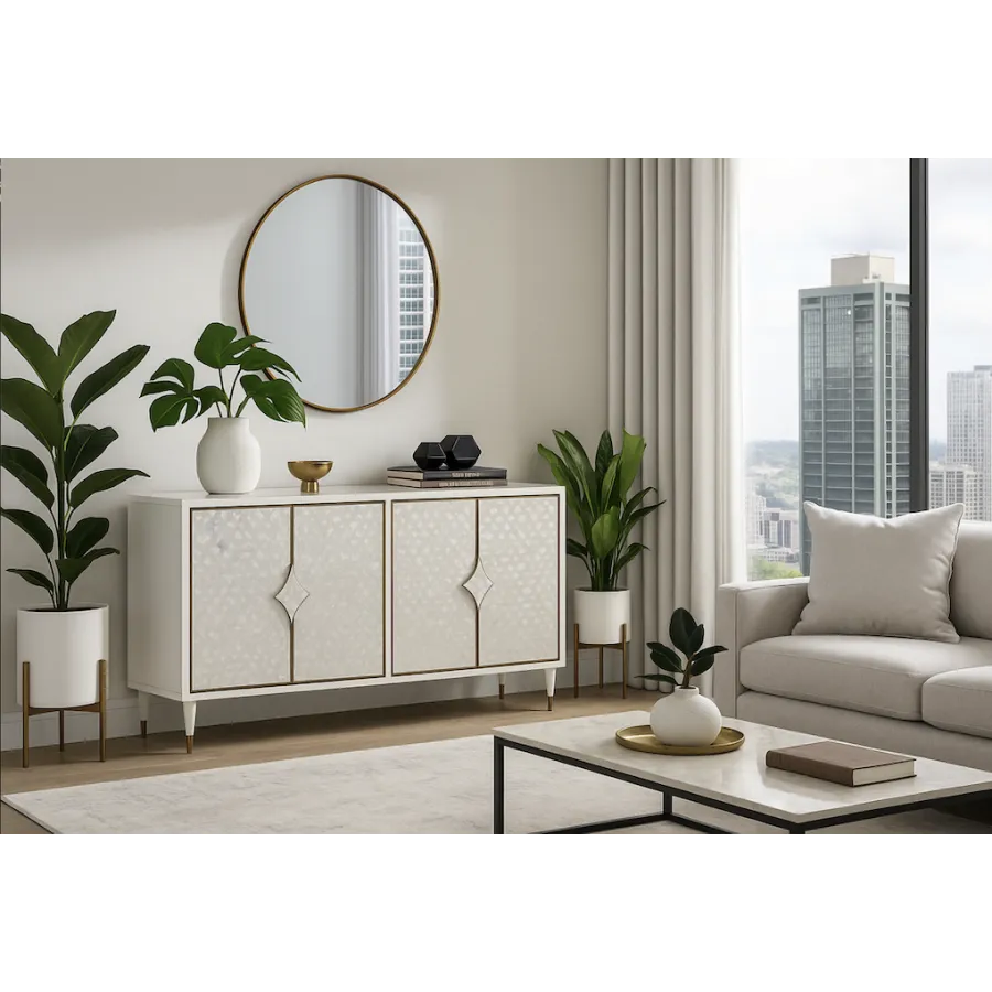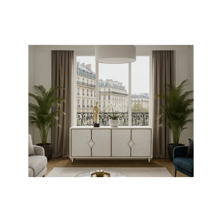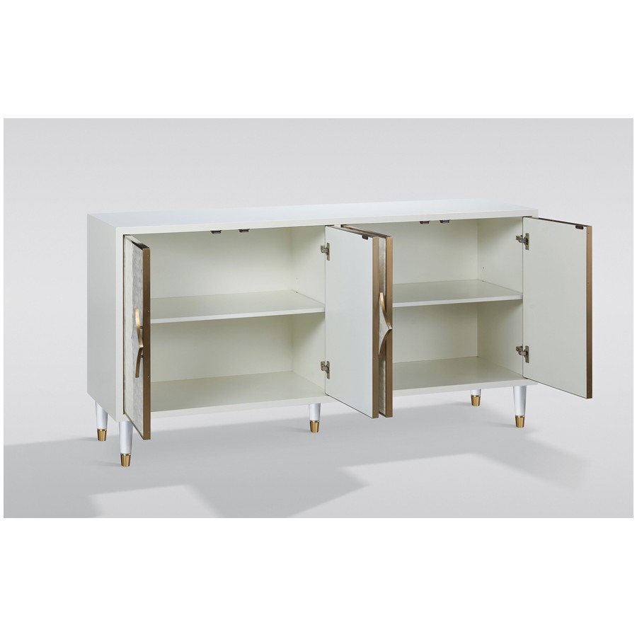 Stylowakomoda w kolorze białym ecru z frontem wykonanym z naturalnej muszli układającej się na wzór rybich łusek. Drzwi okalają złote listwy a całości dopełniają masywne uchwyty w kształcie karo. Białe nóżki zakończone są złotym akcentem.