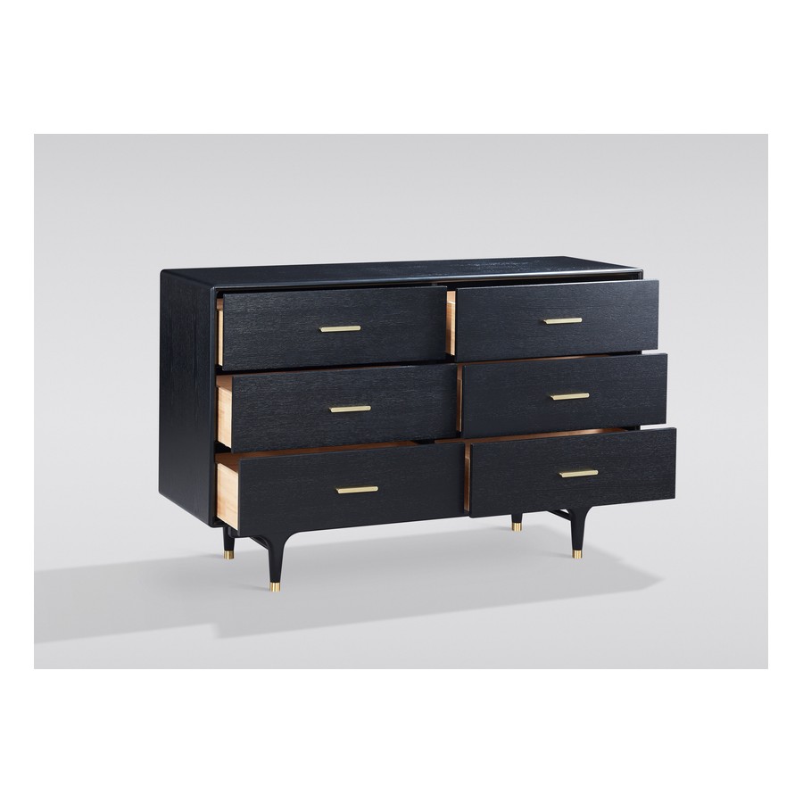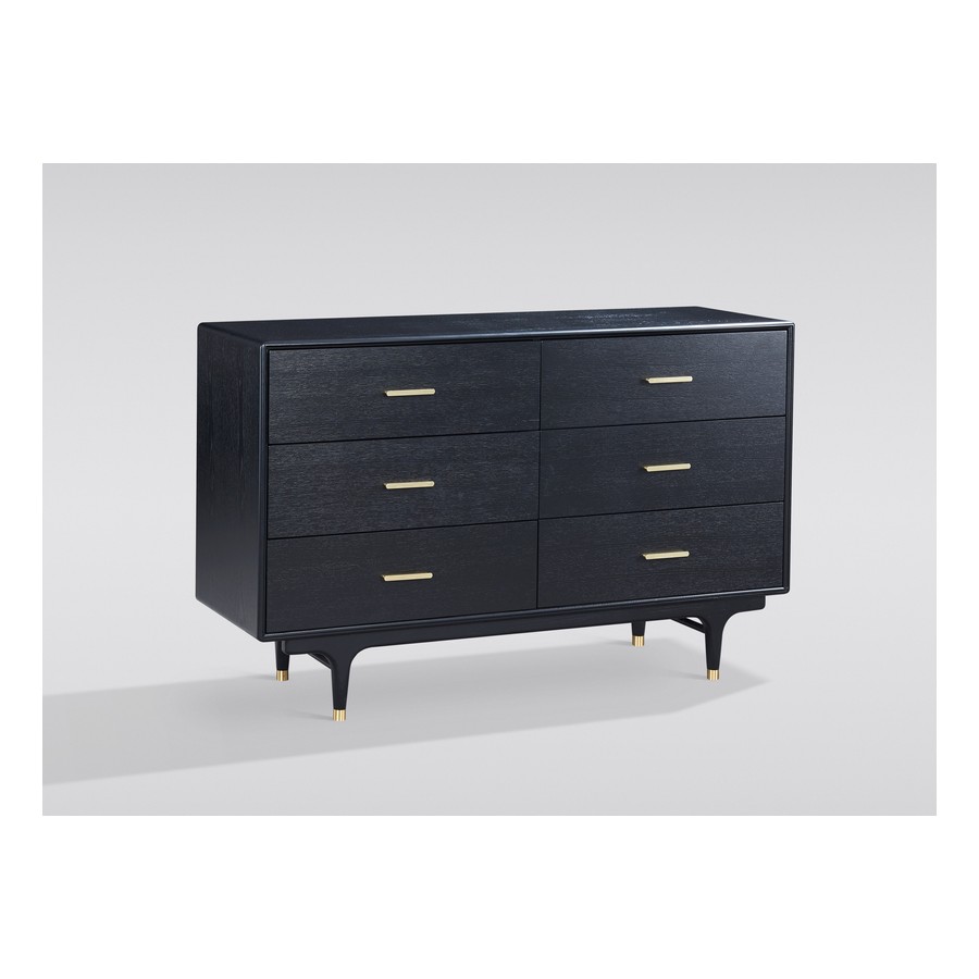 Elegancka komoda w kolorze czarnym ze złotymi uchwytami i nogami zakończonymi złotym akcentem. Korpus jest pokryty okleiną w widoczną strukturą drewna.