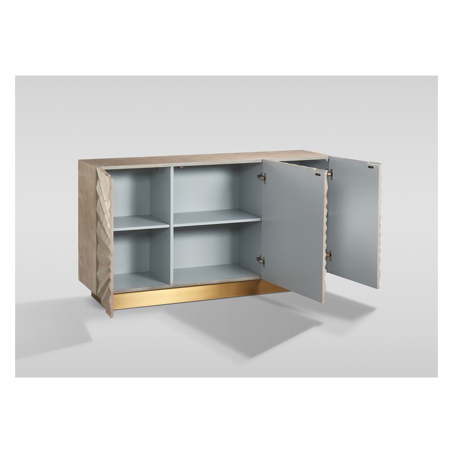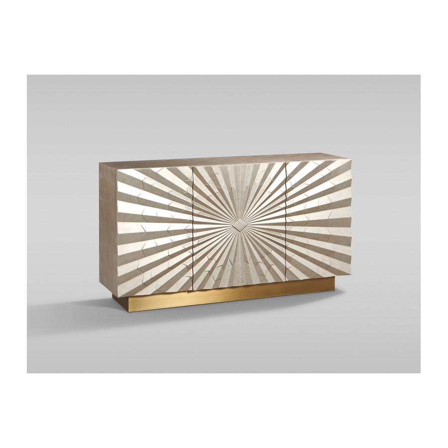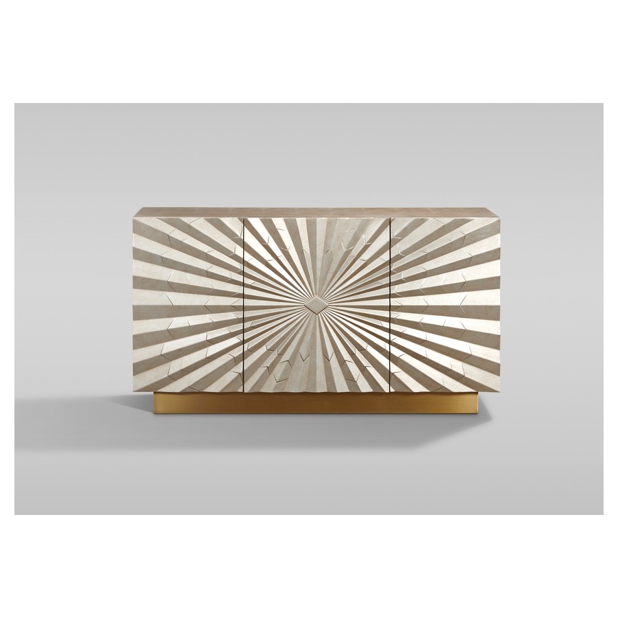 Stylowa komoda w kolorze w kolorze szampańskiego złota. Prosty design przełamany jest parametrycznym frontem z promienistym, geometrycznym wzorem przywodzącym na myśl sztukę origami.