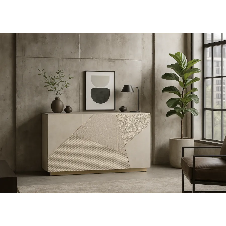 Stylowa komoda w kolorze w kolorze szampańskiego złota. Prosty design przełamany jest frontem ze zróżnicowaną strukturą 3D i geometrycznym, asymetrycznym wzorem.