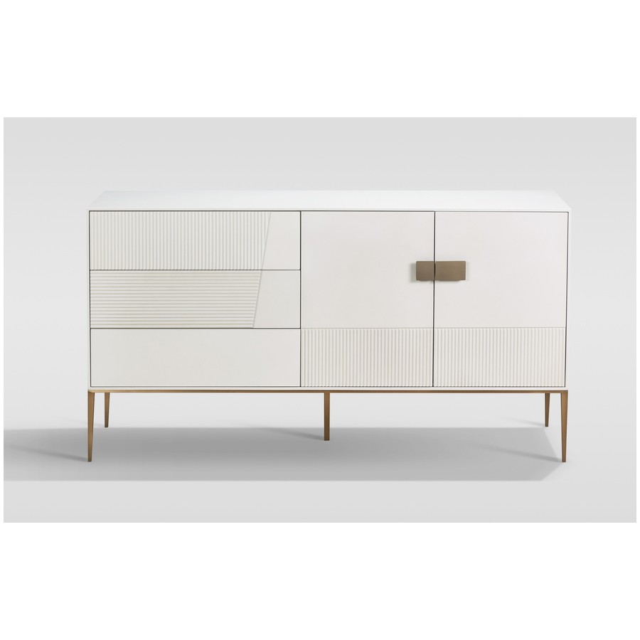 Elegancka komoda w kolorze złamanej bieli ze złotymi akcentami i nóżkami. Prosta forma bryły wzbogacona została gładkie fronty połączone z asymetrycznymi ryflowaniami w pionie i poziomie.
