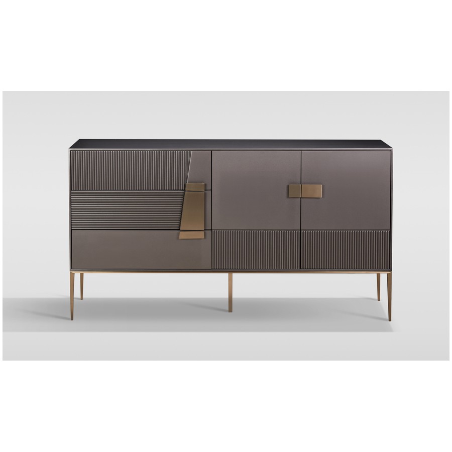 Elegancka komoda w kolorze złamanej bieli ze złotymi akcentami i nóżkami. Prosta forma bryły wzbogacona została gładkie fronty połączone z asymetrycznymi ryflowaniami w pionie i poziomie.
