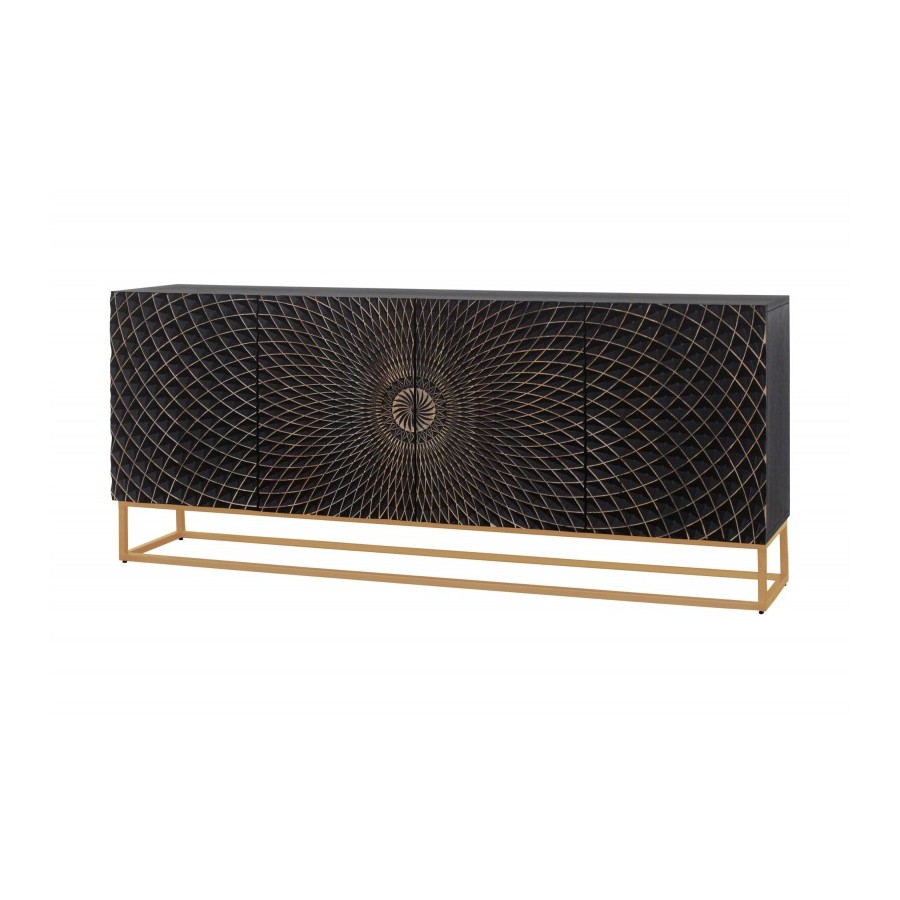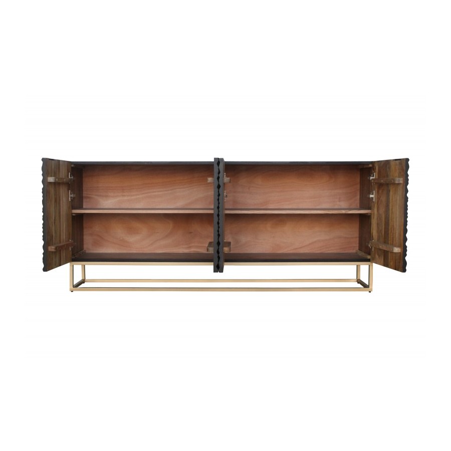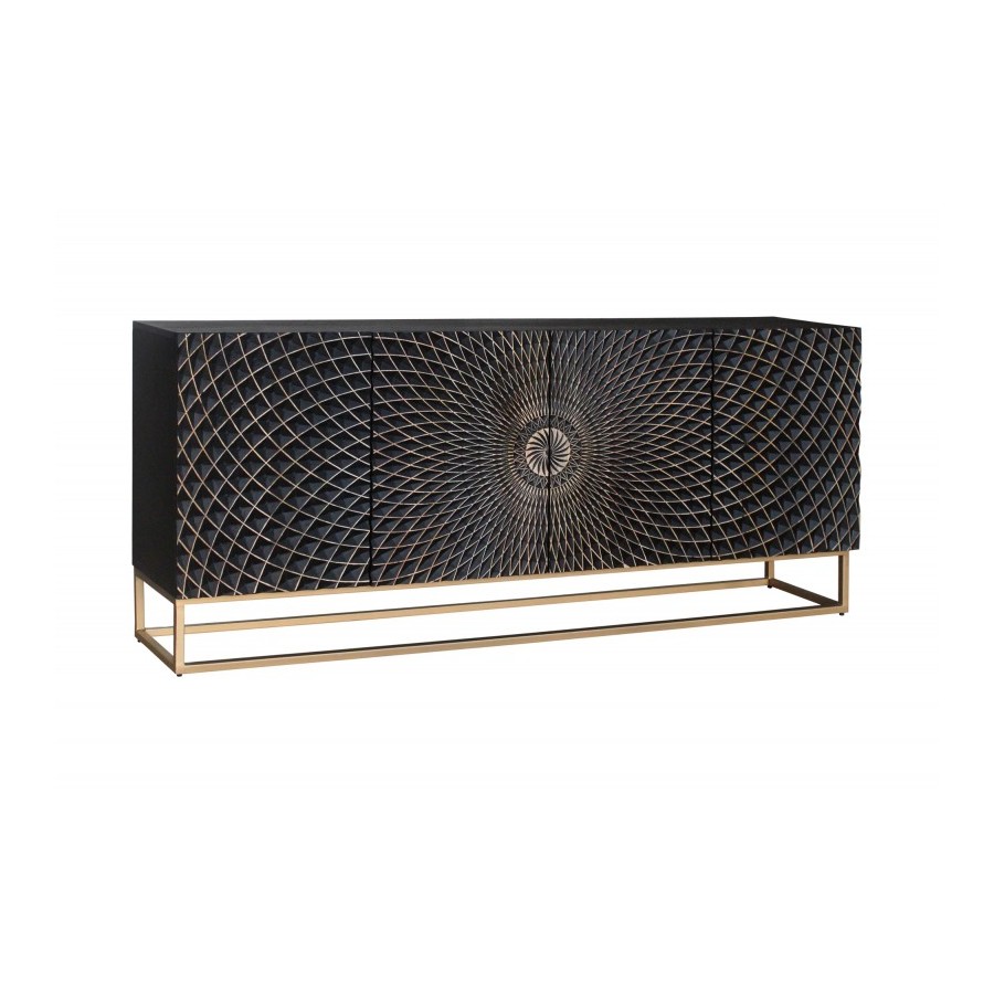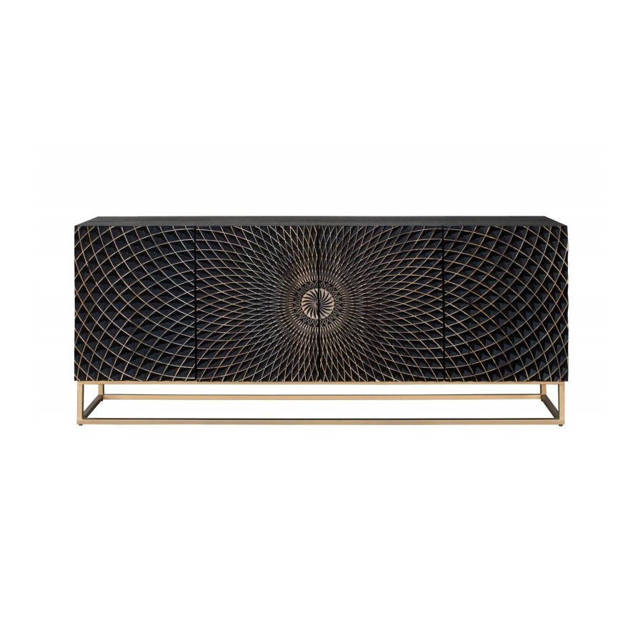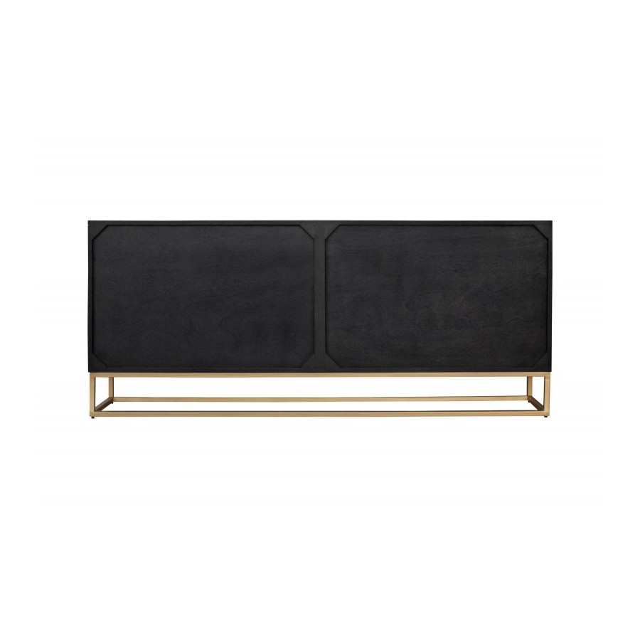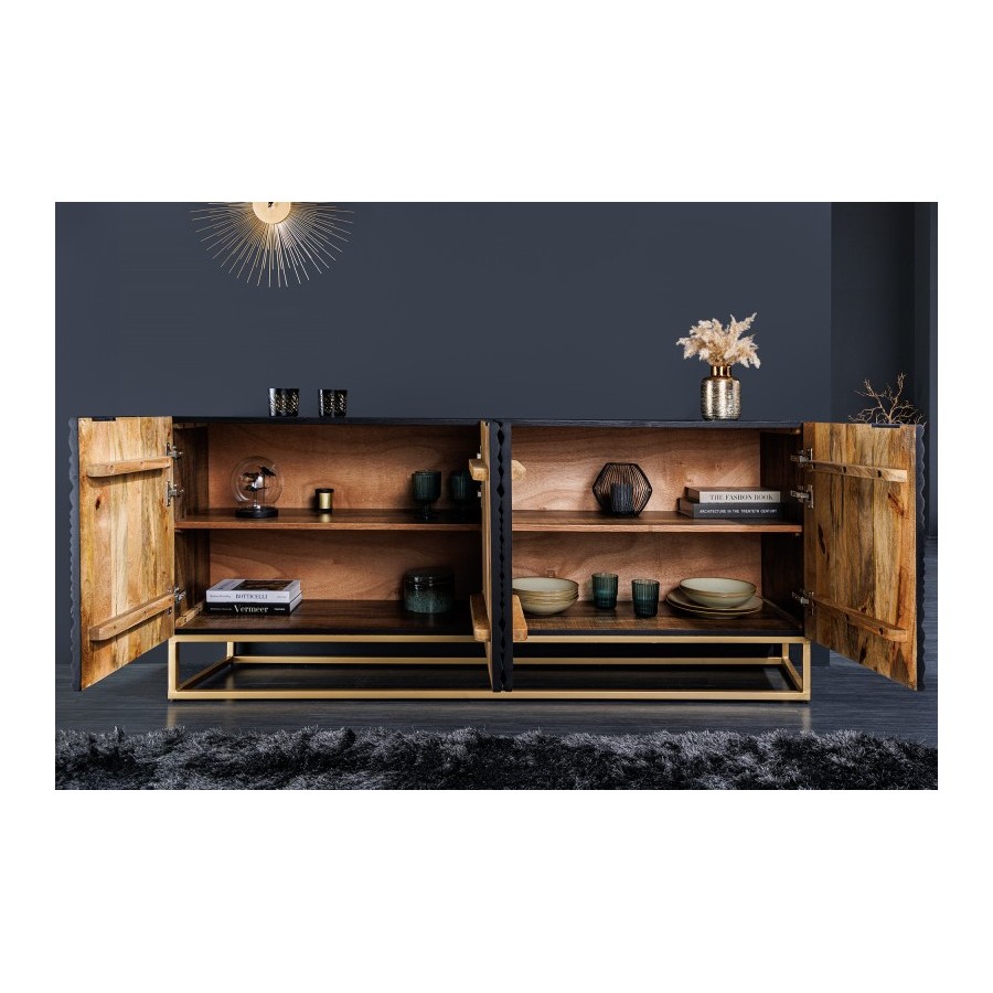 Front kredensu z litego drewna i złota żelazna rama nadają meblowi efektowny wygląd. Za abstrakcyjnymi frontami kryje się mnóstwo miejsca do przechowywania podzielonego na cztery duże półki szafek. Nieważne, czy umieścisz kredens w salonie, jadalni czy przedpokoju – czarny kredens z pewnością przyciągnie uwagę każdego. Jeśli szukasz stylowego i funkcjonalnego mebla, który jest wykonany z wysokiej jakości litego drewna, a jednocześnie oferuje dużo miejsca do przechowywania, to ten kredens jest idealnym wyborem dla Ciebie!