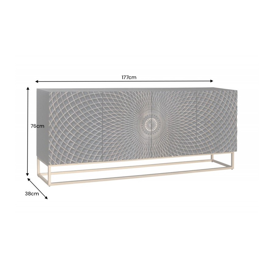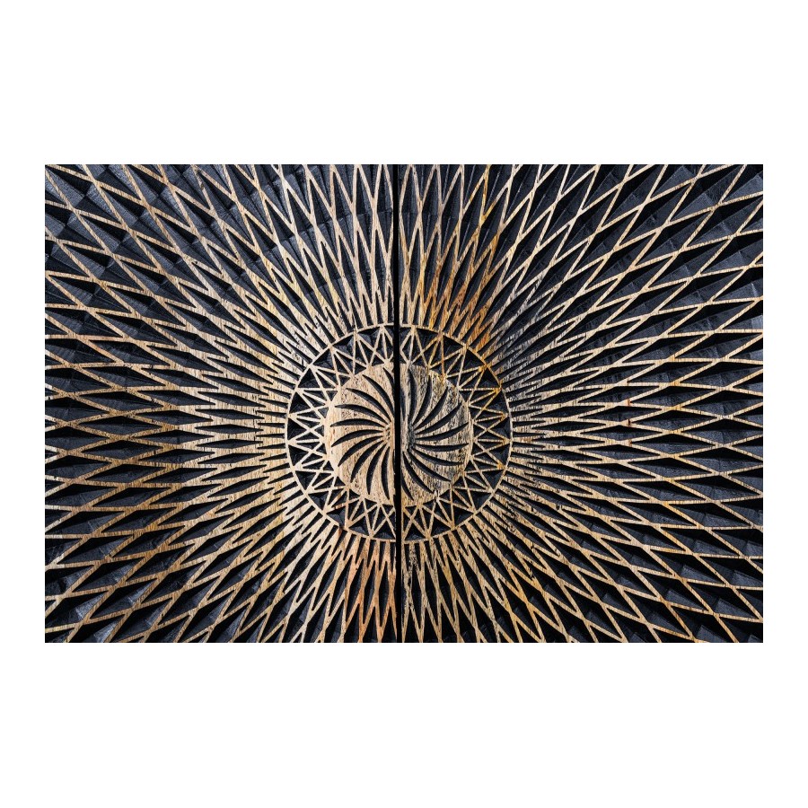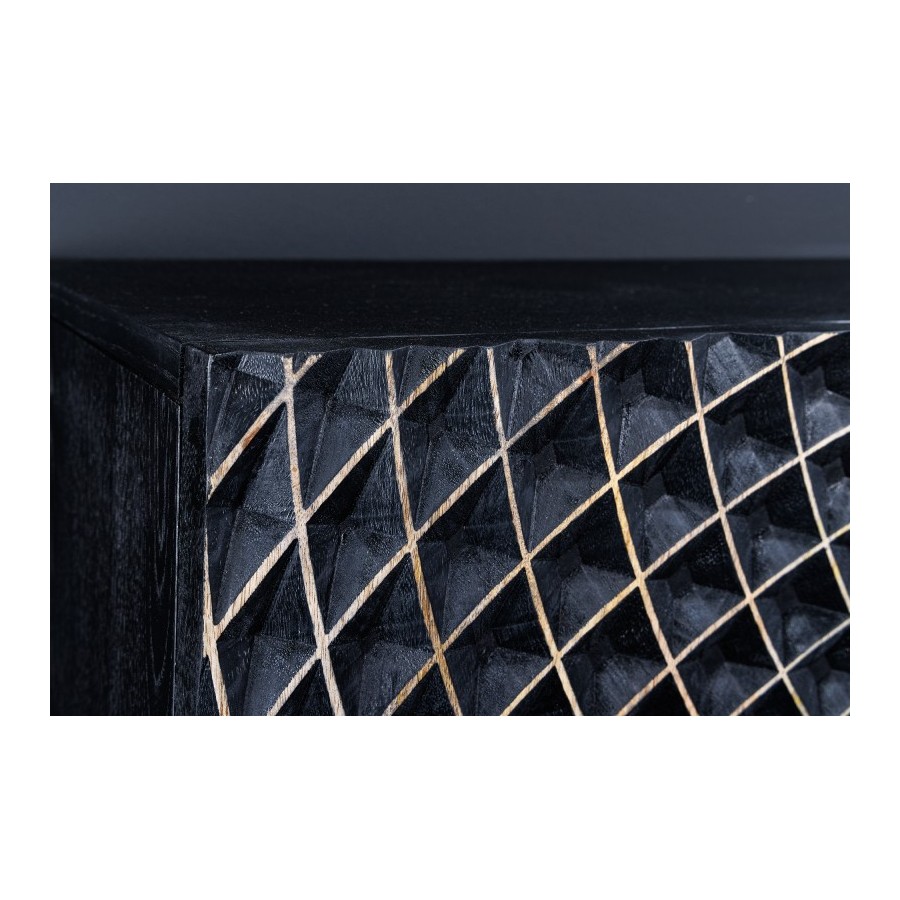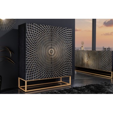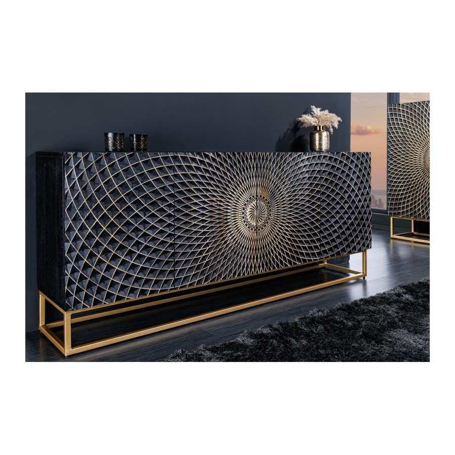 Jeśli nadal szukasz kredensu, który łączy w sobie dużo miejsca do przechowywania i ekscytujący design, mamy właśnie coś dla Ciebie. Czarny kredens ILLUSION wykonany jest z wysokiej jakości litego drewna, a dokładniej drewna mango. Najważniejszym elementem tej szafki jest bez wątpienia trójwymiarowa struktura powierzchni frontów szafek. Drzwi o wzorze mandali przyciągają wzrok w Twoim domu i łączą w sobie elegancki design z nutą ekstrawagancji. Dzięki swoim dużym wymiarom nowoczesny kredens oferuje mnóstwo miejsca do przechowywania rzeczy osobistych. Odkryj nowy, klasyczny design do swojego salonu, przedpokoju lub jadalni!
