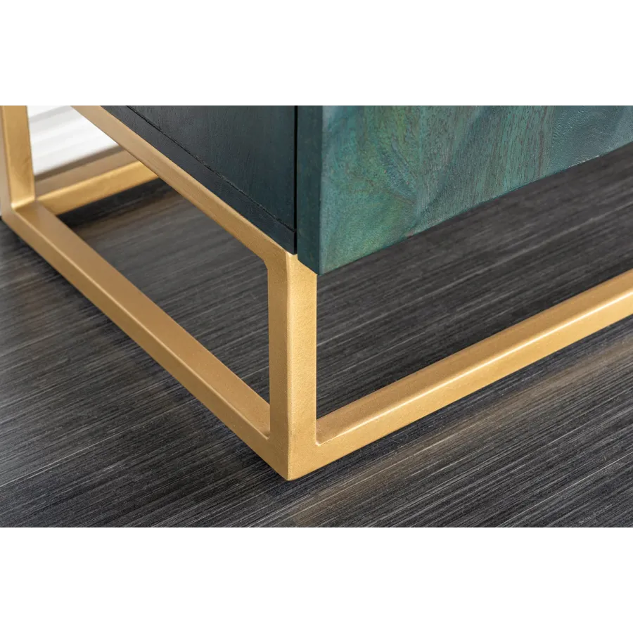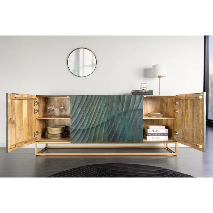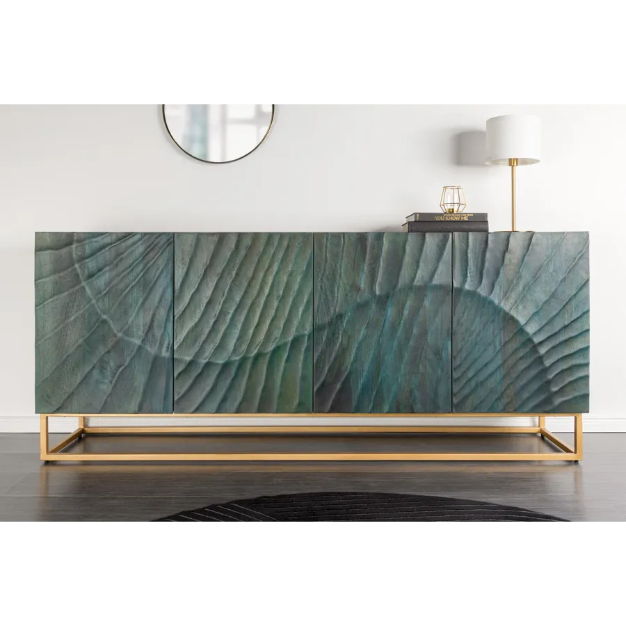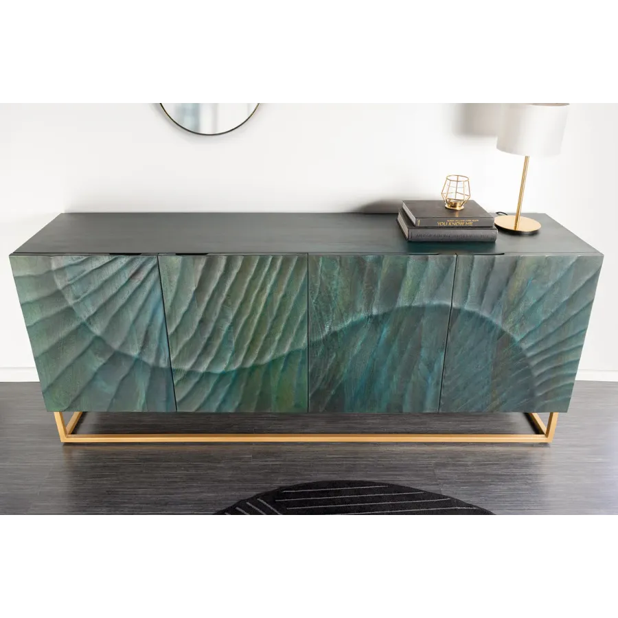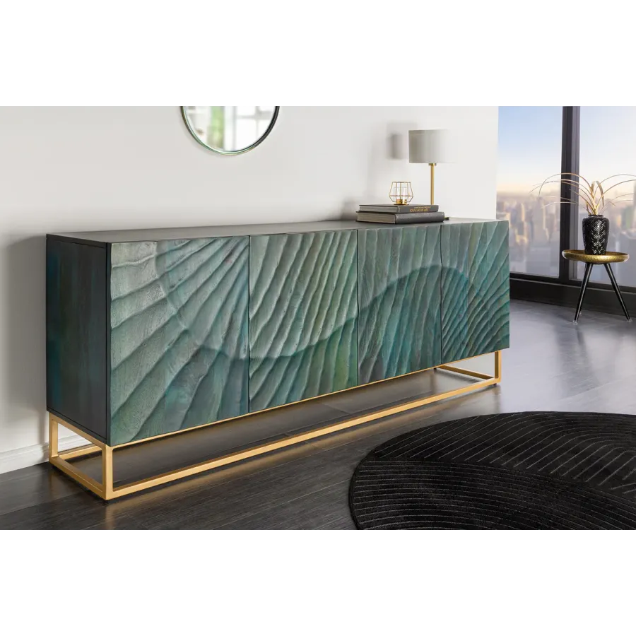Kochasz niezwykłość i nadal brakuje Ci trochę miejsca do przechowywania w swoim otoczeniu? W takim razie nasza ekstrawagancka komoda jest w sam raz do Twojego domu. Solidny korpus wykonany z drewna mango w ekscytującej czerni osadzony na prostej metalowej ramie w kolorze złotym. Najważniejszym punktem planszy jest wyszukana rzeźba 3D przymocowana z przodu. Organiczne kształty zdają się płynąć po powierzchni i inspirują swoim niezwykłym wyglądem i odczuciem.