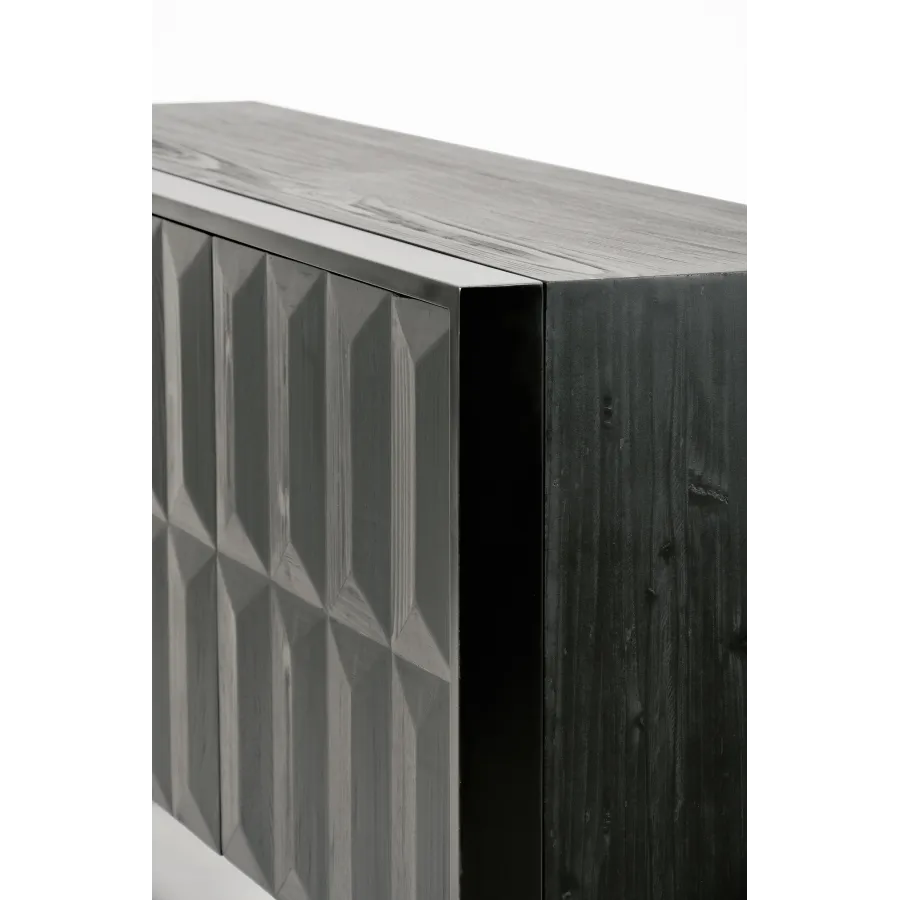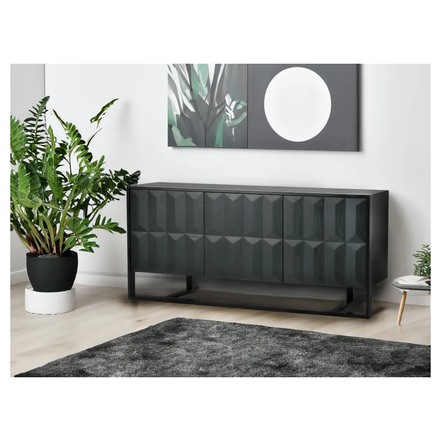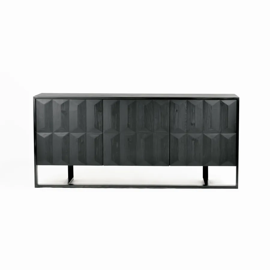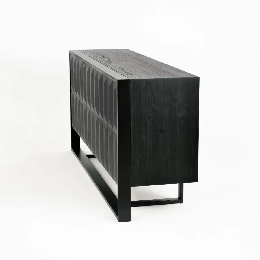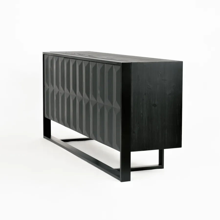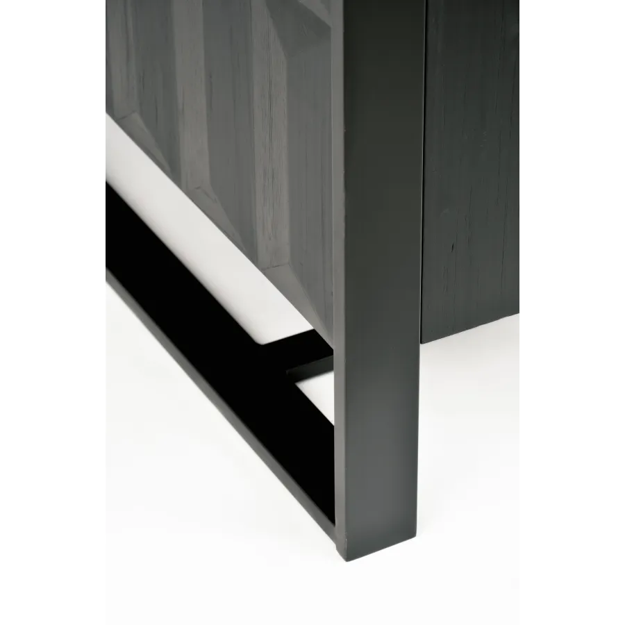 Nowoczesna komoda w kolorze czarnym. Fronty posiadają symetryczną strukturę 3D. Korpus z widoczną strukturą drewna wykończony na mat idealnie współgra z żelazną ramą w pół-połysku.