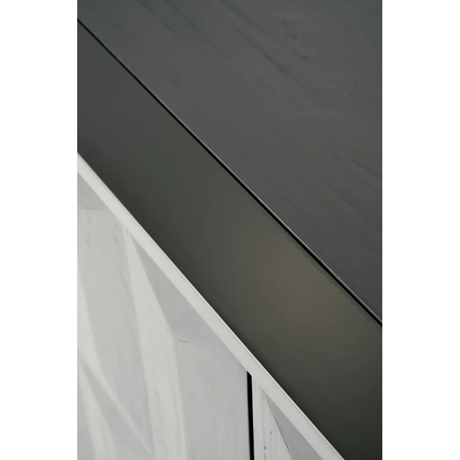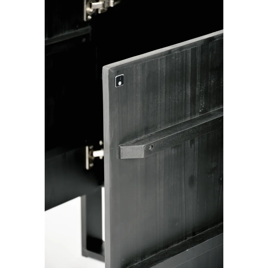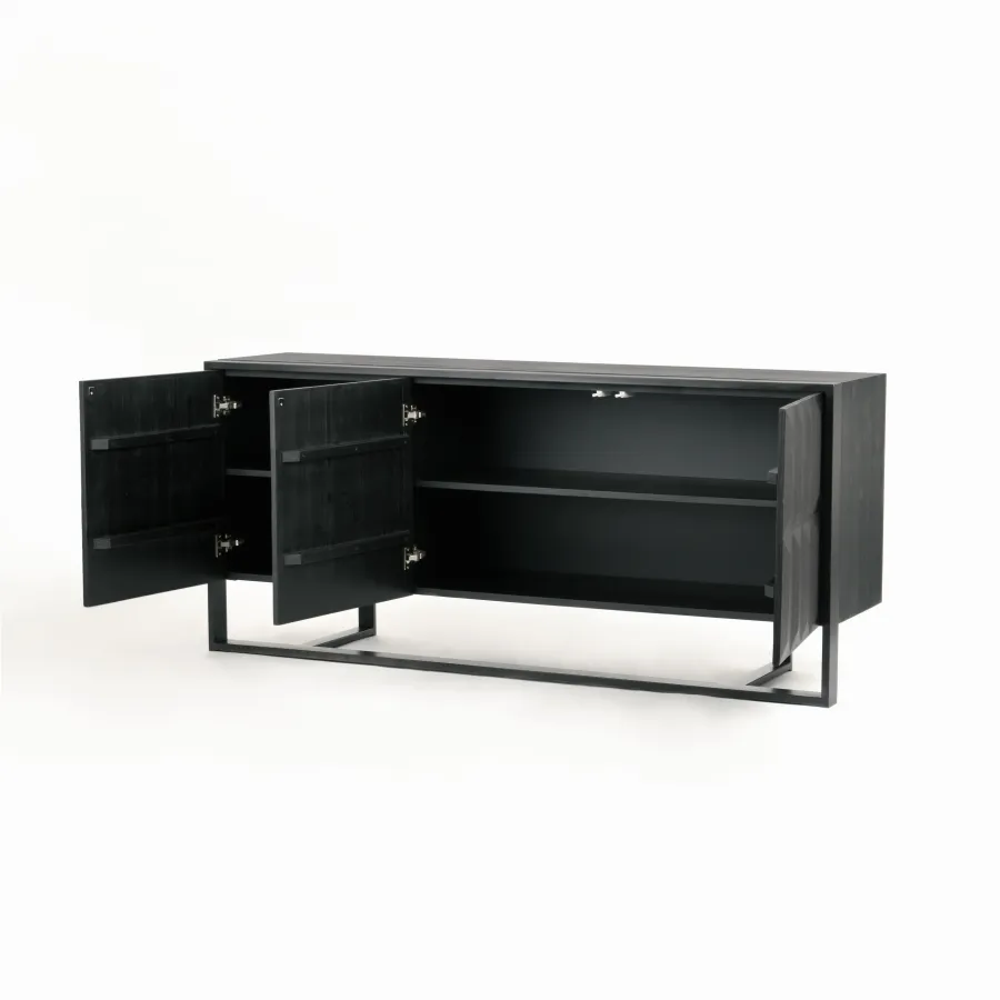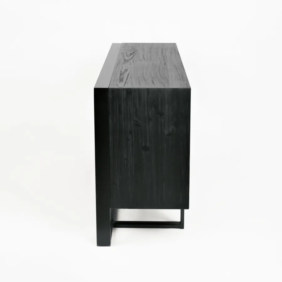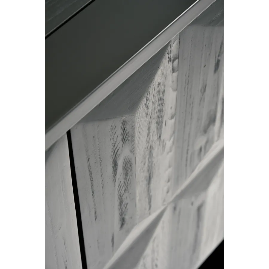 Nowoczesna komoda w kolorze czarnym. Fronty posiadają symetryczną strukturę 3D. Korpus z widoczną strukturą drewna wykończony na mat idealnie współgra z żelazną ramą w pół-połysku.