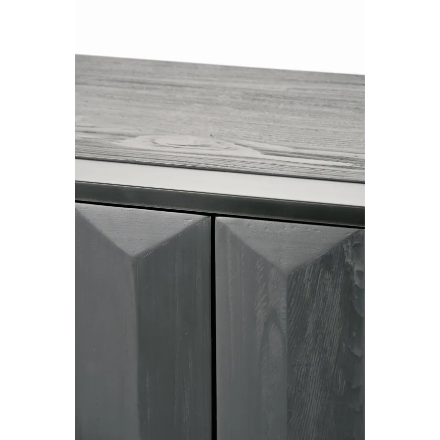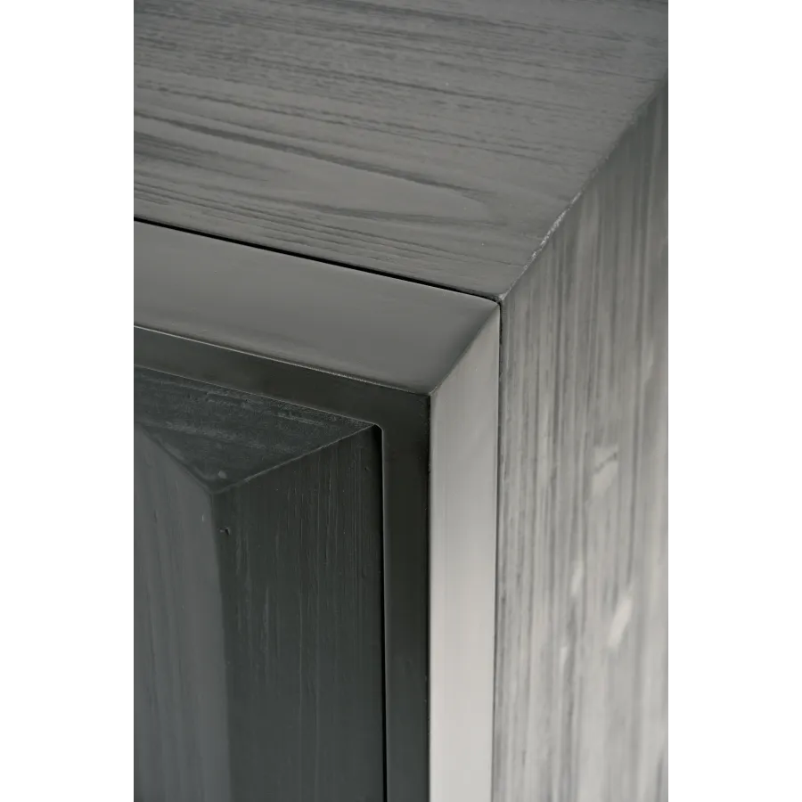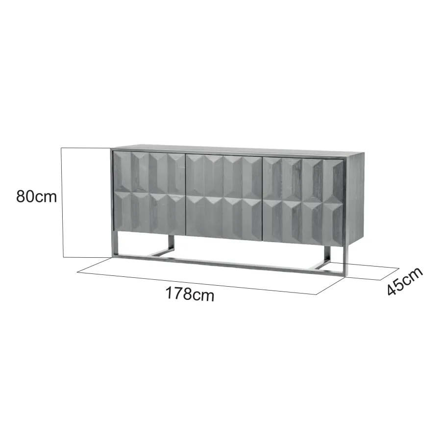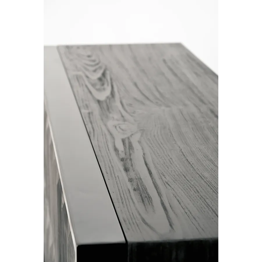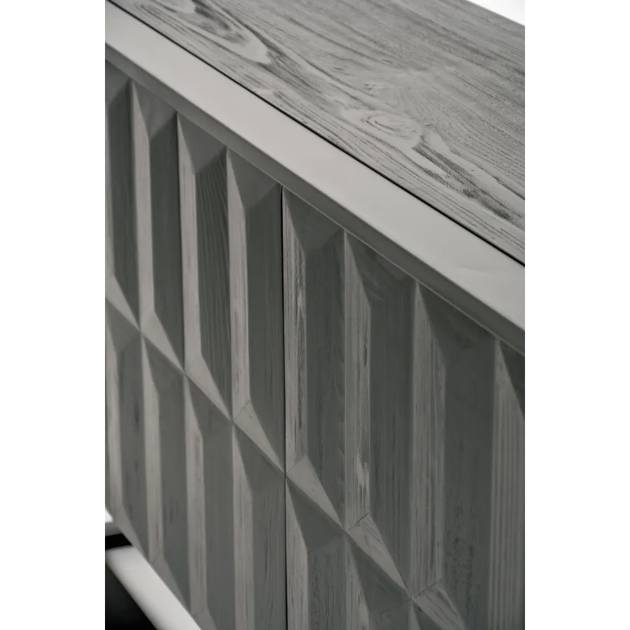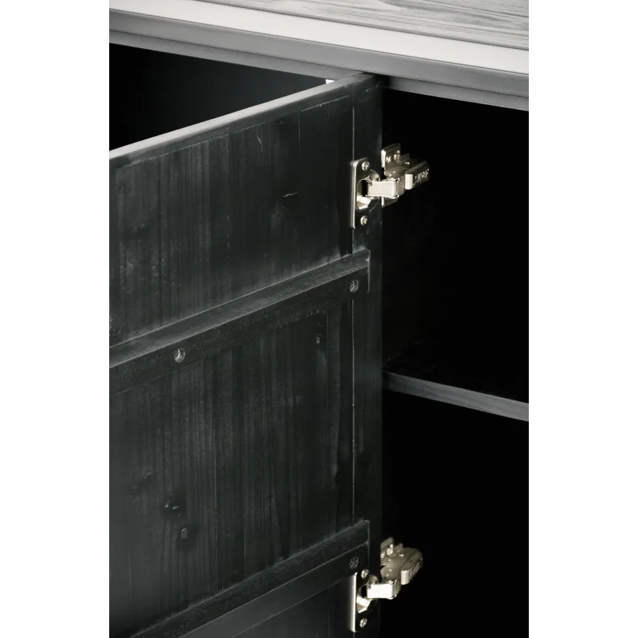 Nowoczesna komoda w kolorze czarnym. Fronty posiadają symetryczną strukturę 3D. Korpus z widoczną strukturą drewna wykończony na mat idealnie współgra z żelazną ramą w pół-połysku.