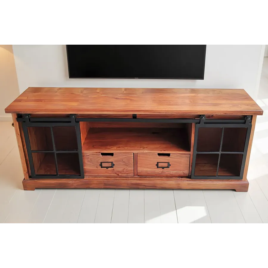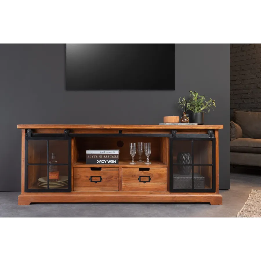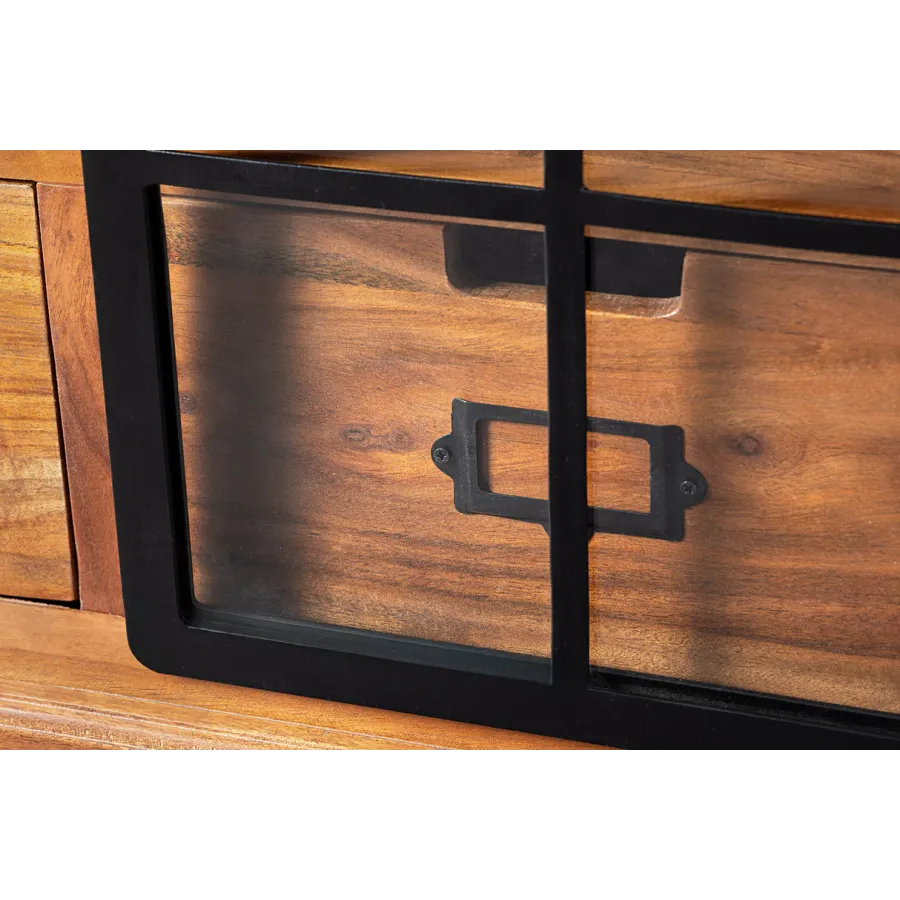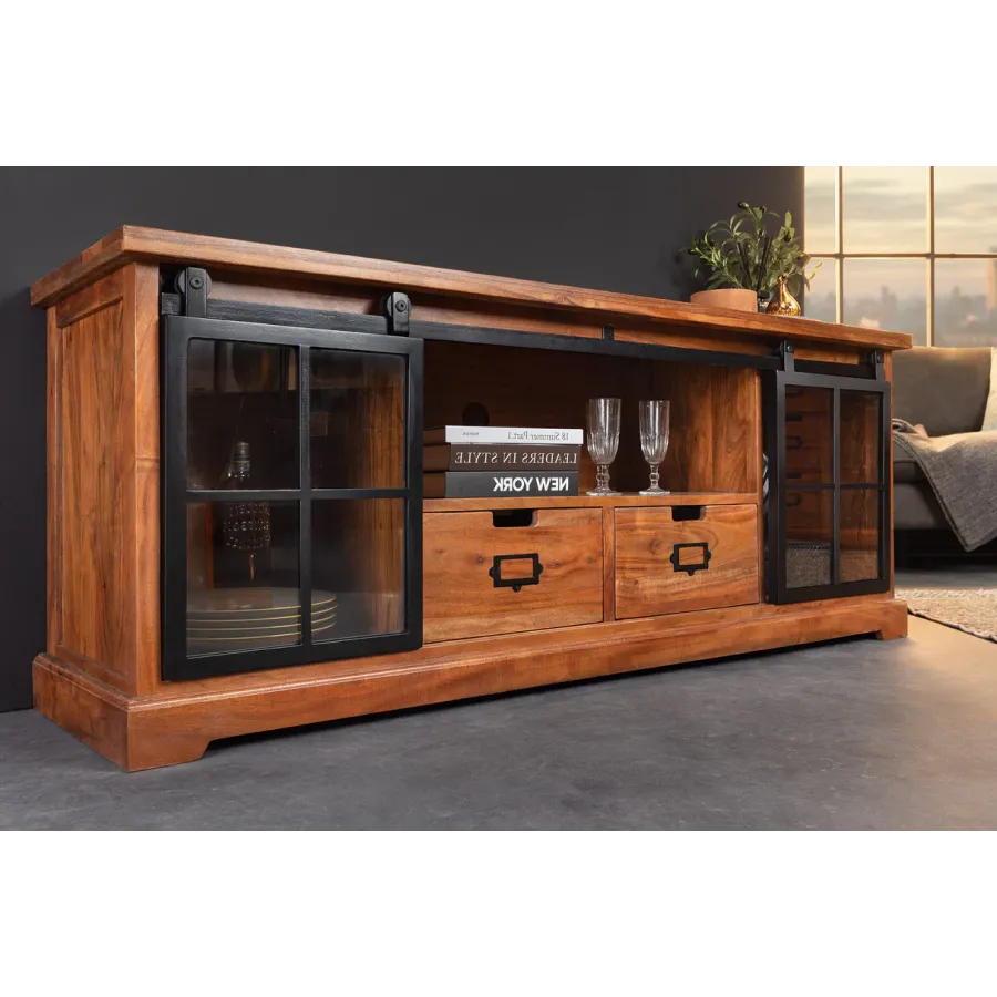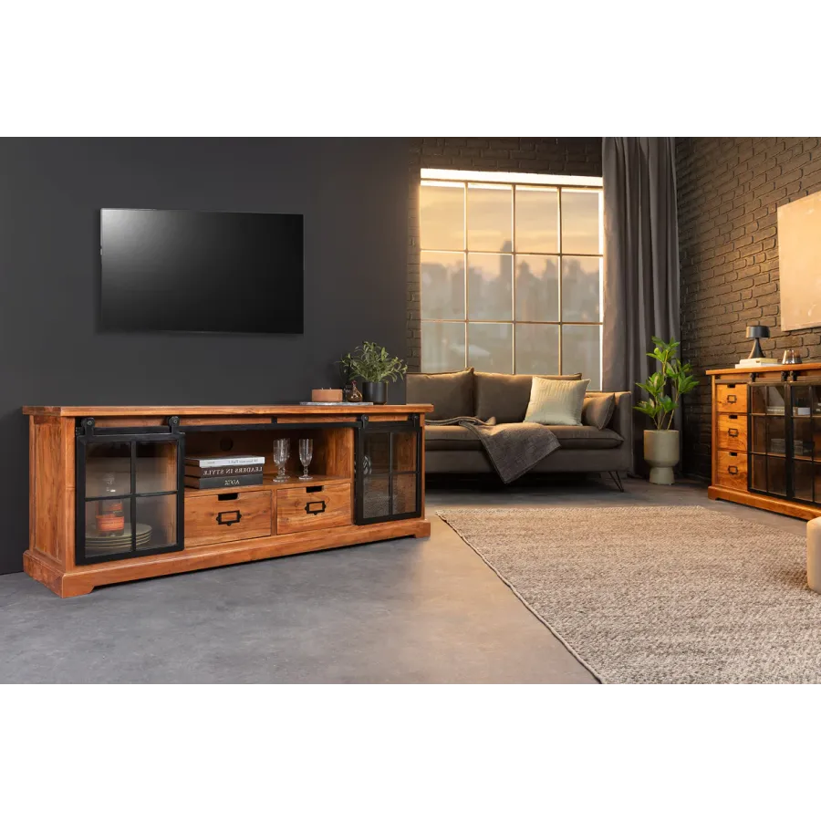 Komoda HERITAGE oferuje dużo miejsca do przechowywania w Twoim salonie z dwiema szufladami i trzema przestronnymi przegródkami. Tutaj rustykalne piękno naturalnego litego drewna łączy się z nowoczesnymi elementami. Korpus i duże szuflady tablicy TV utrzymane są w klasycznym stylu country house, a industrialne wzornictwo dopełniają szyby z systemem zawieszania i ozdobnymi kratami okiennymi. Umiejętne połączenie stylów zapewni niepowtarzalny akcent w Twoim domu!
