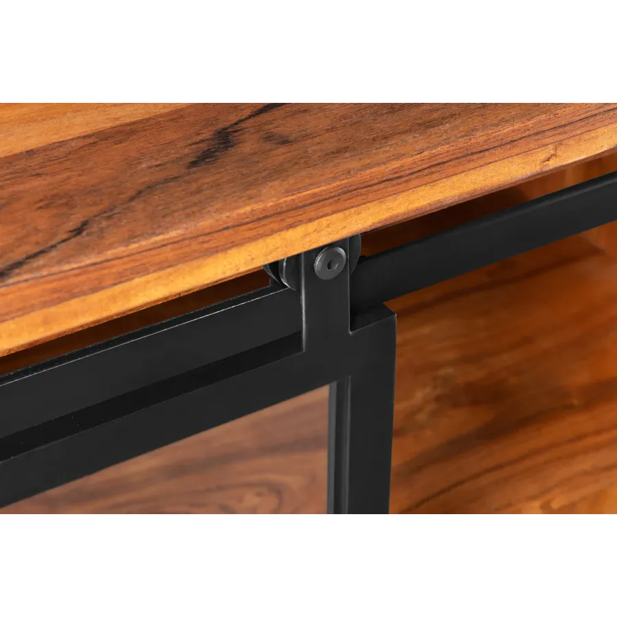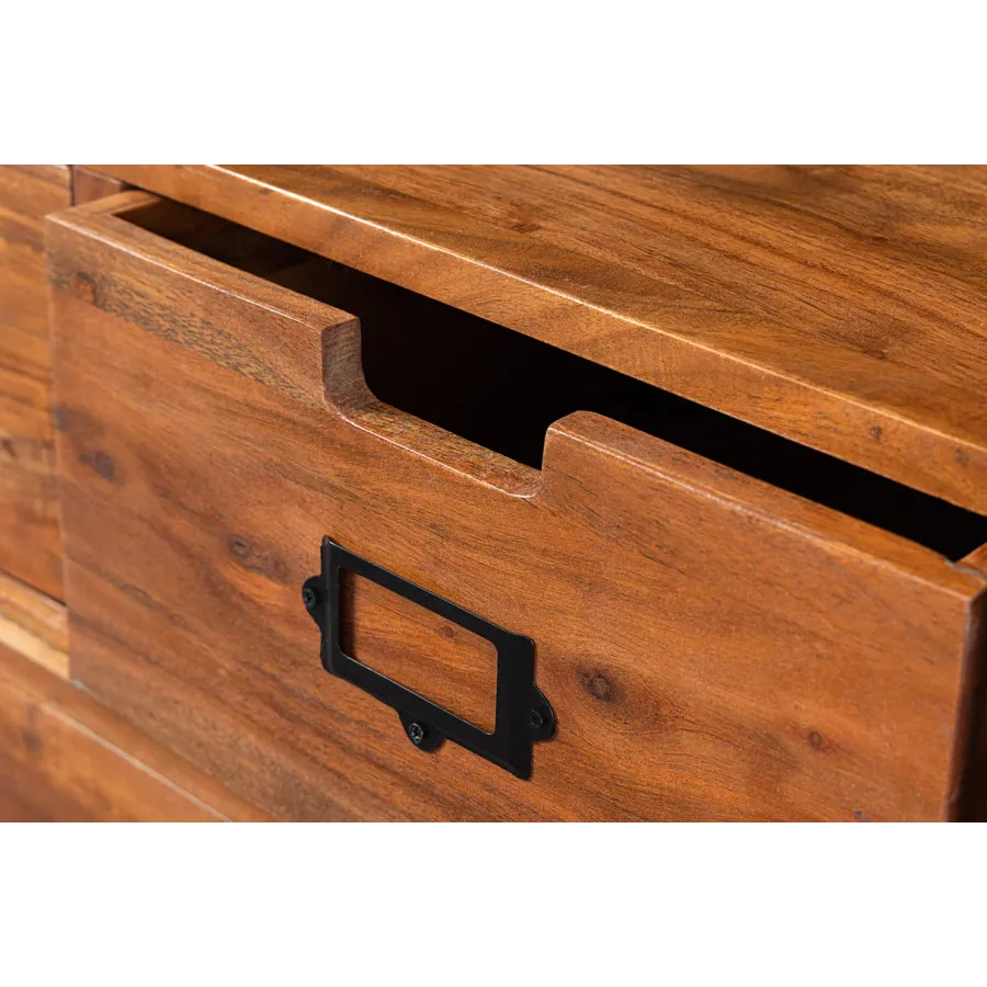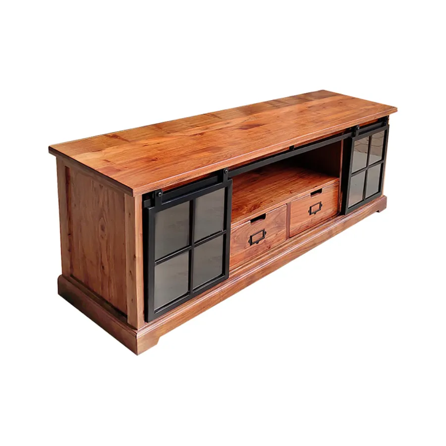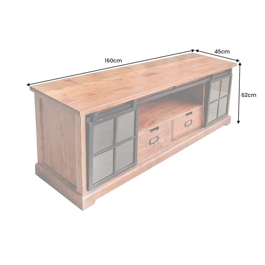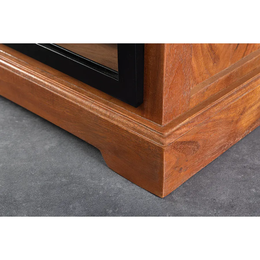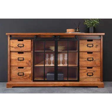 Komoda HERITAGE oferuje dużo miejsca do przechowywania w Twoim salonie z dwiema szufladami i trzema przestronnymi przegródkami. Tutaj rustykalne piękno naturalnego litego drewna łączy się z nowoczesnymi elementami. Korpus i duże szuflady tablicy TV utrzymane są w klasycznym stylu country house, a industrialne wzornictwo dopełniają szyby z systemem zawieszania i ozdobnymi kratami okiennymi. Umiejętne połączenie stylów zapewni niepowtarzalny akcent w Twoim domu!