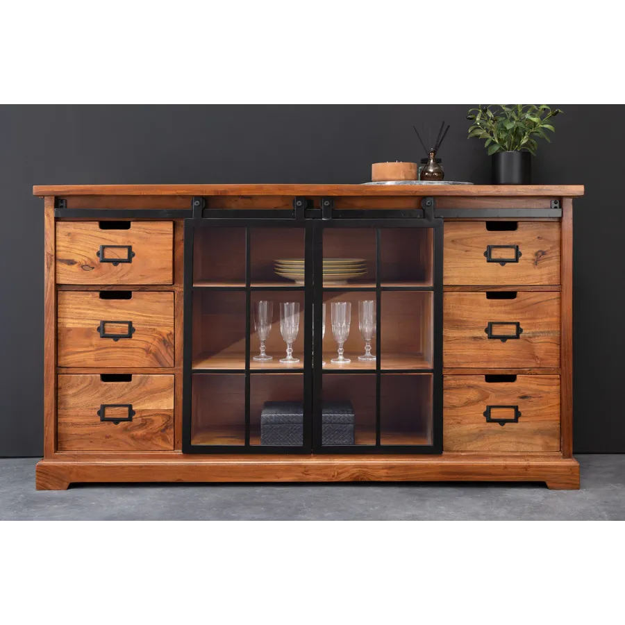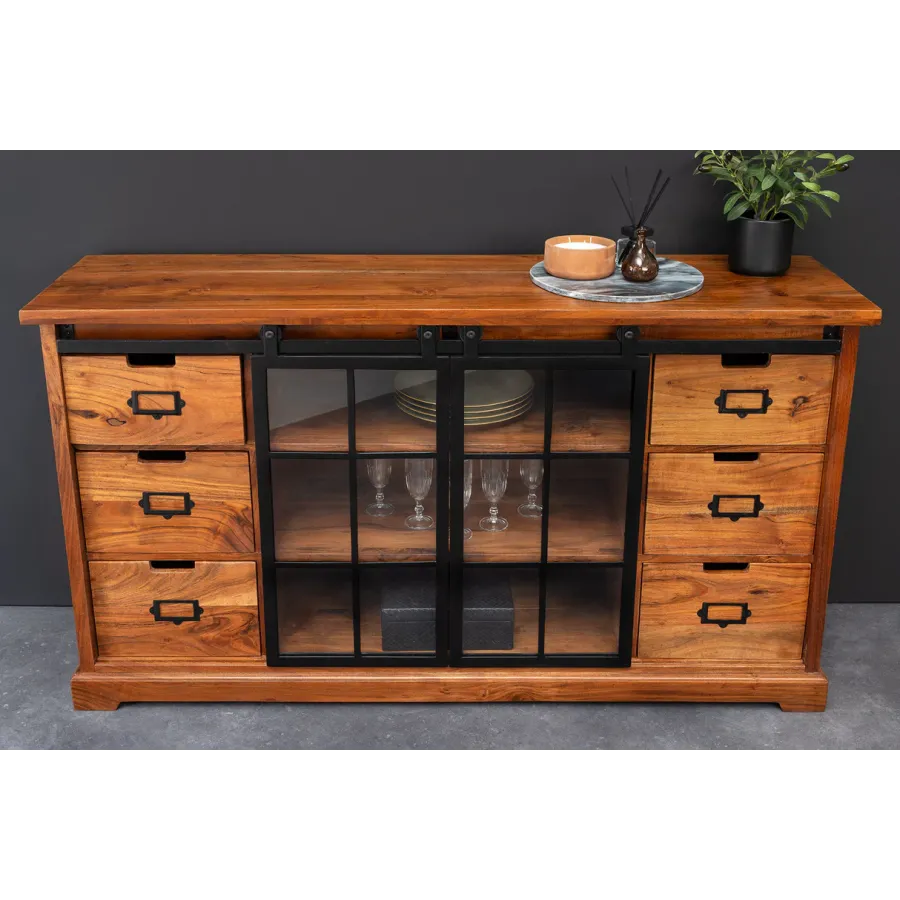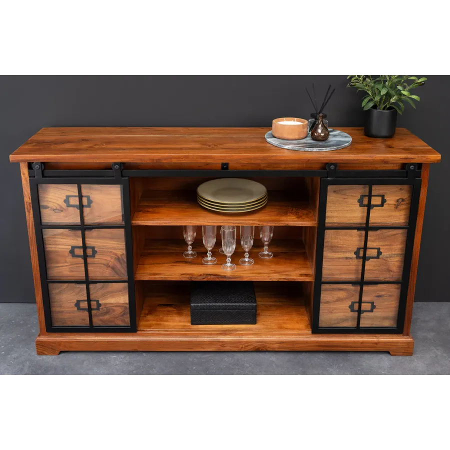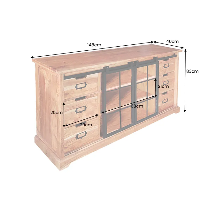 Komoda HERITAGE oferuje dużo miejsca do przechowywania w Twoim salonie z dwiema szufladami i trzema przestronnymi przegródkami. Tutaj rustykalne piękno naturalnego litego drewna łączy się z nowoczesnymi elementami. Korpus i duże szuflady tablicy TV utrzymane są w klasycznym stylu country house, a industrialne wzornictwo dopełniają szyby z systemem zawieszania i ozdobnymi kratami okiennymi. Umiejętne połączenie stylów zapewni niepowtarzalny akcent w Twoim domu!