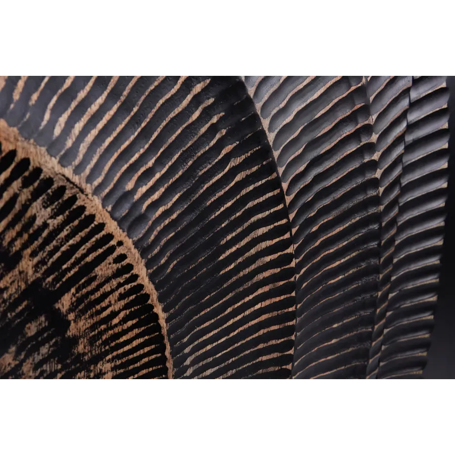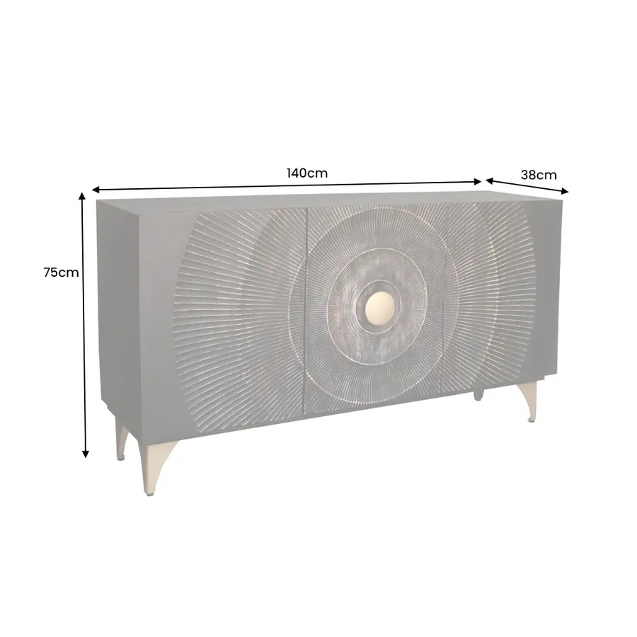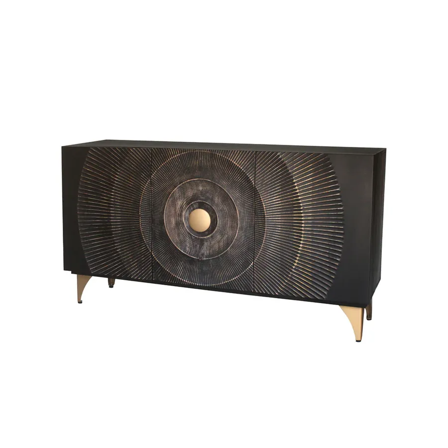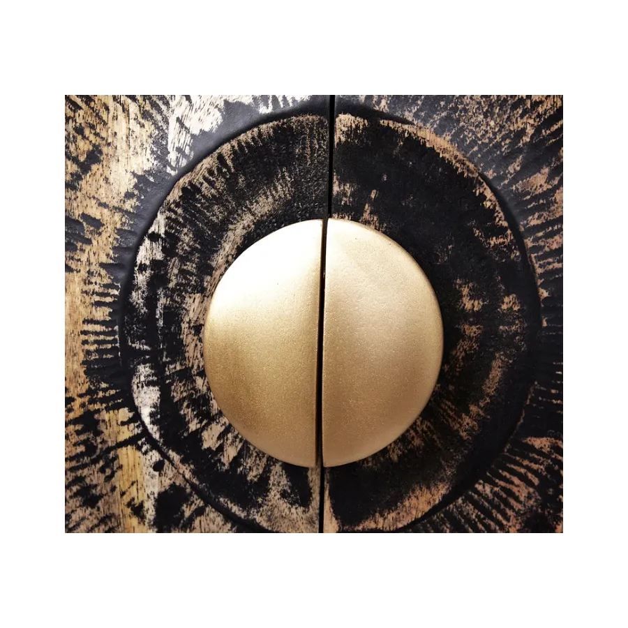 Komoda GOLDEN SUNSET z promiennymi akcentami łączy w sobie dużo miejsca do przechowywania i ciekawy designe. Komoda GOLDEN SUNSET została zaprojektowana z czarnym korpusem z drewna mango, a fronty ozdobione są ogromnym, złotym ornamentem dzięki czemu sprawiaja wrażenie ekstrawagancko zaprojektowanych drzwiczek. Elementy komody również wykonane są w eleganckim złocie.