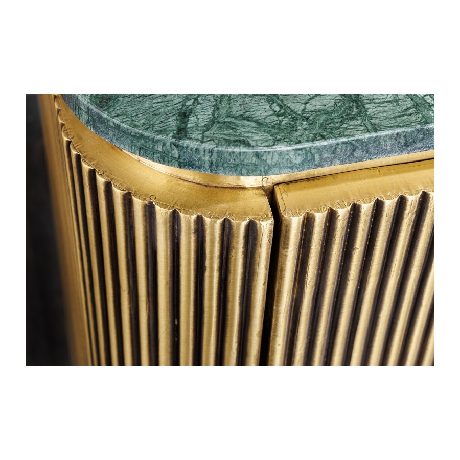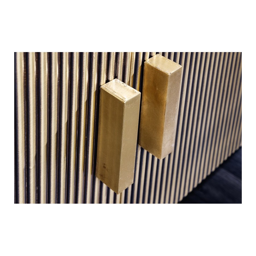 Produkt ten to niezwykły mebel, który wkracza do Twojego domu. Duże drzwi wejściowe i korpus wykonano z litego drewna mango. Drewno mango zachwyca ekscytującymi przejściami kolorów i indywidualnym usłojeniem. Zaokrąglone boki, ryflowana drewniana powierzchnia i matowa metalowa rama w kolorze złotym zapewniają idealne połączenie nowoczesnego wyglądu i stylu retro.