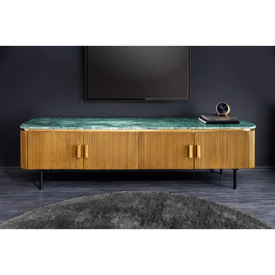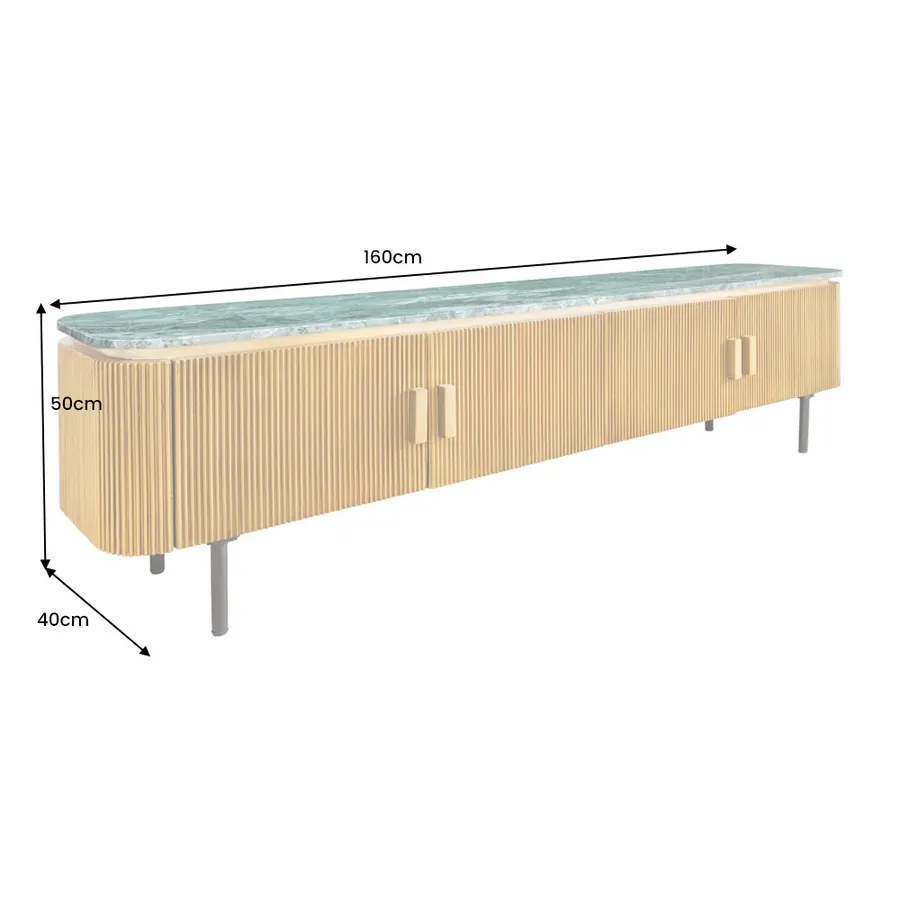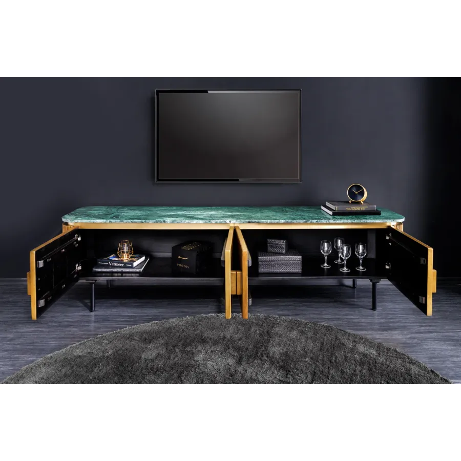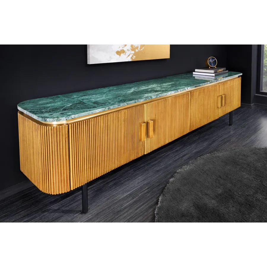 Za dwojgiem drzwi znajdują się cztery duże przegródki. Dzięki tej komodzie oferuje wystarczająco dużo miejsca do przechowywania wszystkich przyborów kuchennych, które chcesz przechowywać poza zasięgiem wzroku. Niezależnie od tego, czy są to naczynia i szklanki w jadalni, książki w salonie, czy teczki i przybory do pisania w biurze: ekstrawagancki kredens świetnie prezentuje się w każdym pomieszczeniu i można go na różne sposoby łączyć z innymi meblami z kolekcji GATSBY dostępnymi na naszej stronie !