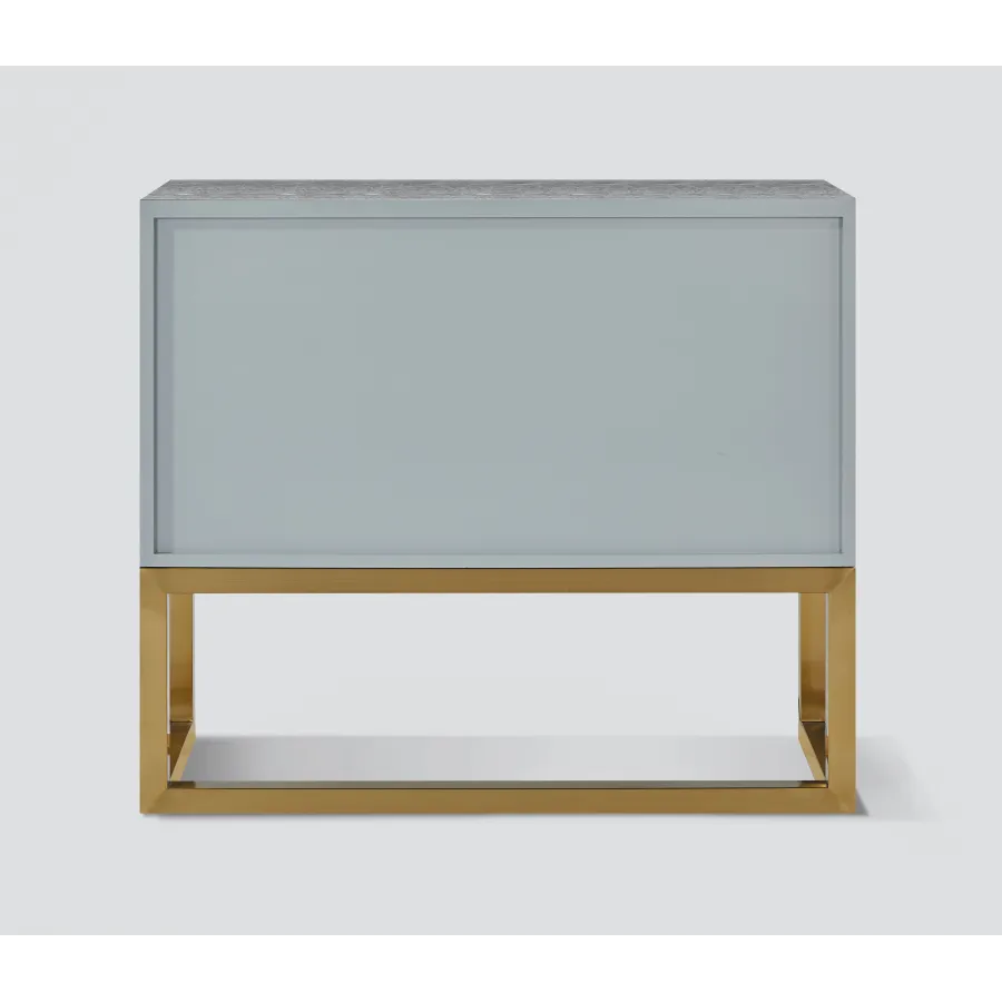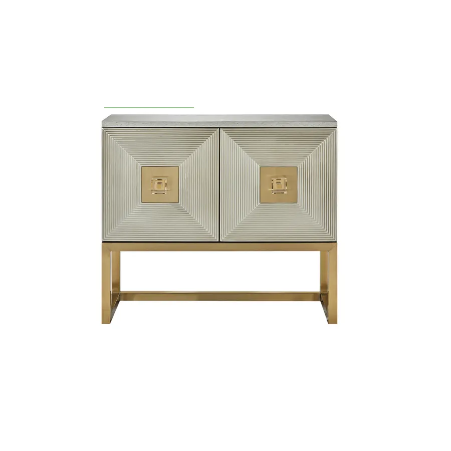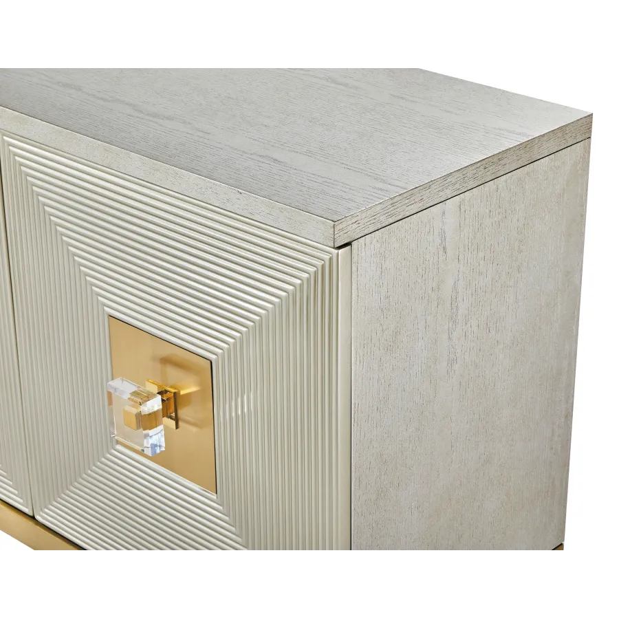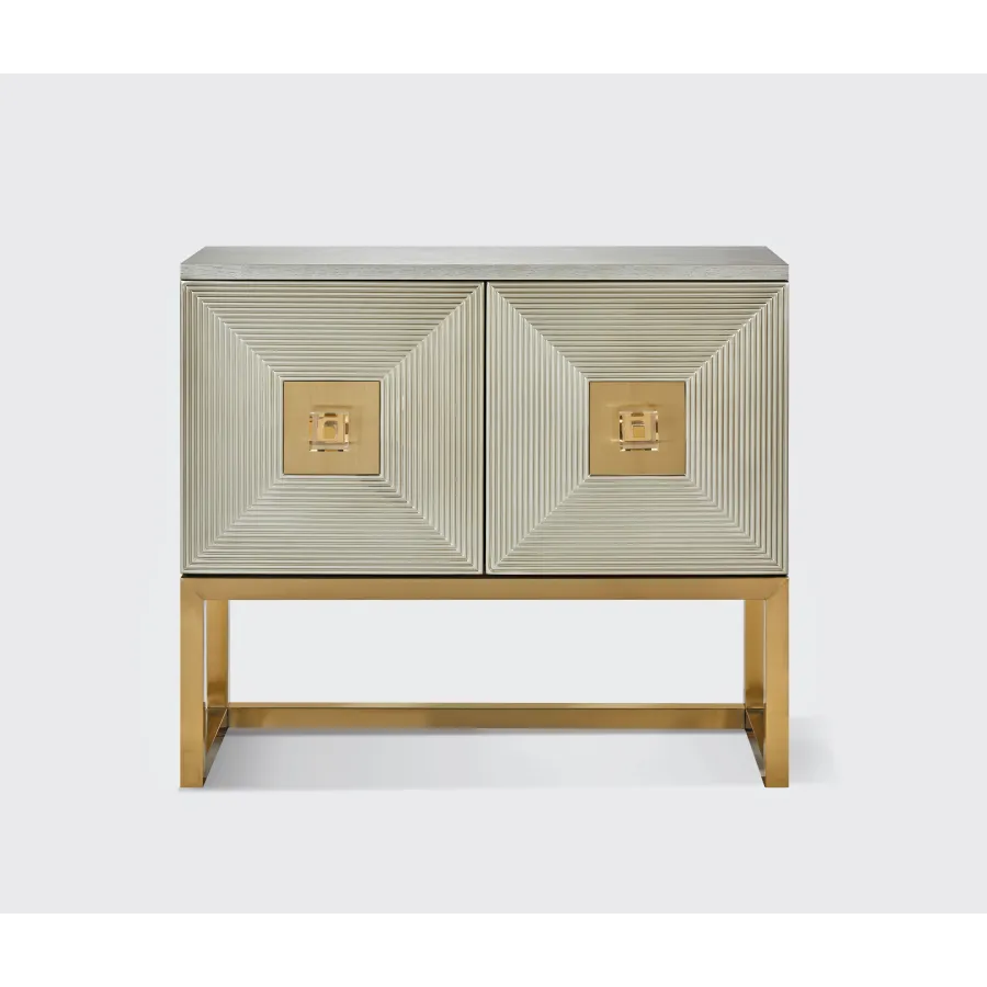 Oryginalna komoda w kolorze szampańskiego złota. Prosty design przełamany jest frontami z symetrycznymi ryflowaniami w pionie i poziomie oraz centralnie umieszczonymi ozdobnymi, złotymi uchwytami.