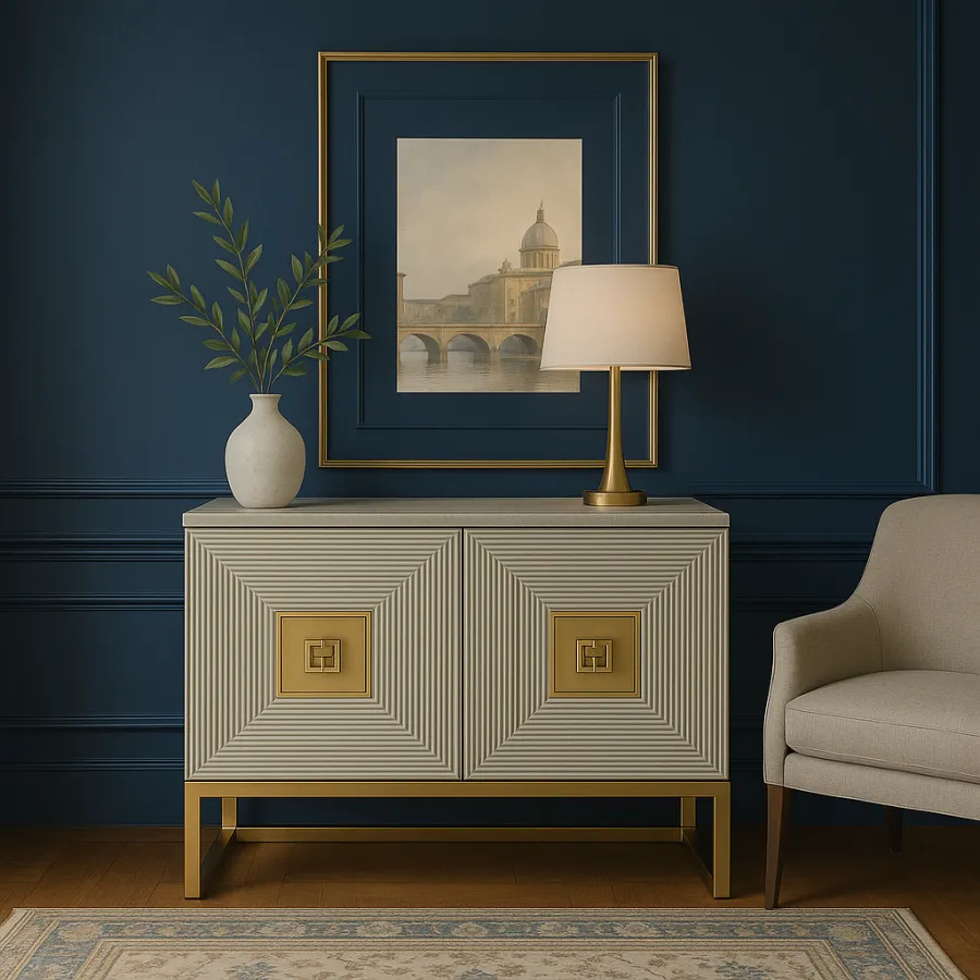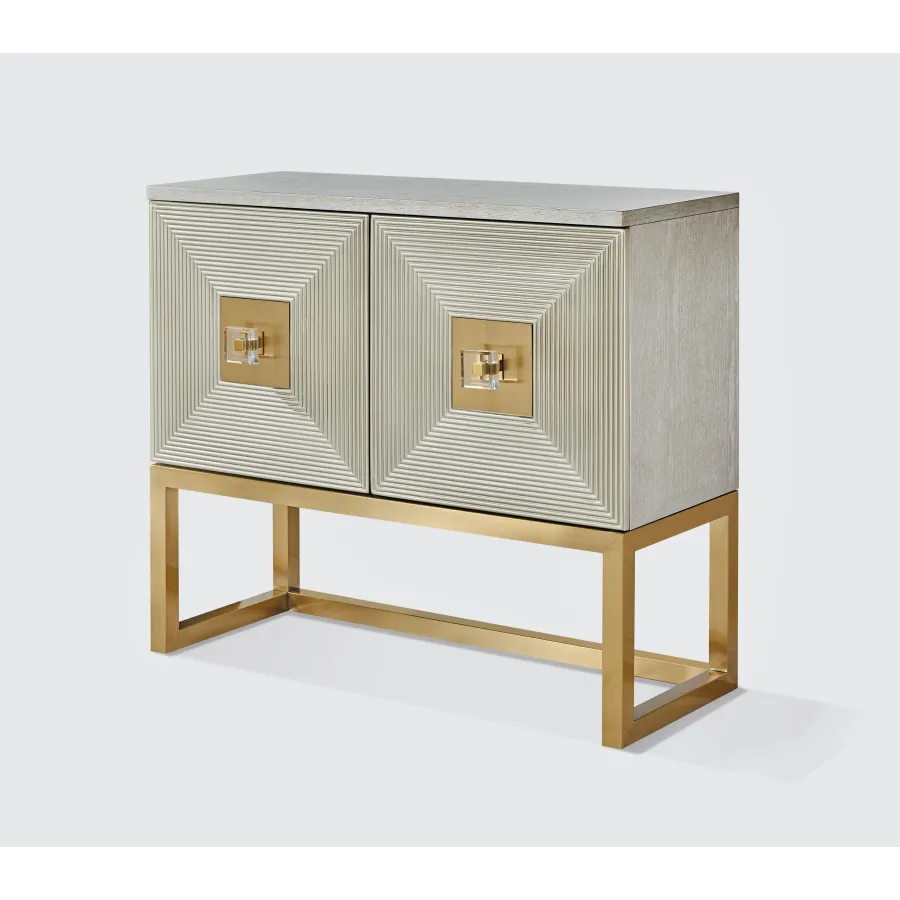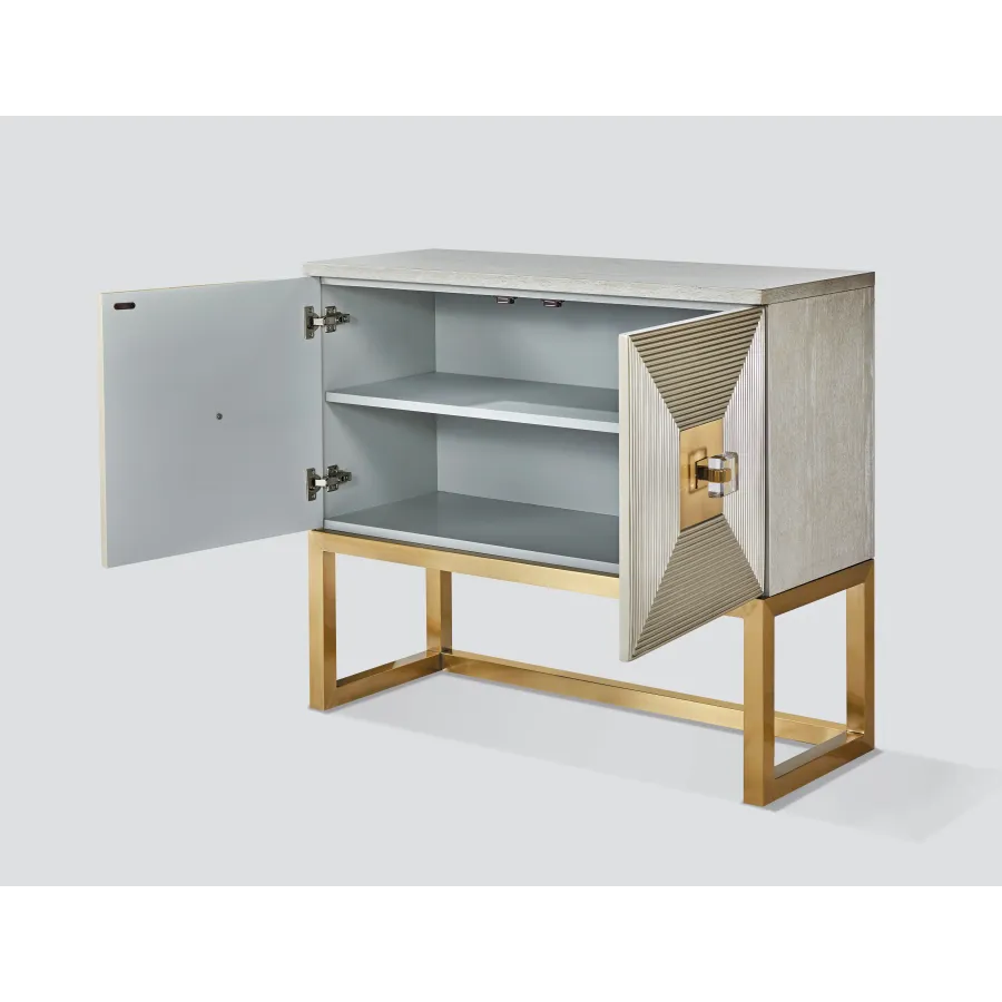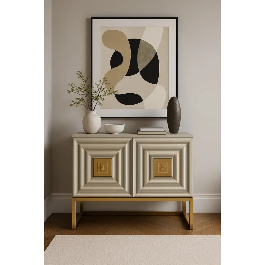 Oryginalna komoda w kolorze szampańskiego złota. Prosty design przełamany jest frontami z symetrycznymi ryflowaniami w pionie i poziomie oraz centralnie umieszczonymi ozdobnymi, złotymi uchwytami.
