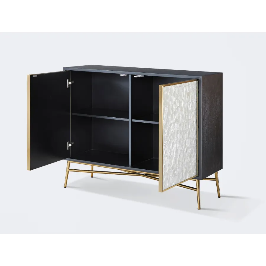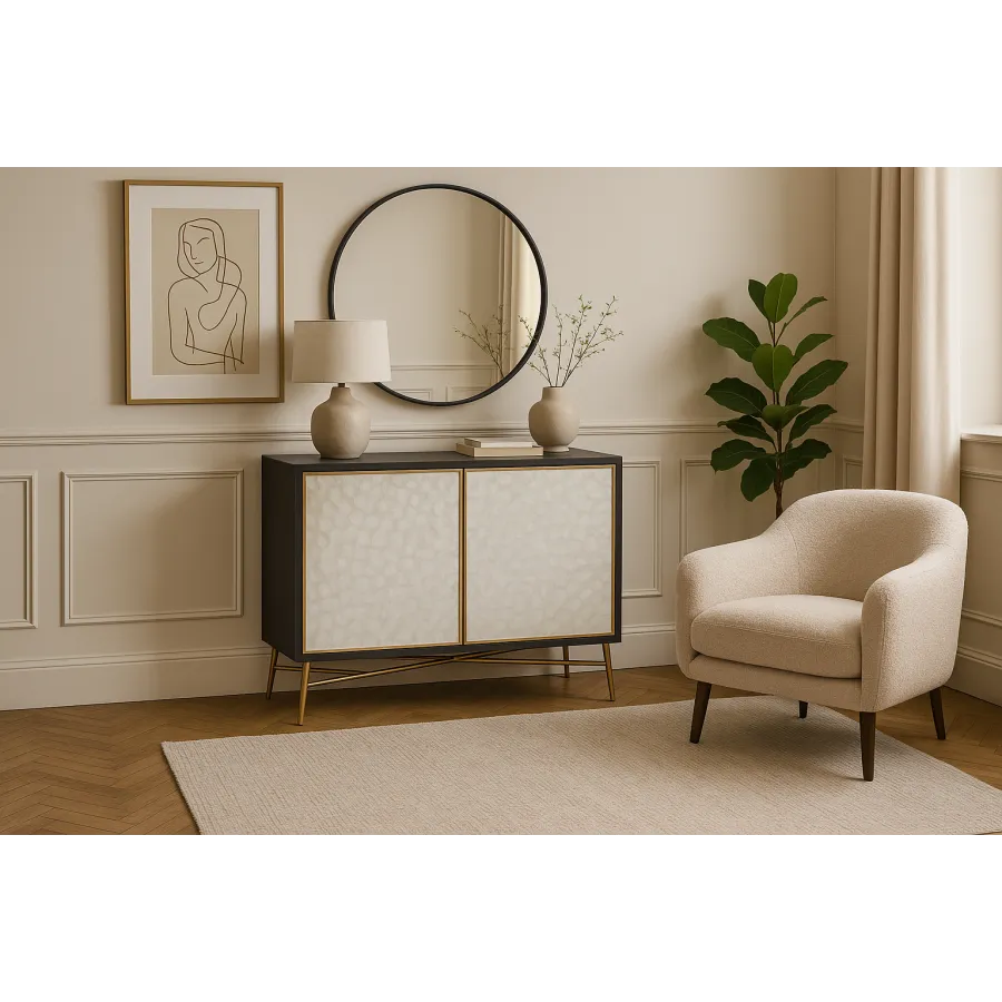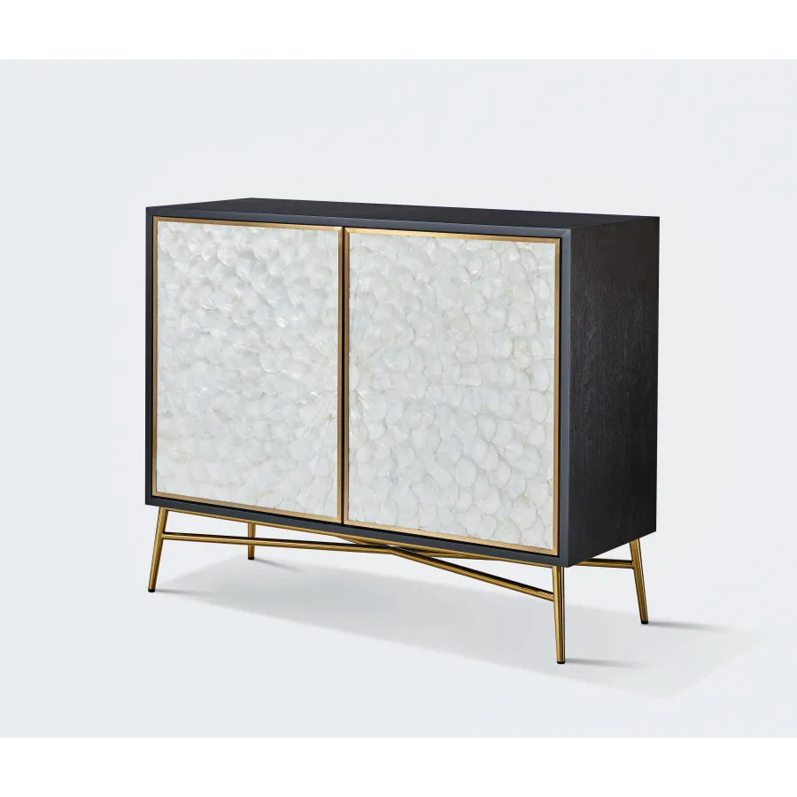 Oryginalna komoda w kolorze grafitowym z frontem wykonanym z naturalnej muszli układającej się w symetryczny, promienisty wzór. Korpus posiada widoczną strukturę drewna.