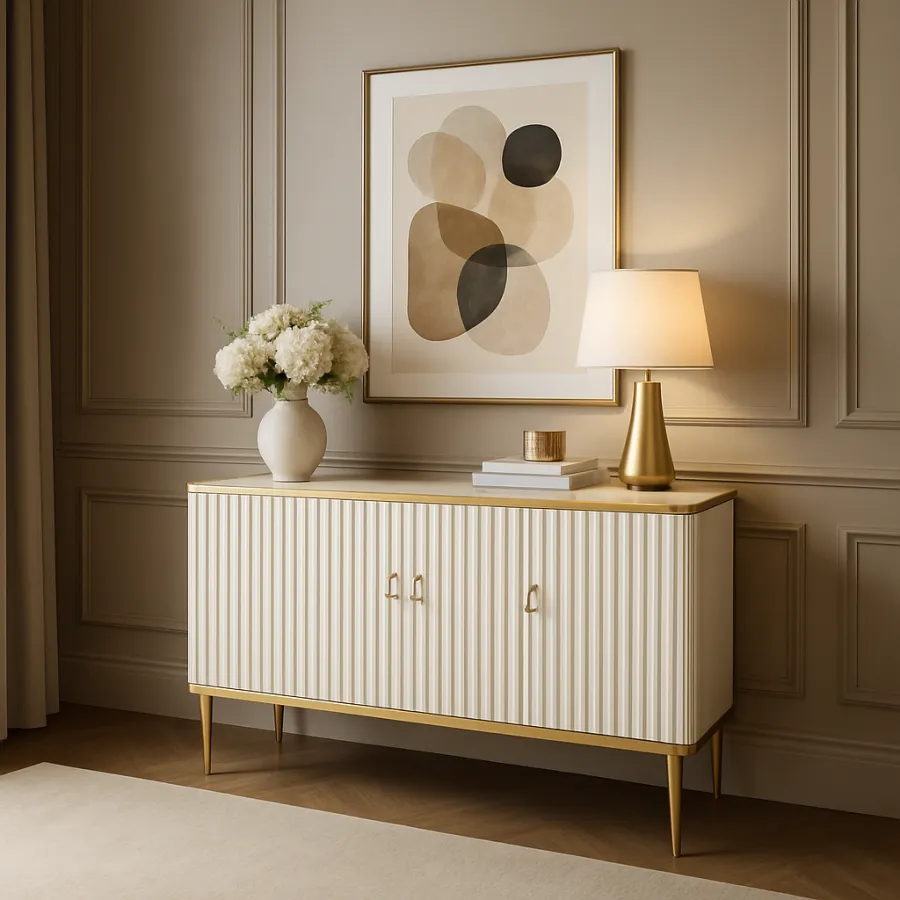 Stylowa komoda w kolorze złamanej bieli ze złotymi akcentami i nóżkami. Korpus posiada ryflowane drewno oraz złote obramowanie blatu oraz wieńca dolnego.