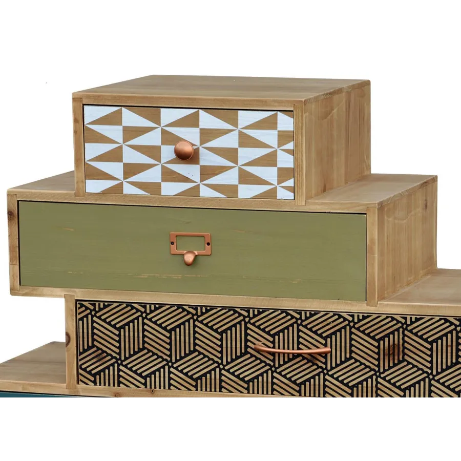 Komoda ręcznie malowana w stylu retro, vintage wykonana z płyty MDF z okleiną z naturalnego, surowego drewna jodłowego na metalowych nóżkach hairpin w kolorze miedzianym.