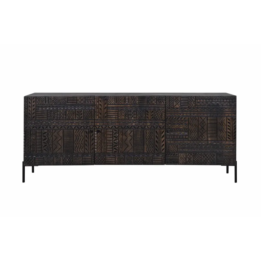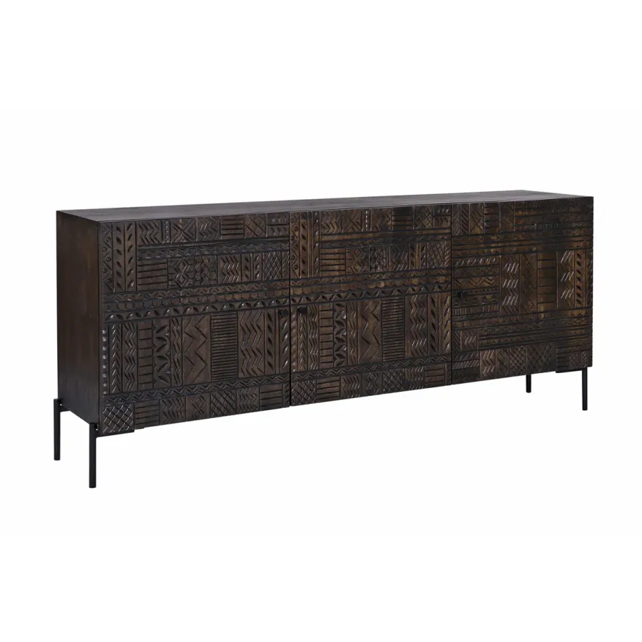 Dzięki komodzie TRIBAL wniesiesz do swojego domu nutę egzotyki i autentyczności. Wykonana z lakierowanego drewna mango w kolorze antycznego brązu, ta komoda zachwyca solidnym, trójwymiarowym frontem z ozdobnymi wzorami. Każdy detal odzwierciedla tradycyjne rzemiosło, dzięki czemu komoda przyciąga wzrok. Antyczny design idealnie komponuje się z nowoczesną technologią otwierania typu push-to-open, która umożliwia eleganckie otwieranie drzwi bez użycia uchwytów.
