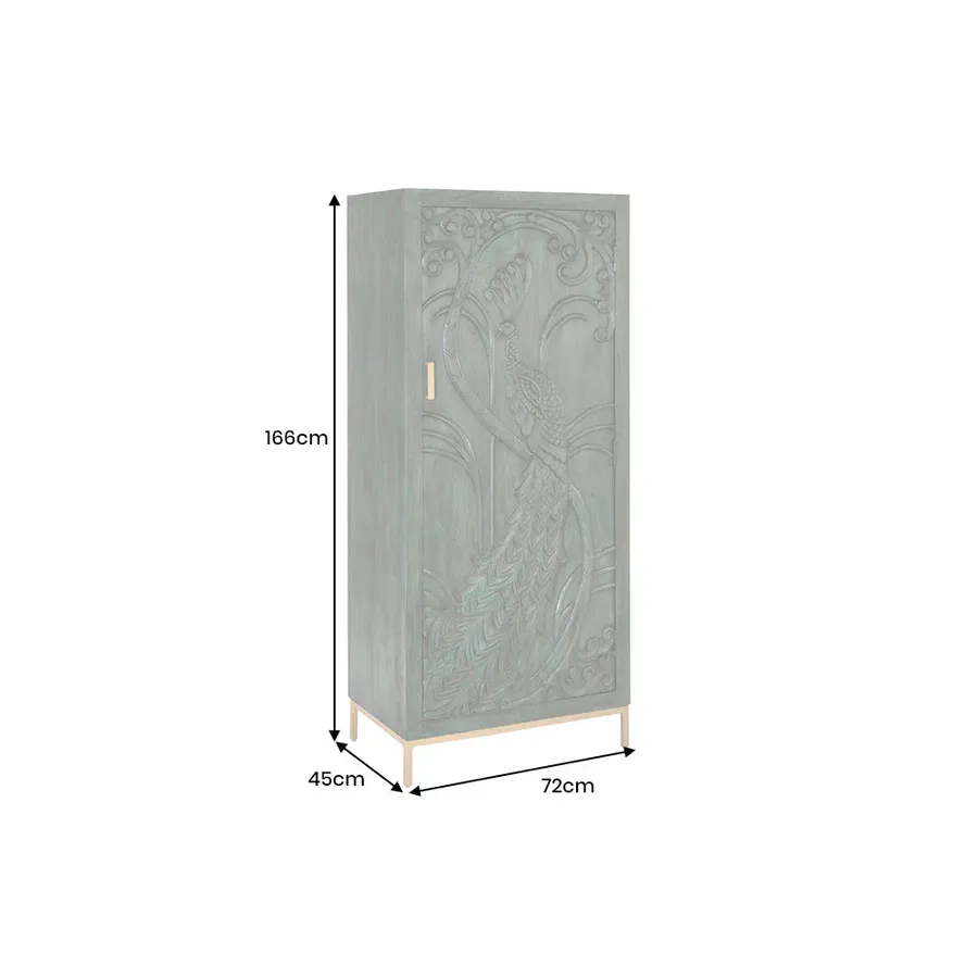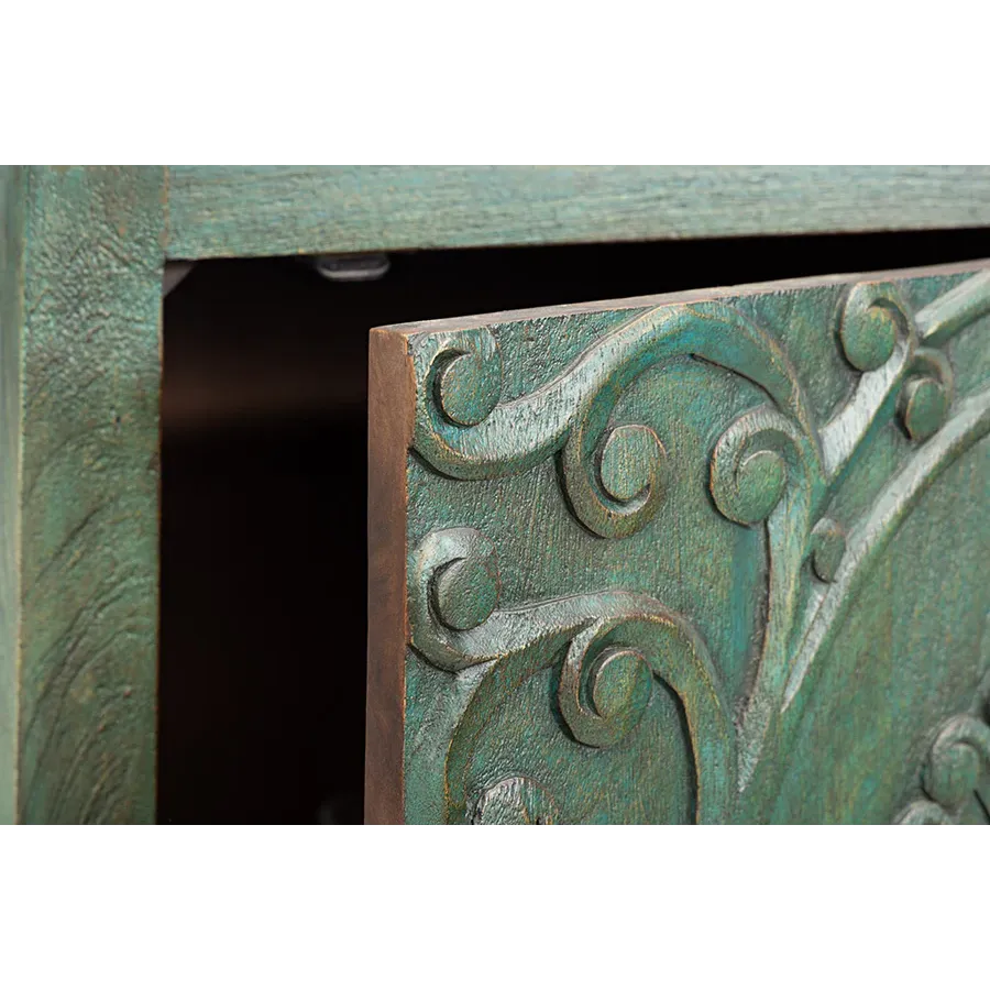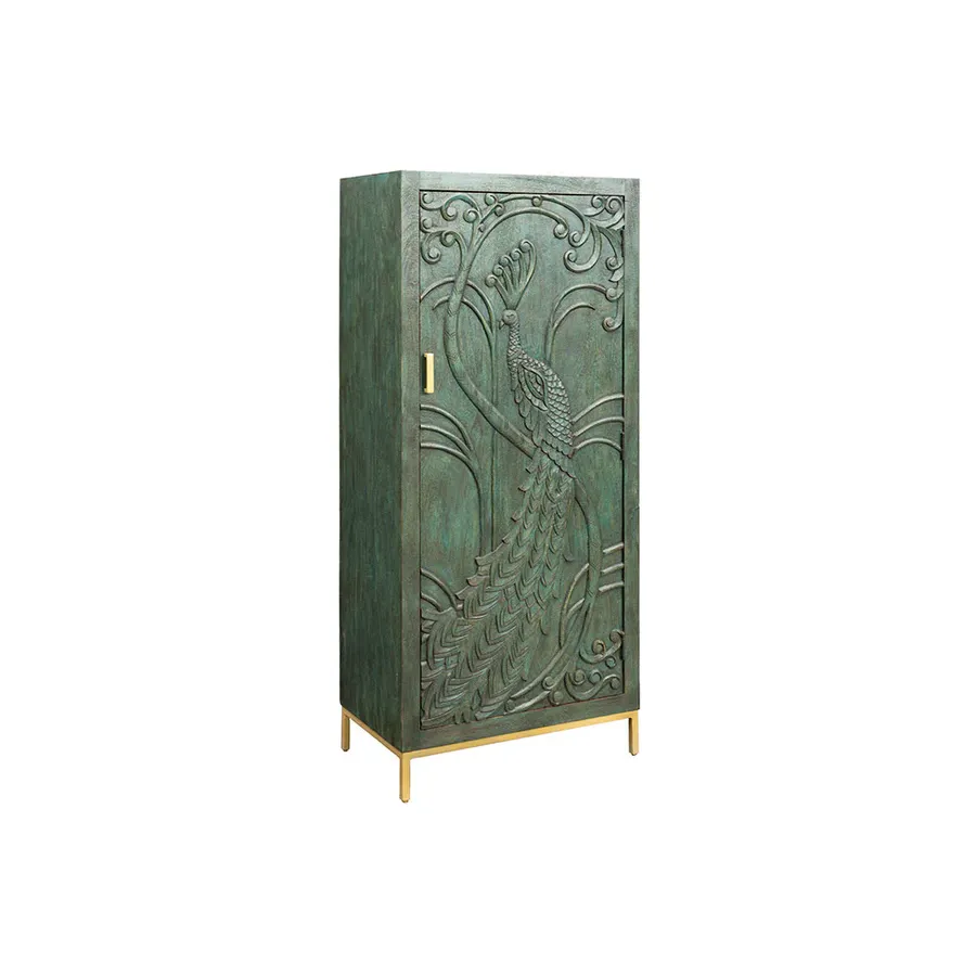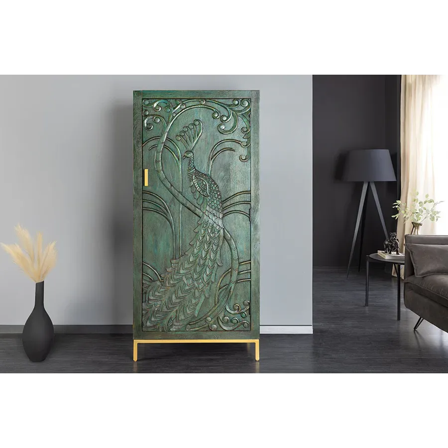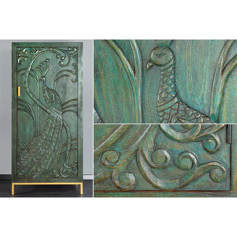Komoda PEACOCK to wyjątkowy mebel, który zagości w Twoim domu. Wykonana z litego, lakierowanego na zielony kolor drewna mango, komoda zachwyca unikalnym wykończeniem i misternie frezowanym, ręcznie wykonanym frontem z trójwymiarowym wzorem pawia. Szczegółowy design nawiązuje do antycznego rękodzieła i sprawia, że mebel stanowi stylowy akcent w każdym wnętrzu.