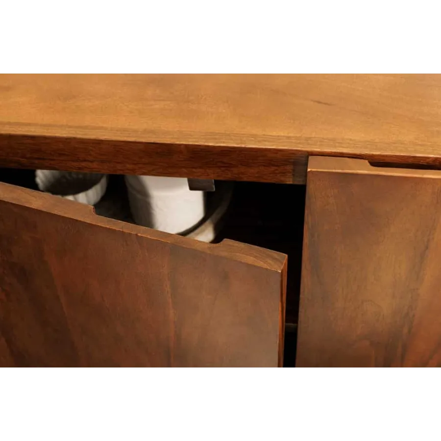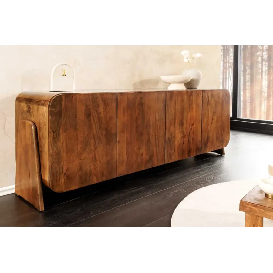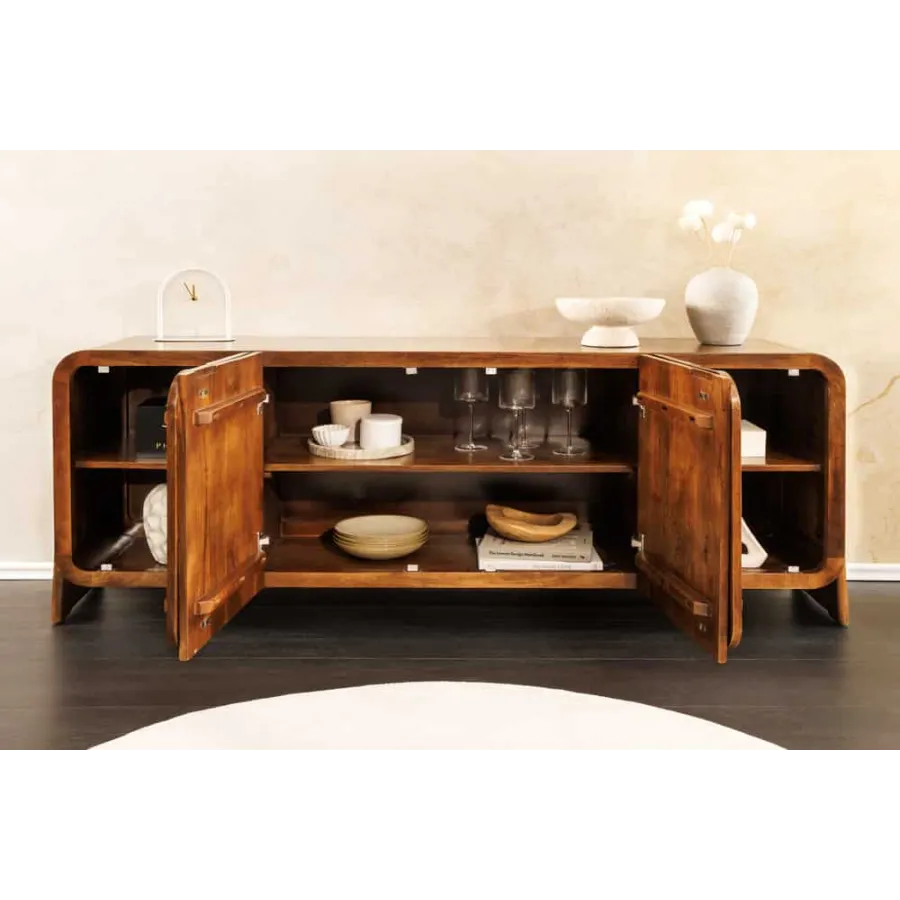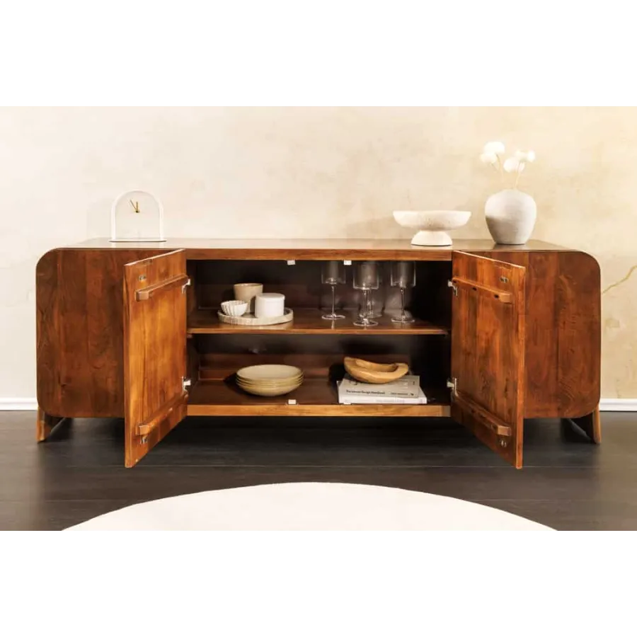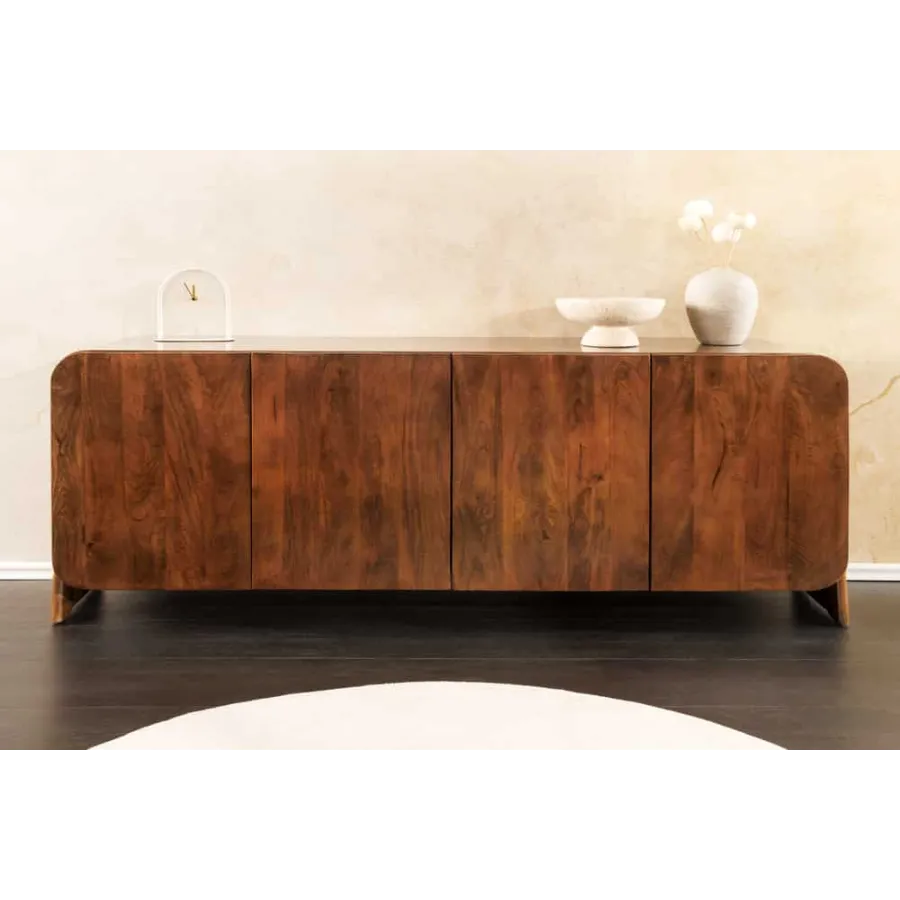 Komoda BRASIL dostarczany jest w stanie zmontowanym i zachwyca opływowym, bezuchwytowym designem. Za czworgiem bezuchwytowych drzwiczek kryją się cztery pojemne przegródki, oferujące wszechstronne miejsce do przechowywania naczyń, dekoracji lub dokumentów. Efektowne nóżki boczne nadają kredensowi stylową lekkość i podkreślają jego ręcznie robiony charakter. Niezależnie od tego, czy znajduje się w salonie, jadalni, czy przedpokoju – BRASIL to funkcjonalny element przyciągający wzrok o naturalnym charakterze.