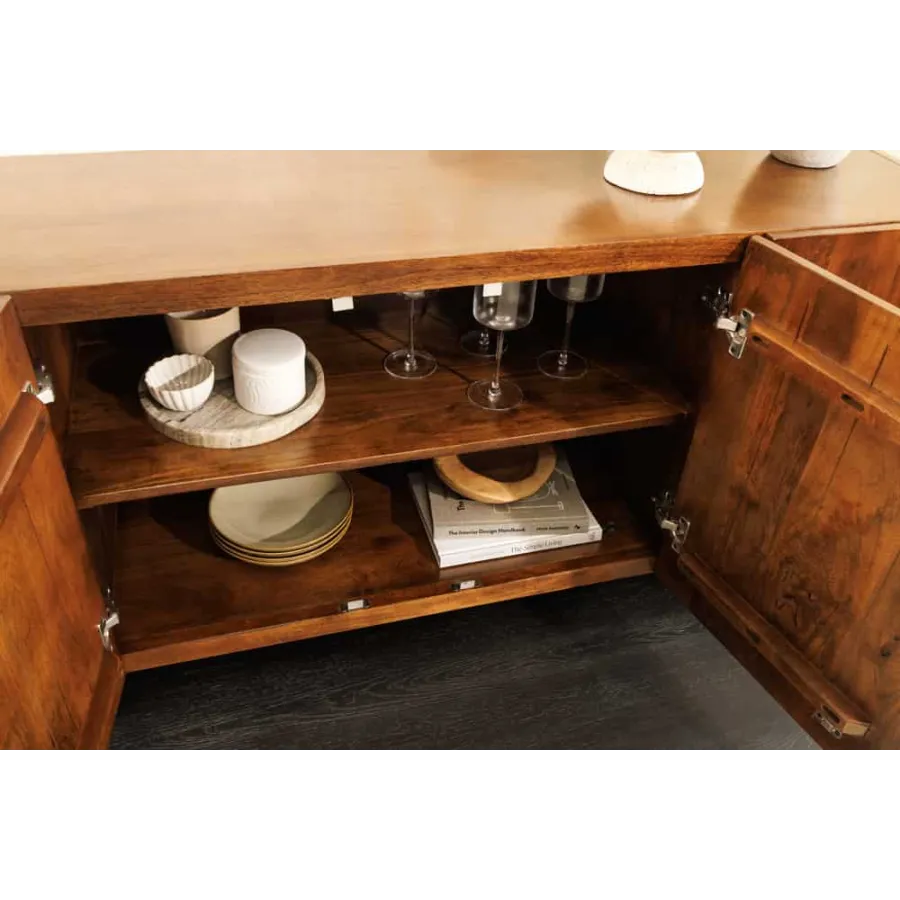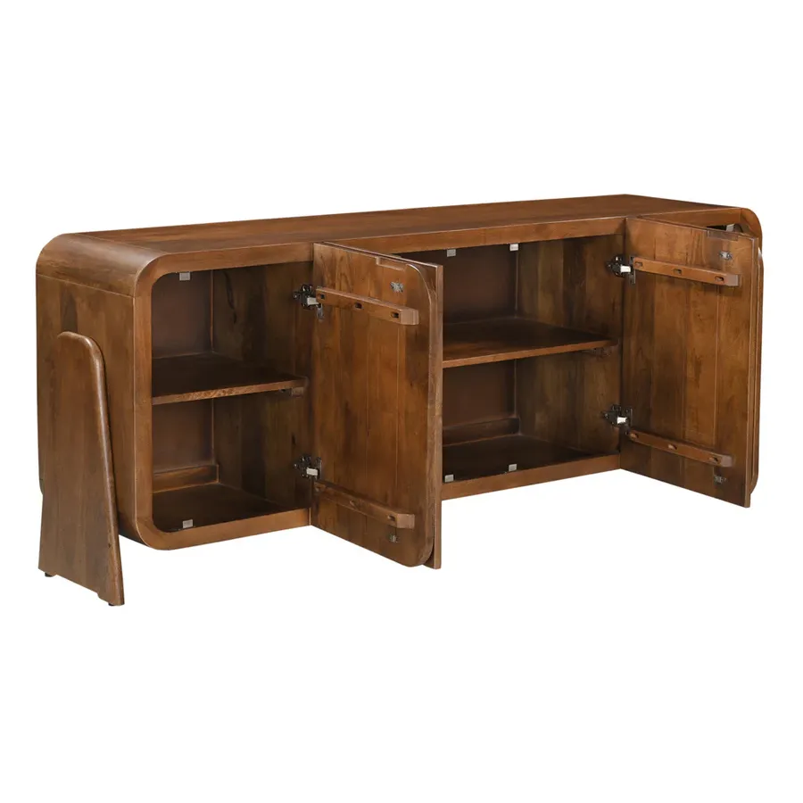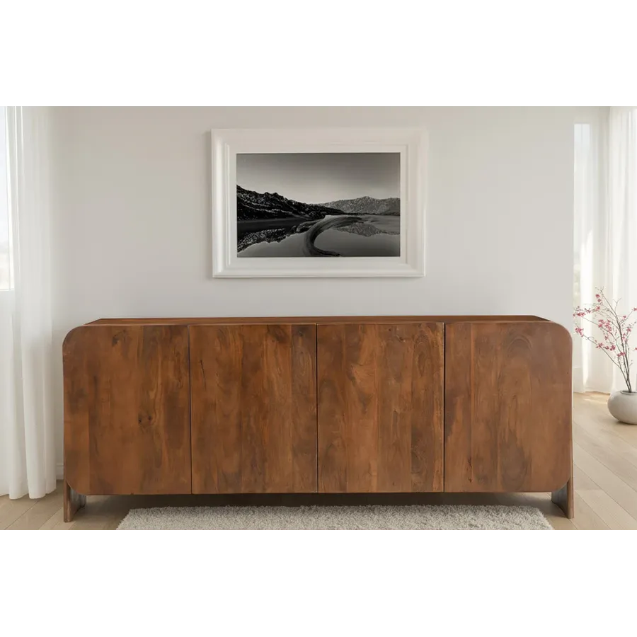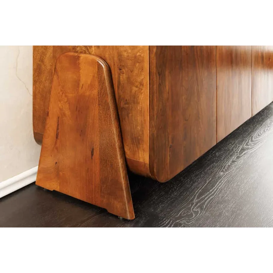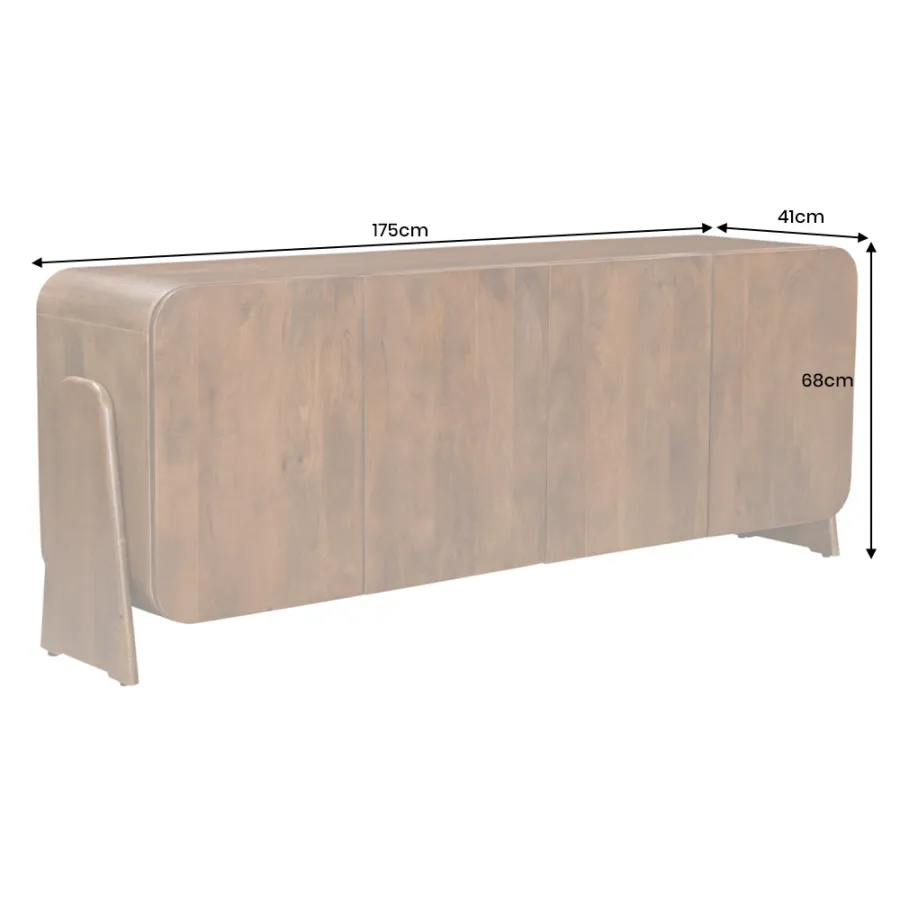 Komoda BRASIL dostarczany jest w stanie zmontowanym i zachwyca opływowym, bezuchwytowym designem. Za czworgiem bezuchwytowych drzwiczek kryją się cztery pojemne przegródki, oferujące wszechstronne miejsce do przechowywania naczyń, dekoracji lub dokumentów. Efektowne nóżki boczne nadają kredensowi stylową lekkość i podkreślają jego ręcznie robiony charakter. Niezależnie od tego, czy znajduje się w salonie, jadalni, czy przedpokoju – BRASIL to funkcjonalny element przyciągający wzrok o naturalnym charakterze.