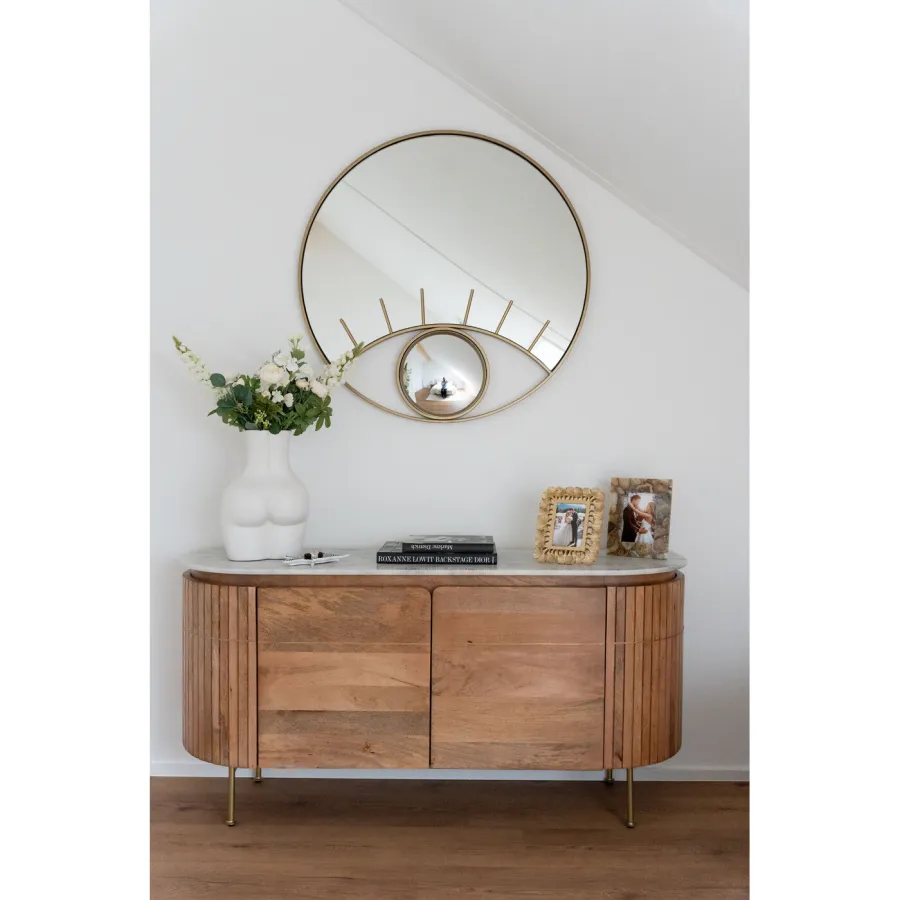 Komoda Grace o wymiarach 160x78 cm, wykonana z drewna mango z eleganckim marmurowym blatem. Posiada zaokrąglone boki i smukłe metalowe nóżki, idealna do wnętrz w stylu nowoczesnym i klasycznym.