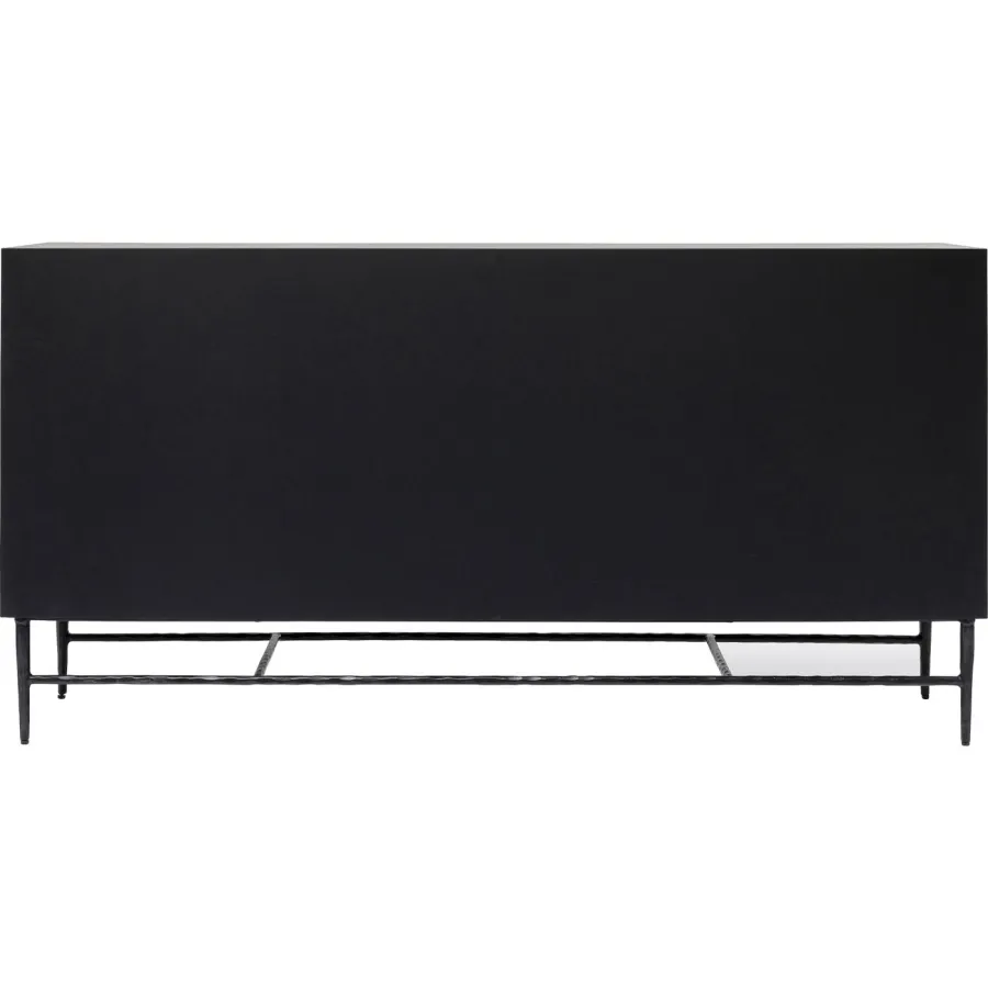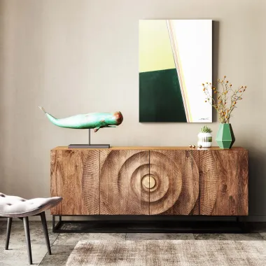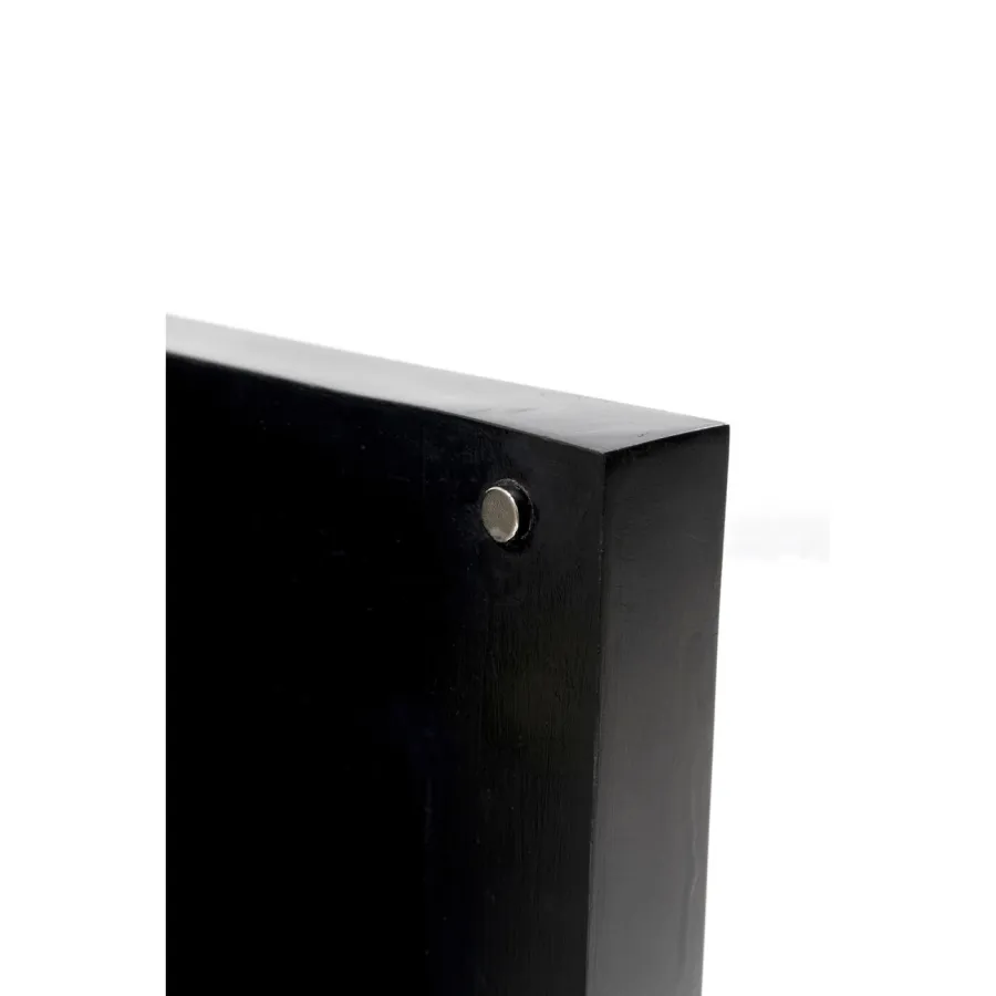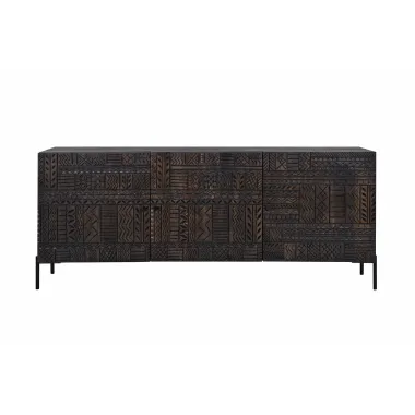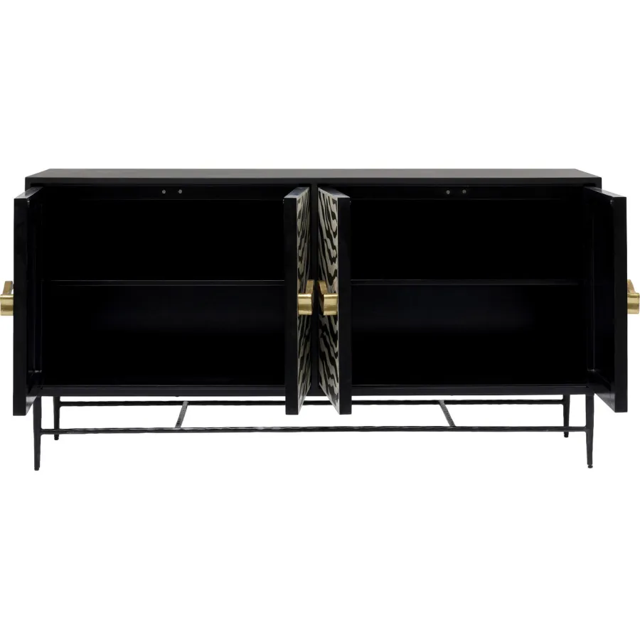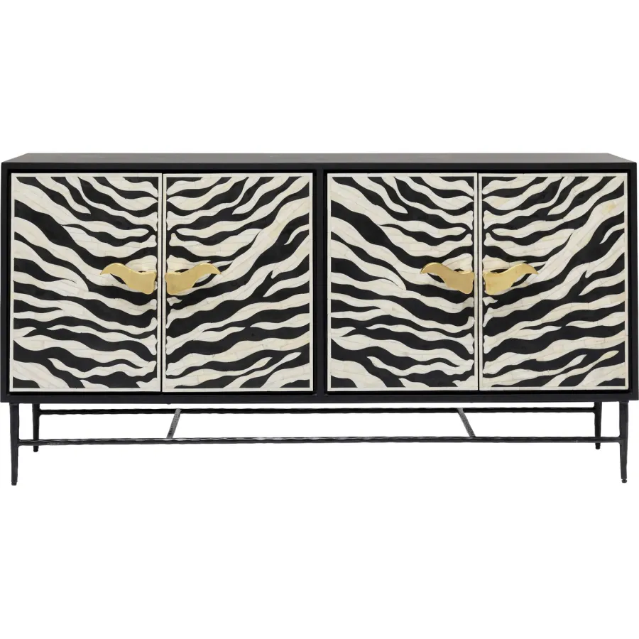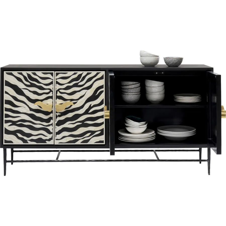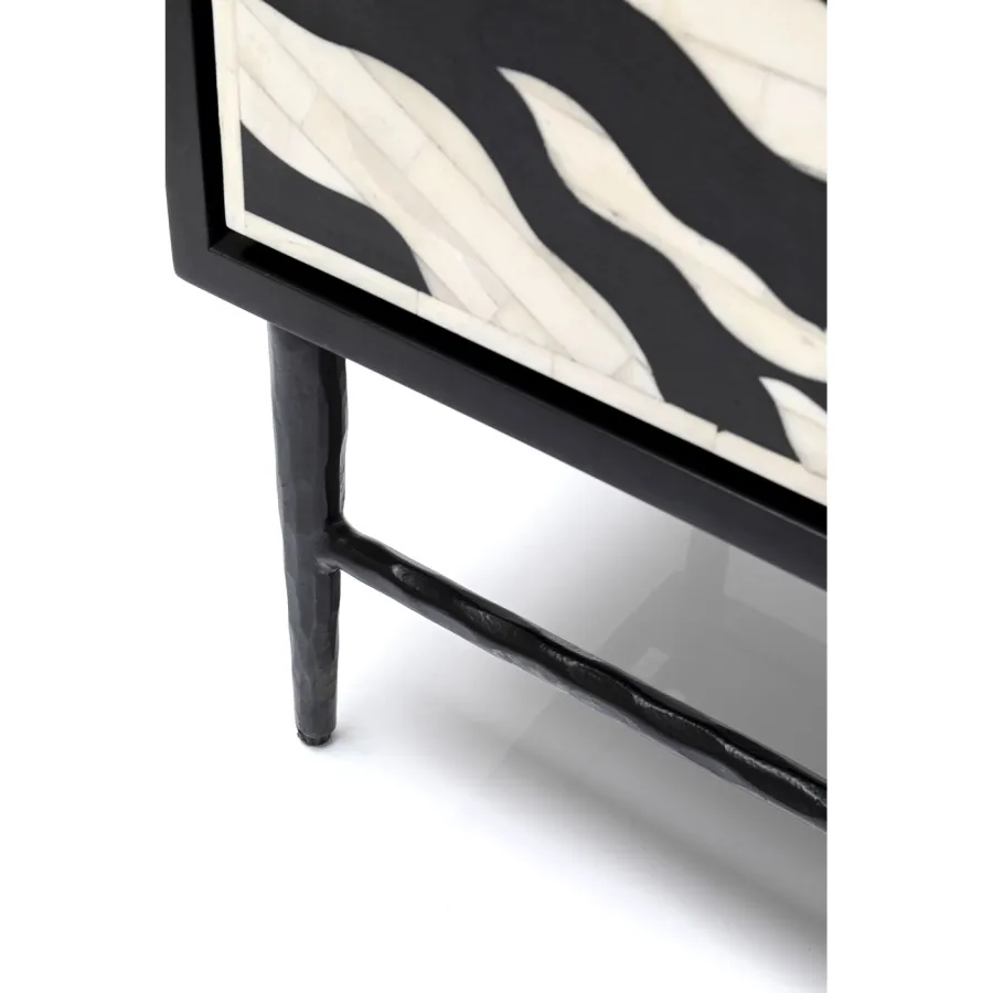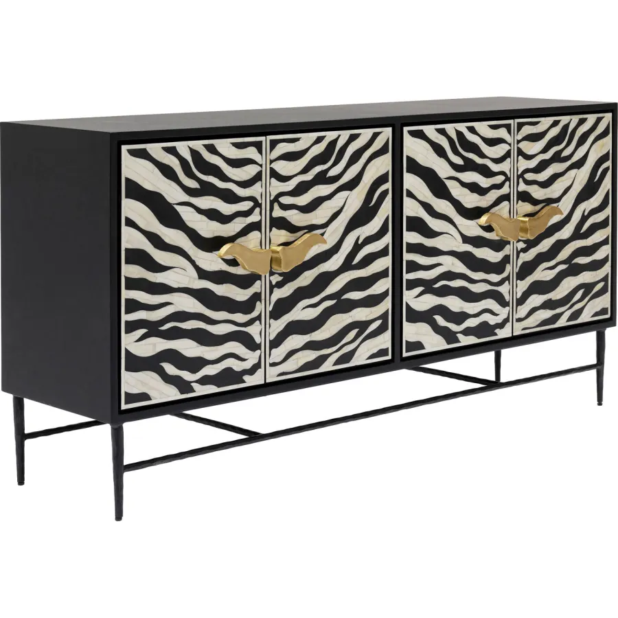 Komoda Zebra o wymiarach 160 × 80 × 40 cm, z frontami w czarno-kremowy motyw zebry, ręcznie inkrustowanymi z kości bawolej, zestawionymi z lakierowanym korpusem z lakierowanej MDF-eukaliptusowej. Uchwyt ze stalowego stopu z mosiądzowaną powłoką. Posiada dwie przestrzenie zamknięte drzwiami, półki maks. 8 kg. Solidna stalowa rama z proszkowym lakierem. Każdy egzemplarz jest wyjątkowy — wykonany ręcznie.