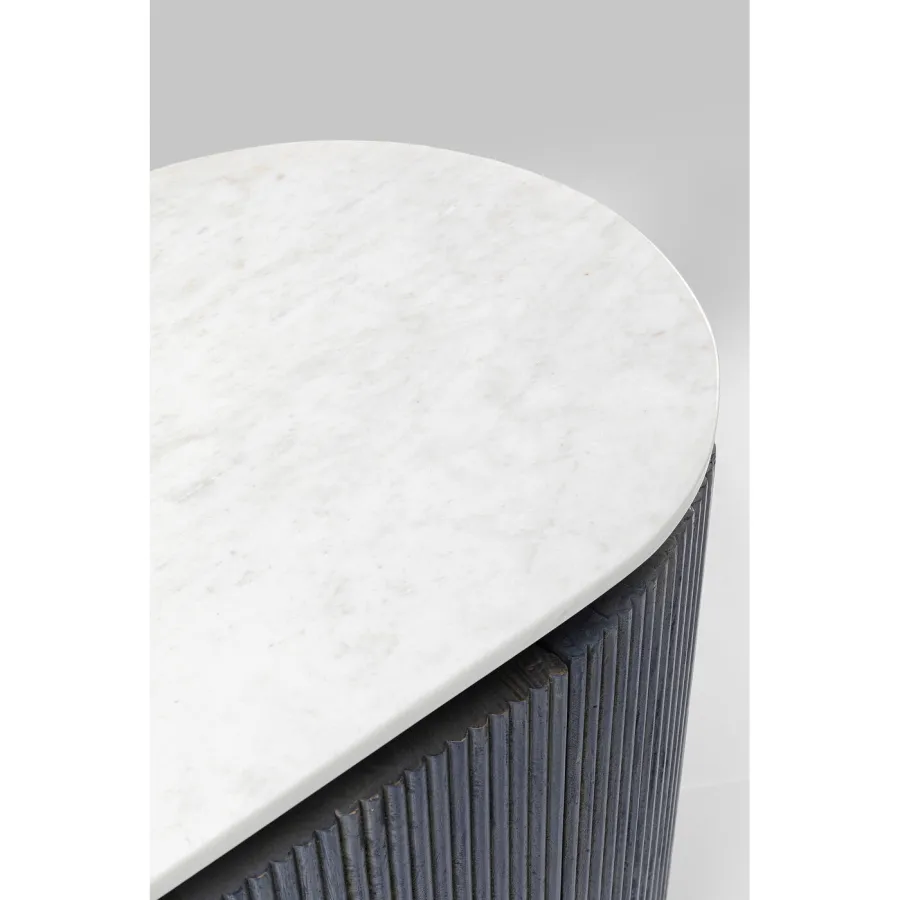 Komoda Glenn to stylowy mebel w nowoczesnym duchu: ciemnoszare, żłobkowane fronty z litego drewna mango, jasno marmurowy blat oraz smukłe, metalowe nóżki. Łączy minimalistyczny design z elegancją i praktycznością, oferując przestronne wnętrze za przesuwnymi drzwiami.