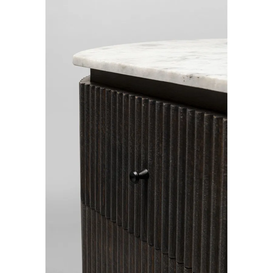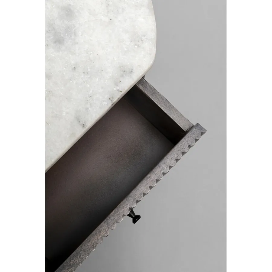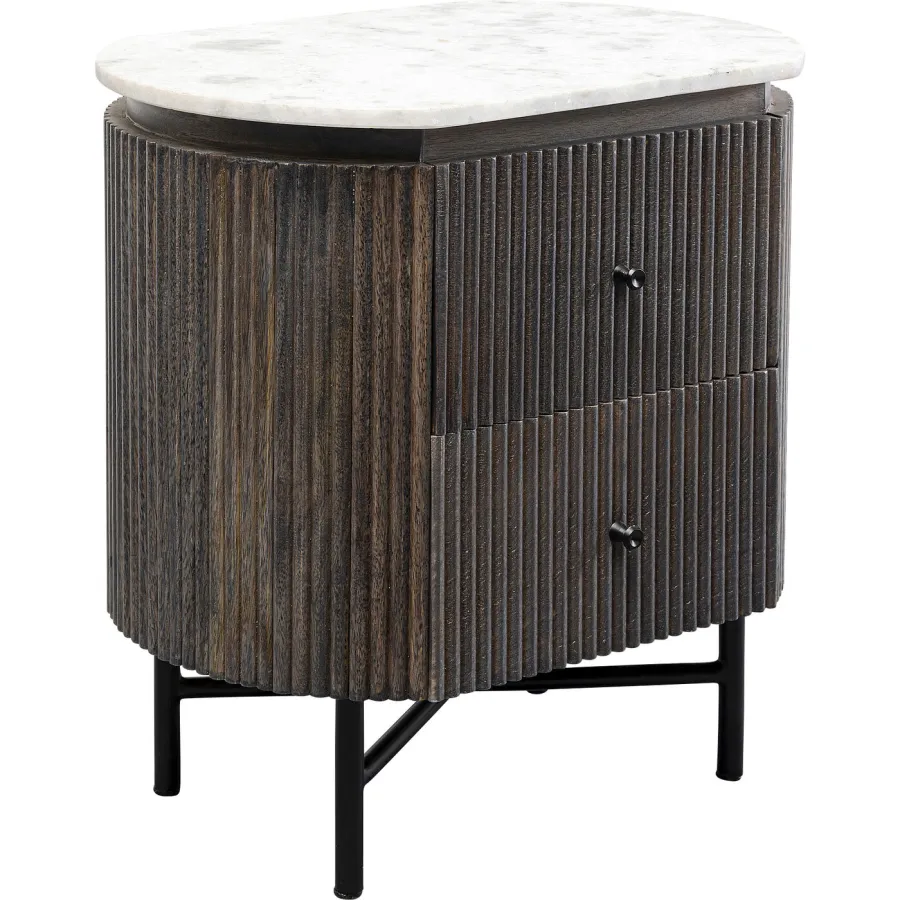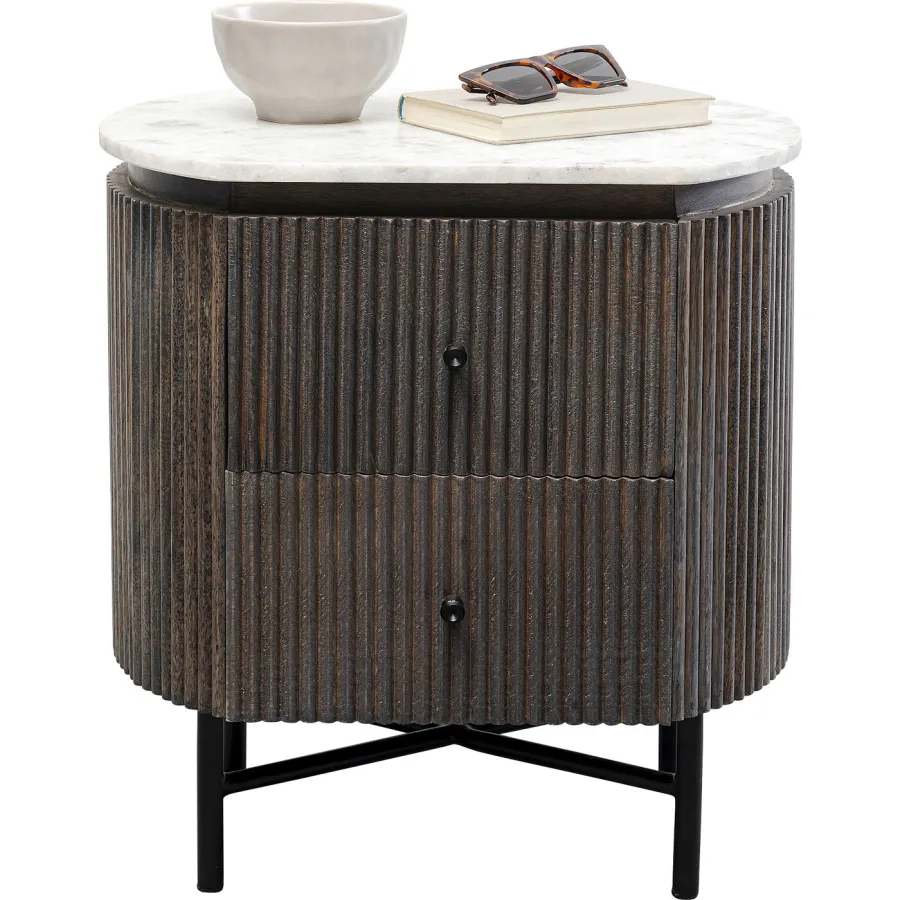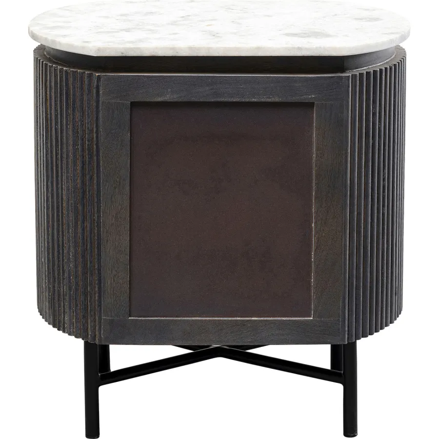 Szafka nocna Glenn to stylowy mebel w nowoczesnym duchu: ciemnoszare, żłobkowane fronty z litego drewna mango, jasno marmurowy blat oraz smukłe, metalowe nóżki. Łączy minimalistyczny design z elegancją i praktycznością, oferując przestronne wnętrze za przesuwnymi drzwiami.