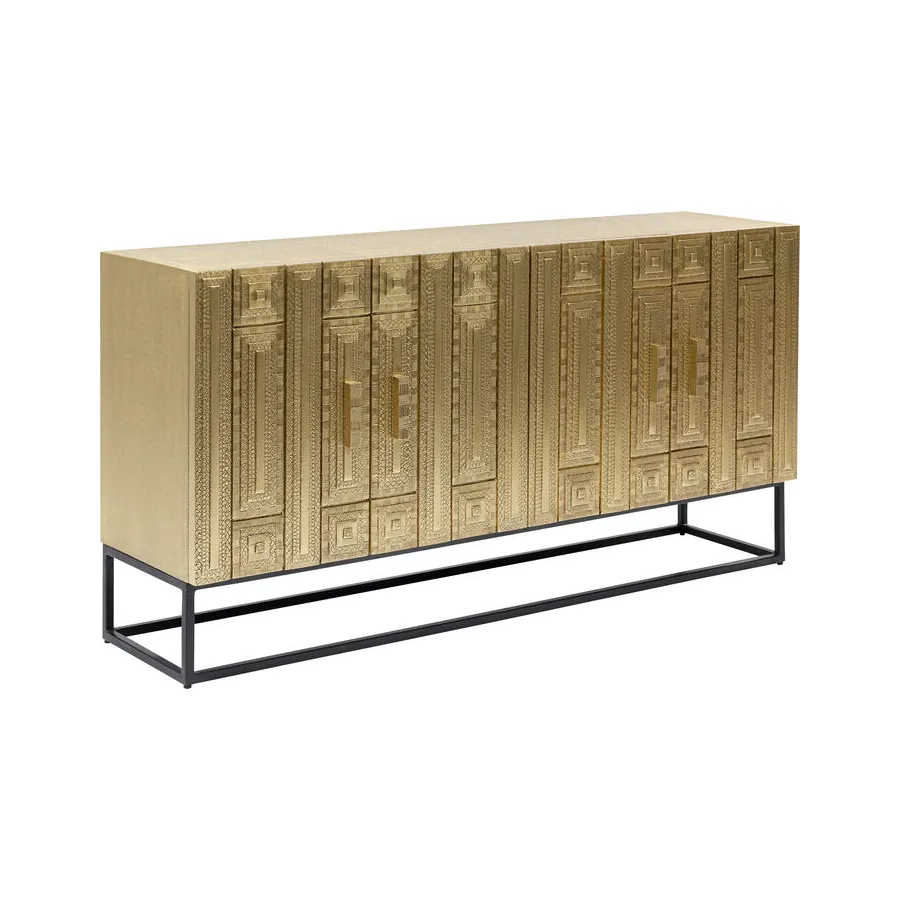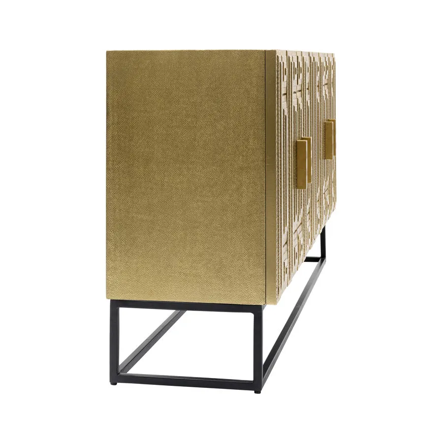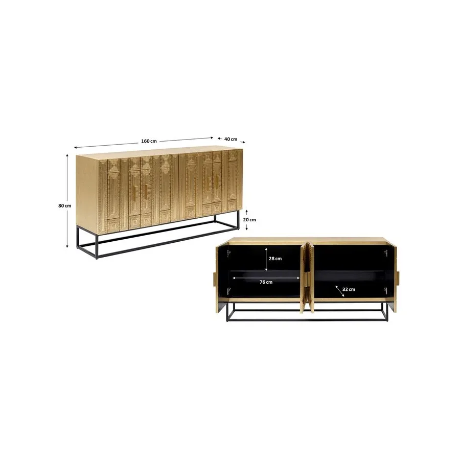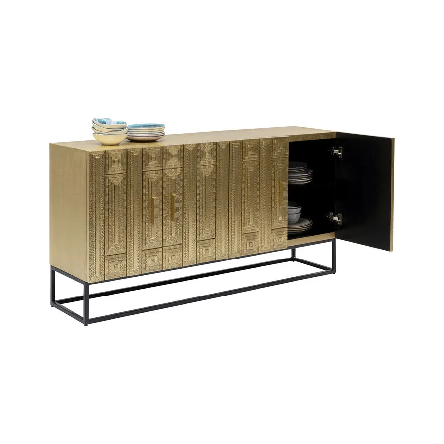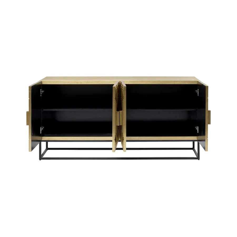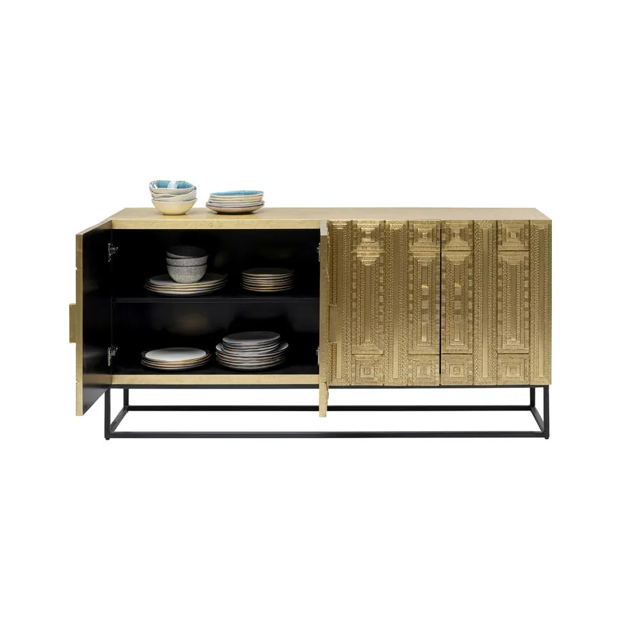 Wprowadź do swojego domu więcej niż odrobinę luksusu! Ten elegancki kredens urzeka uderzającymi kontrastami pomiędzy królewskim mosiądzem i prostą czernią, a także pomiędzy prostym kształtem a ozdobnym, częściowo wykonanym ręcznie frontem. Cechą charakterystyczną jest także funkcja cichego domykania drzwi
