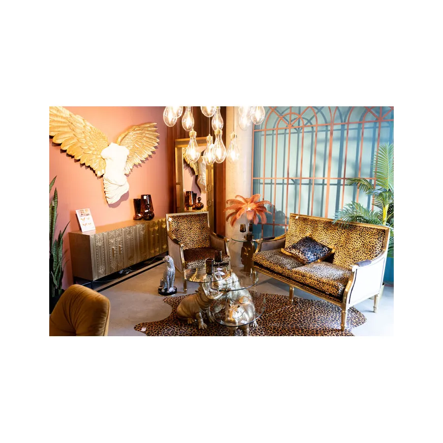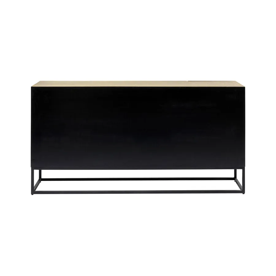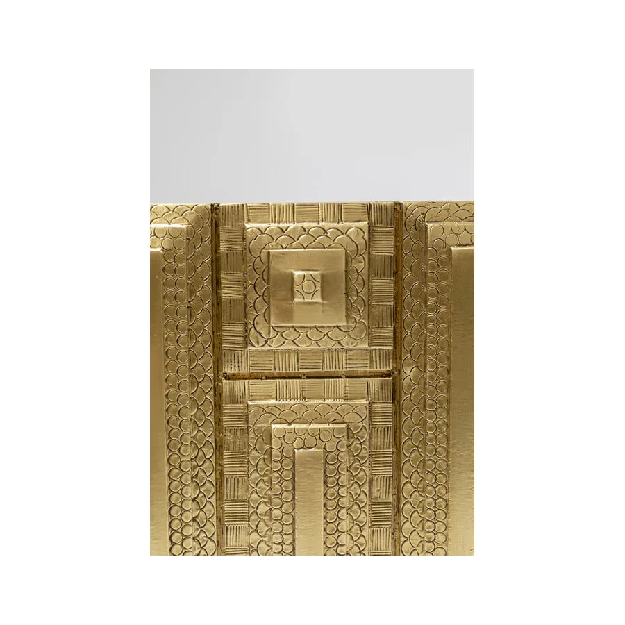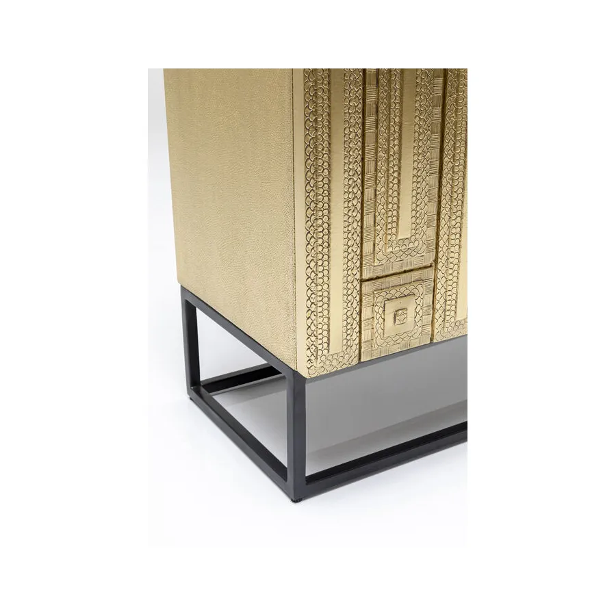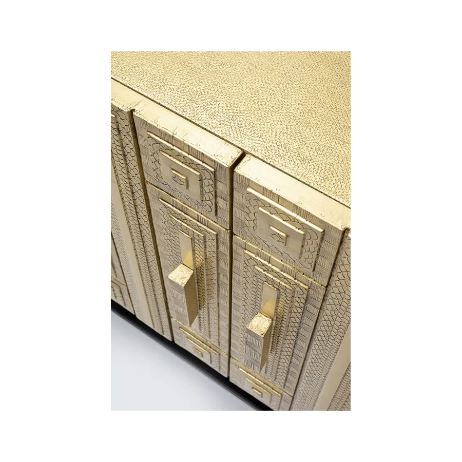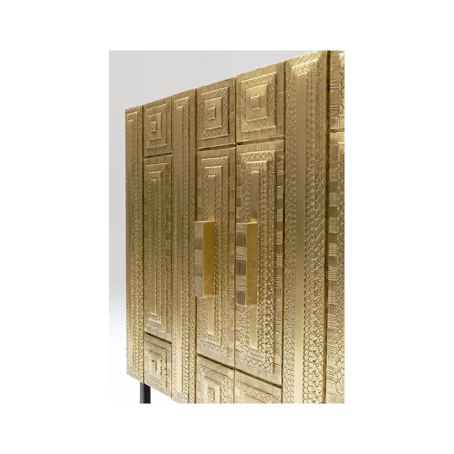 Wprowadź do swojego domu więcej niż odrobinę luksusu! Ten elegancki kredens urzeka uderzającymi kontrastami pomiędzy królewskim mosiądzem i prostą czernią, a także pomiędzy prostym kształtem a ozdobnym, częściowo wykonanym ręcznie frontem. Cechą charakterystyczną jest także funkcja cichego domykania drzwi