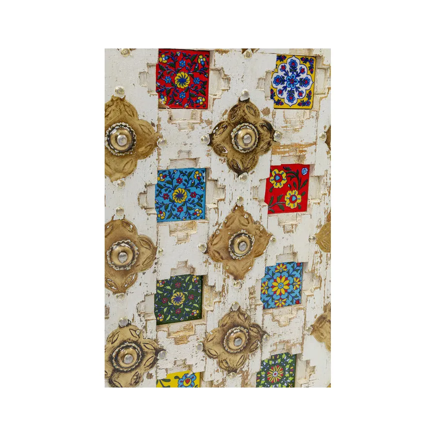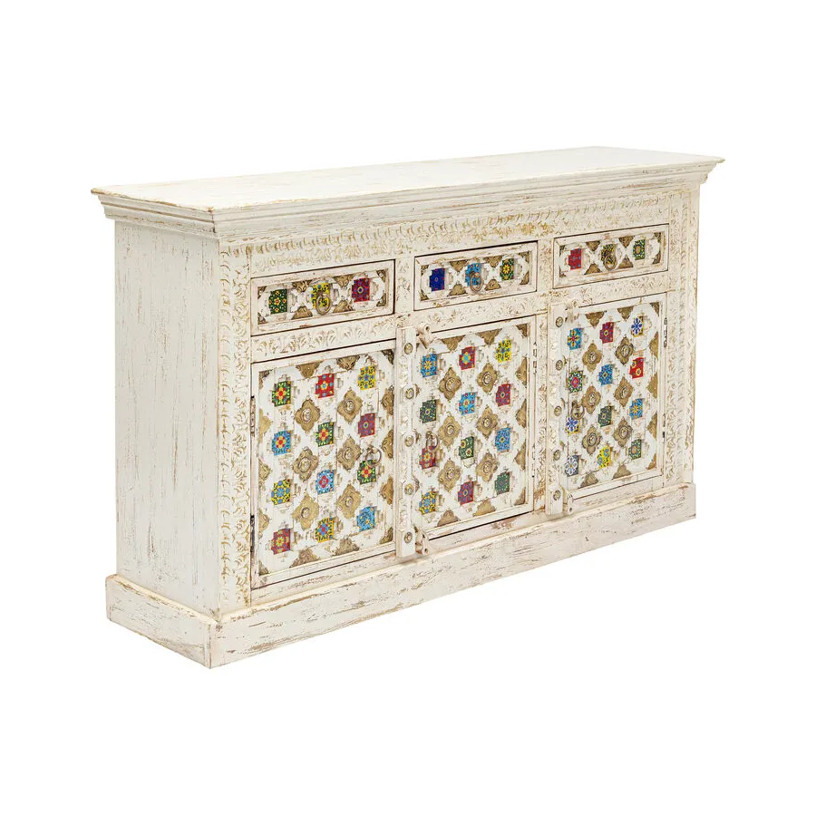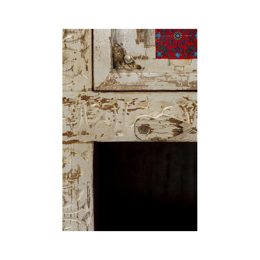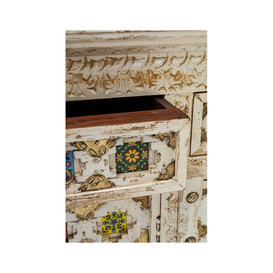 Prawdziwy indywidualista, ten kredens z prawdziwego drewna w stylu antycznym z wieloma kolorowymi wzorzystymi płytkami. W szufladach i zdobionych drzwiach znajduje się dużo miejsca do przechowywania, co czyni ten kredens tak praktycznym. Przede wszystkim ten wyjątkowy mebel w stylu shabby-chic wprowadza atmosferę do pomieszczenia