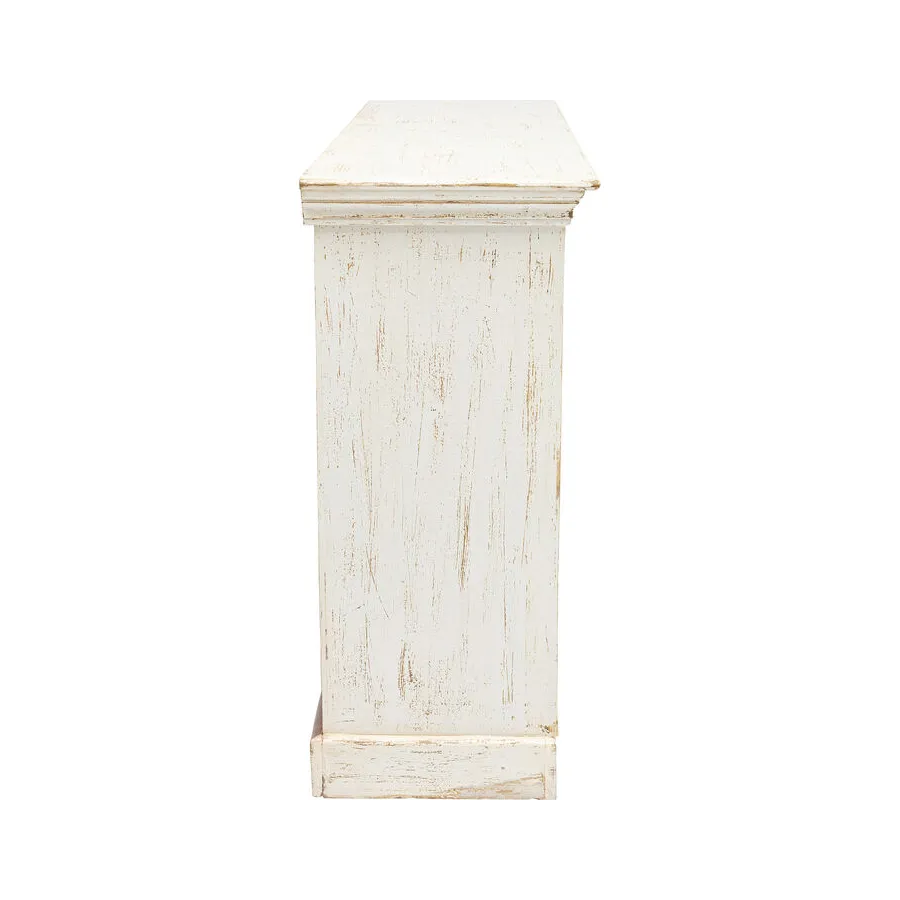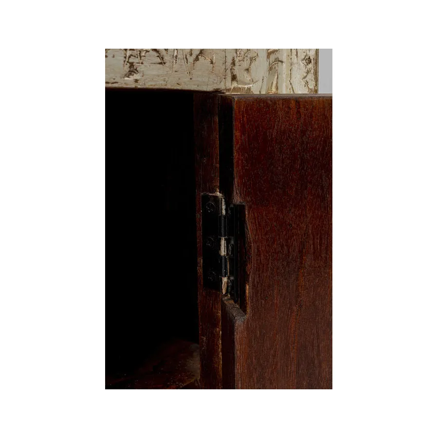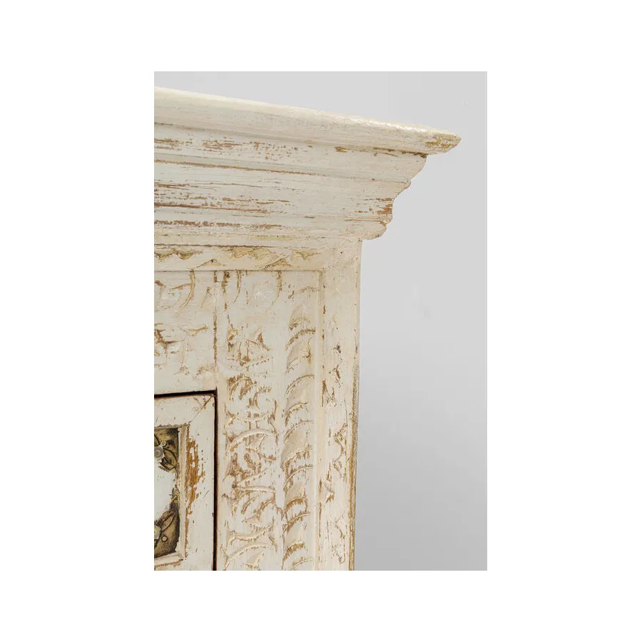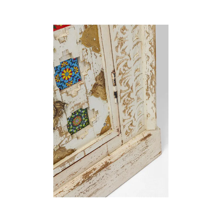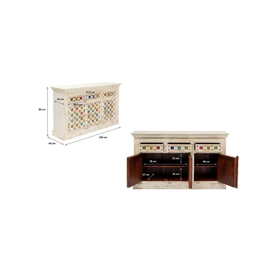Prawdziwy indywidualista, ten kredens z prawdziwego drewna w stylu antycznym z wieloma kolorowymi wzorzystymi płytkami. W szufladach i zdobionych drzwiach znajduje się dużo miejsca do przechowywania, co czyni ten kredens tak praktycznym. Przede wszystkim ten wyjątkowy mebel w stylu shabby-chic wprowadza atmosferę do pomieszczenia