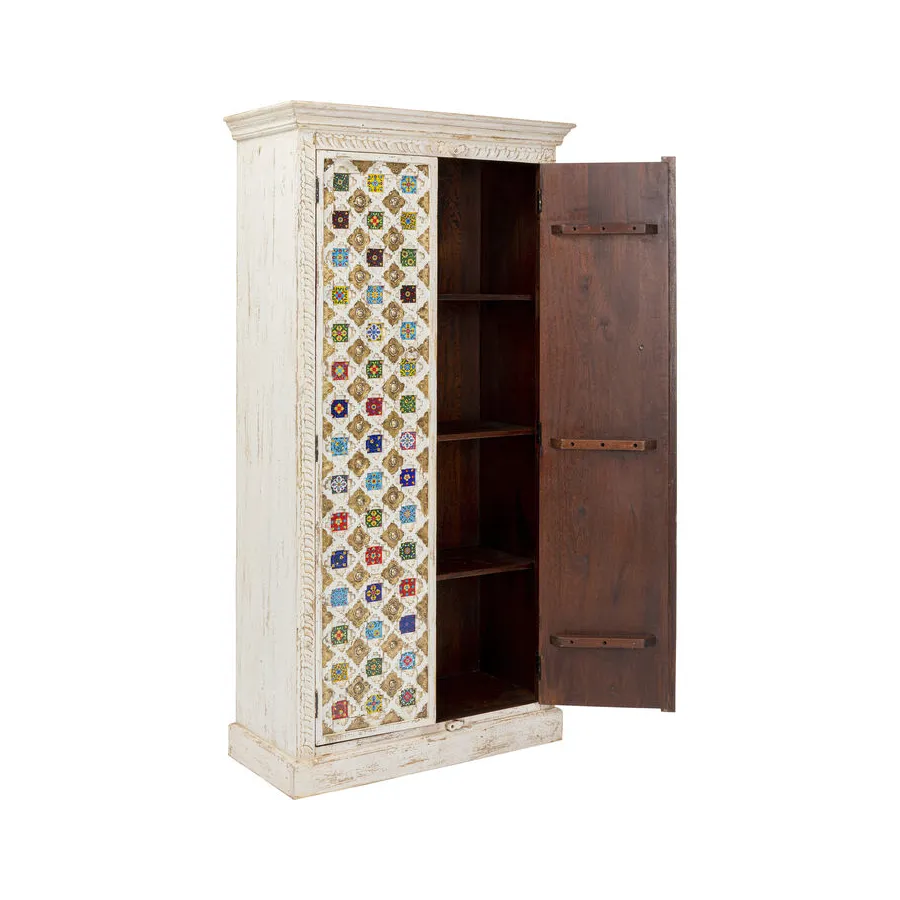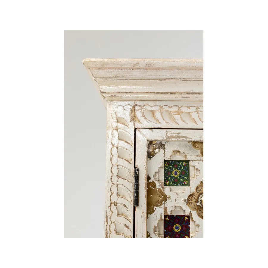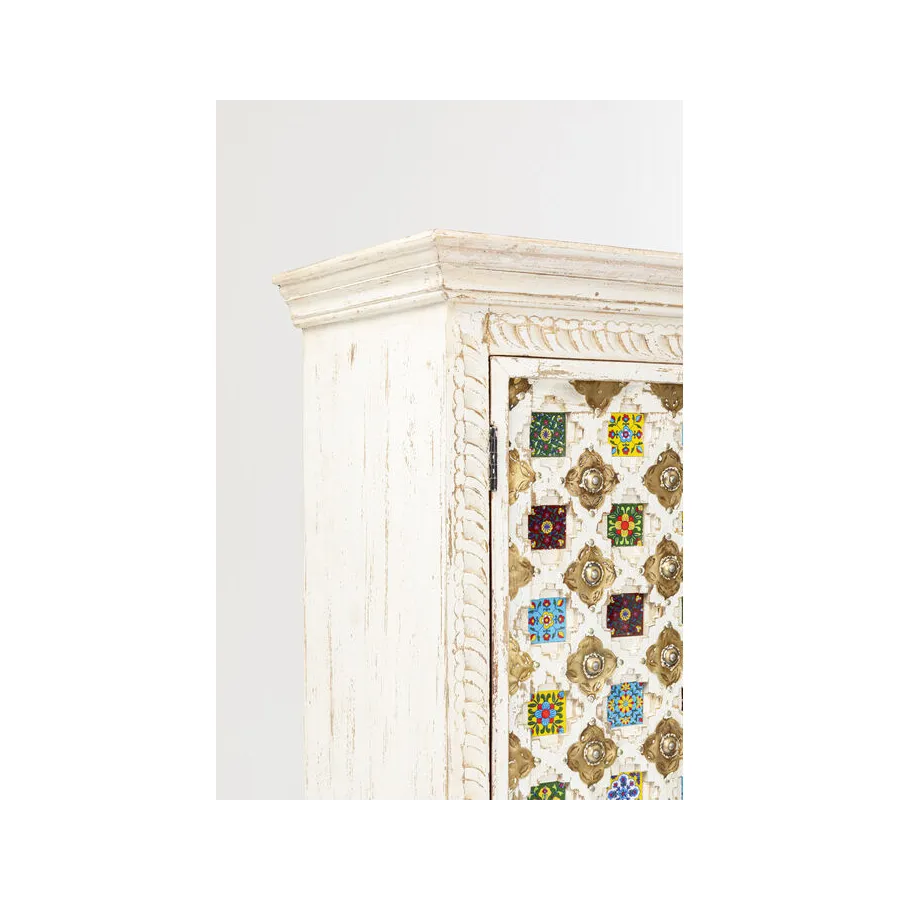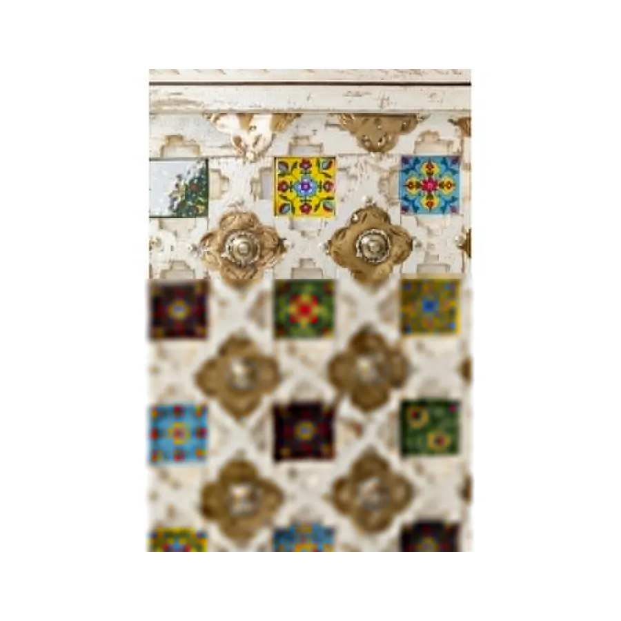 Prawdziwy indywidualista, ta szafka z prawdziwego drewna w stylu antycznym z wieloma kolorowymi wzorami płytek. Za dwojgiem dużych drzwi znajduje się mnóstwo miejsca do przechowywania, co czyni tę drewnianą szafkę tak praktyczną. Przede wszystkim ten wyjątkowy mebel w stylu shabby-chic wprowadza atmosferę do pomieszczenia