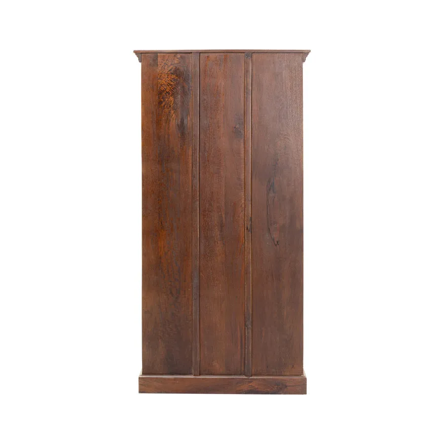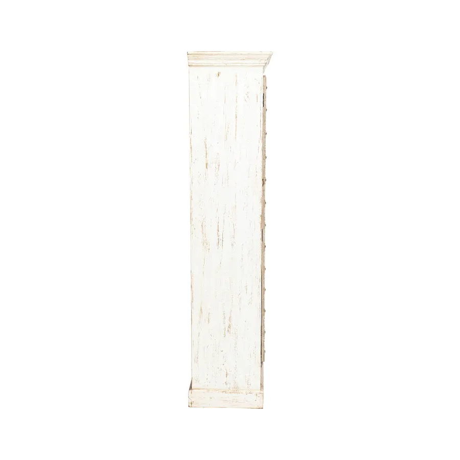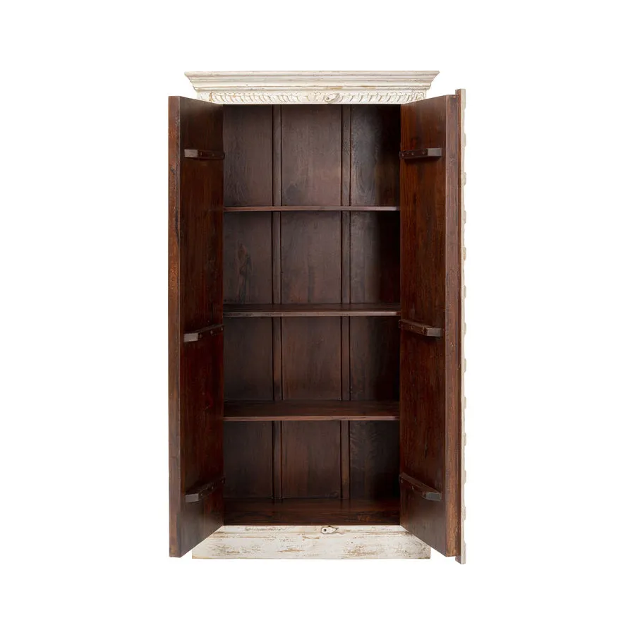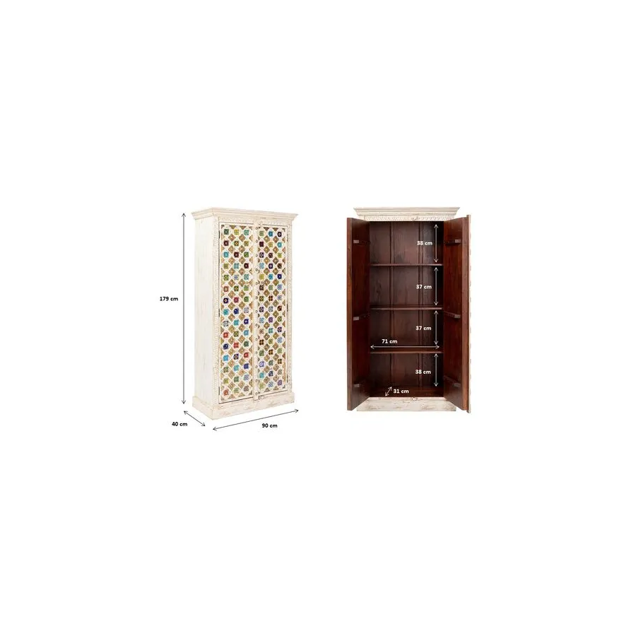 Prawdziwy indywidualista, ta szafka z prawdziwego drewna w stylu antycznym z wieloma kolorowymi wzorami płytek. Za dwojgiem dużych drzwi znajduje się mnóstwo miejsca do przechowywania, co czyni tę drewnianą szafkę tak praktyczną. Przede wszystkim ten wyjątkowy mebel w stylu shabby-chic wprowadza atmosferę do pomieszczenia