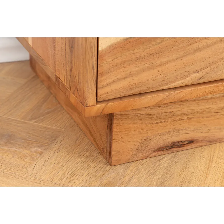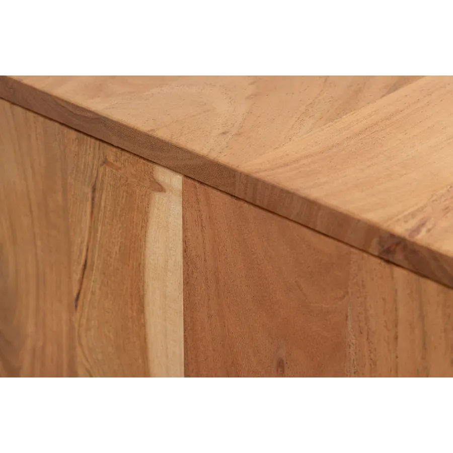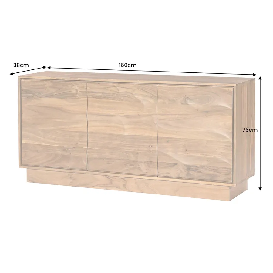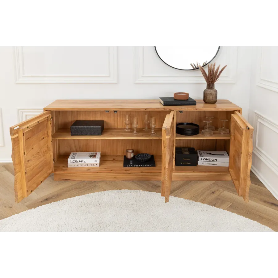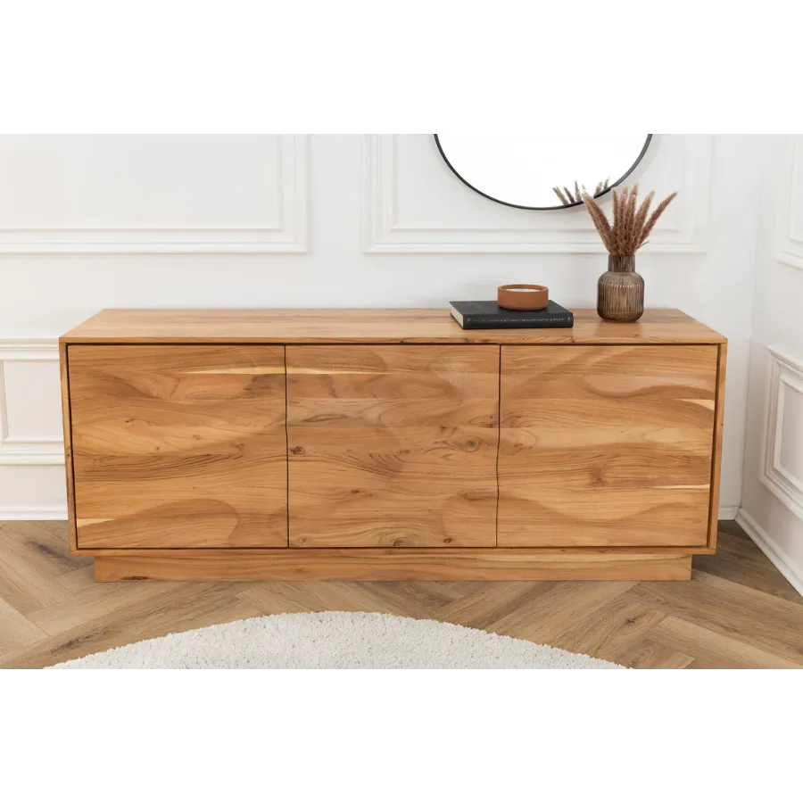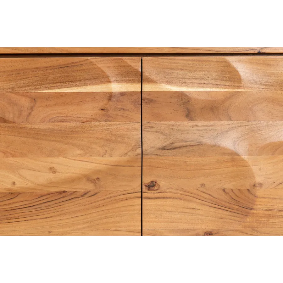 Dzięki żywemu usłojeniu i falistemu, trójwymiarowemu frontowi, kredens DESERT przywodzi na myśl falujące wydmy pustynnego krajobrazu. Wykonany z litego drewna akacjowego, wnosi ciepło, naturalność i wyjątkową fakturę do Twojej przestrzeni życiowej. Unikatowe usłojenie drewna sprawia, że każdy mebel jest wyjątkowym, jedynym w swoim rodzaju meblem z charakterem.