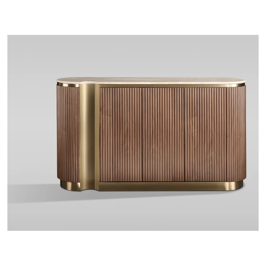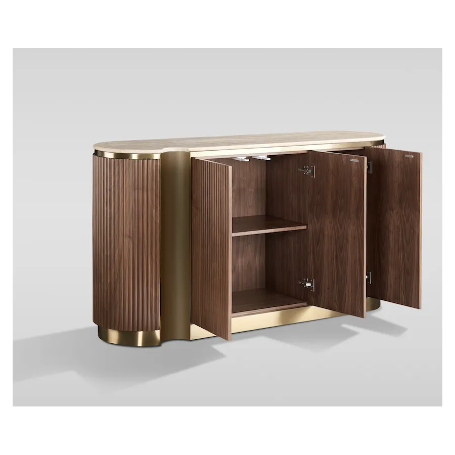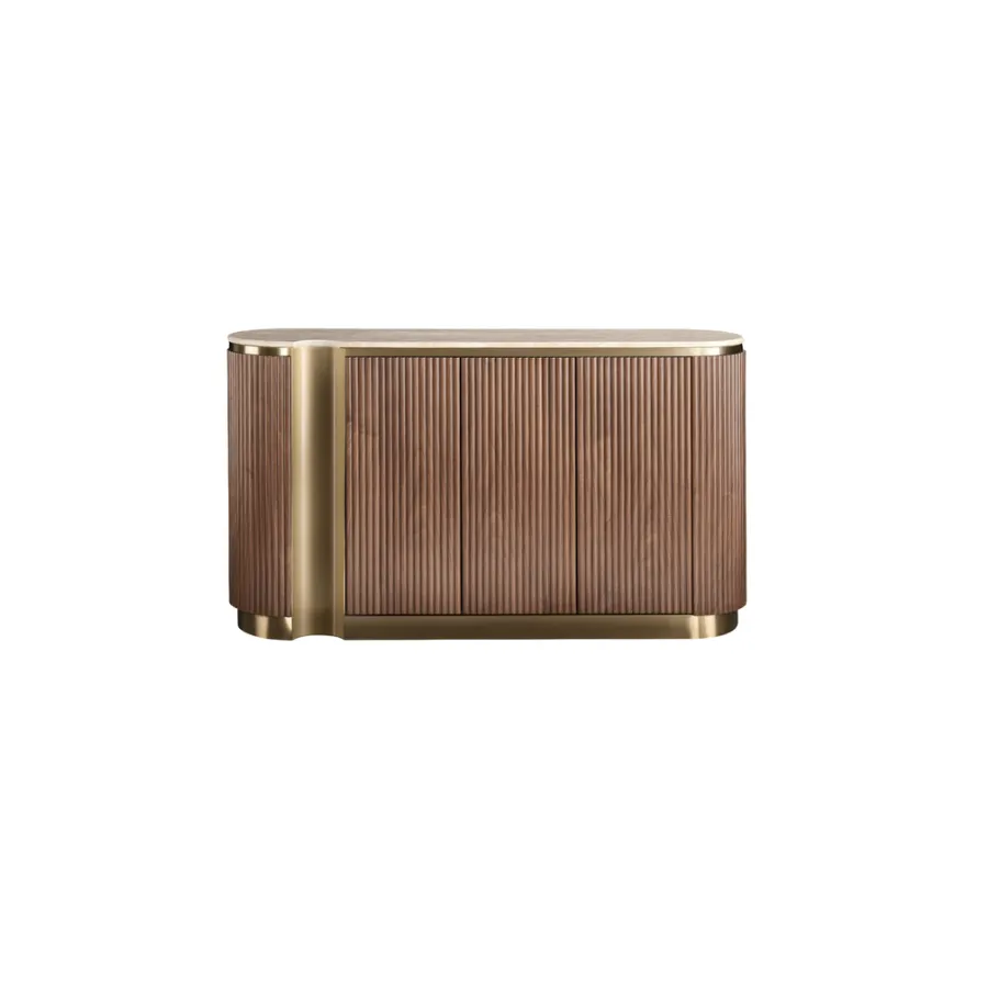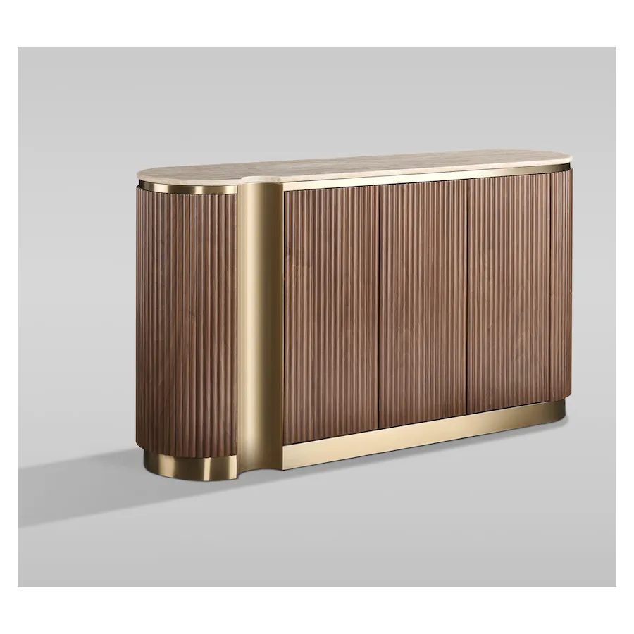 Stylowa komoda w kolorze orzecha włoskiego ze złotymi akcentami i wieńcem dolnym. Korpus posiada ryflowane drewno. Blat wykonany jest z naturalnego trawertynu.