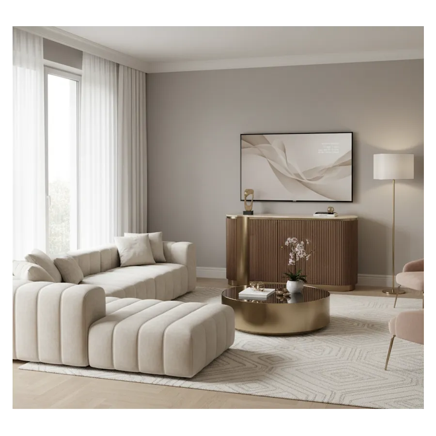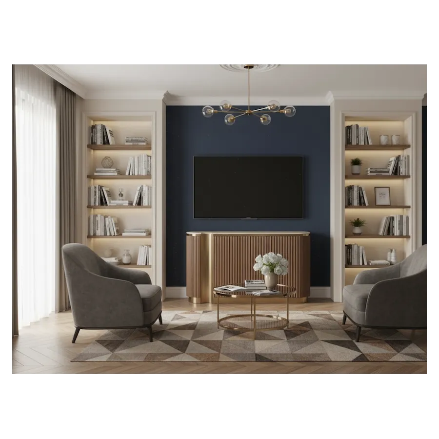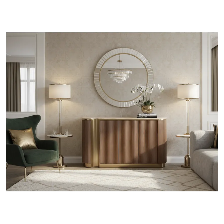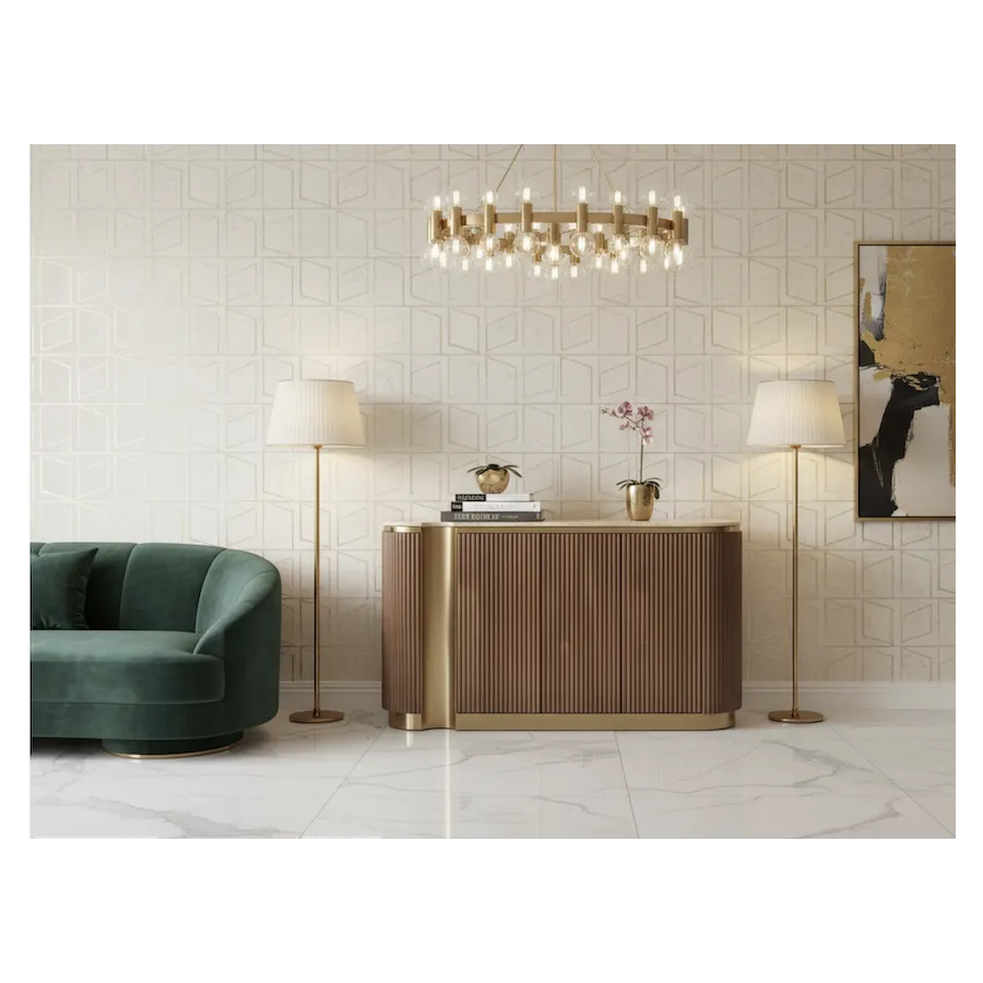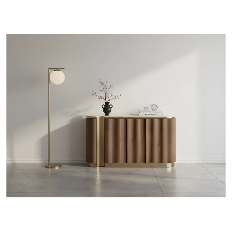 Stylowa komoda w kolorze orzecha włoskiego ze złotymi akcentami i wieńcem dolnym. Korpus posiada ryflowane drewno. Blat wykonany jest z naturalnego trawertynu.